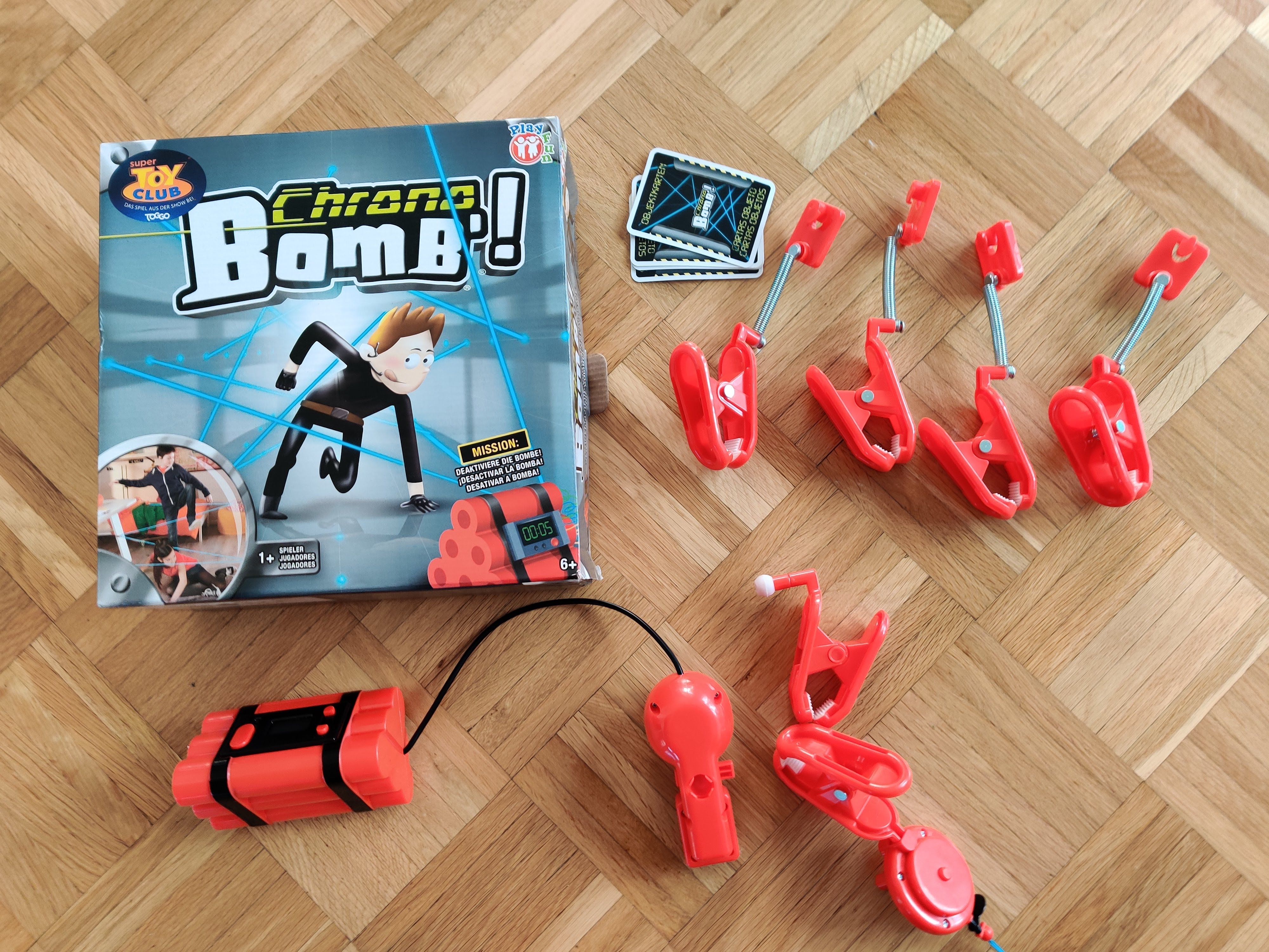Chrono Bomb und Boomball fordern vollen Körpereinsatz. Bei Chrono Bomb gilt es eine Bombe zu entschärfen, bevor der Countdown abgelaufen ist. Dafür spannt man zunächst mit einem Faden über mehrere Umlenkhaken mit Klammern einen Parcour ab. Diesen gilt es zu überwinden und dabei noch eine oder mehrere Aktionskarten aufzusammeln, bevor man die Bombe per Knopfdruck entschärft. Aber Vorsicht: Der blaue Faden registriert dank optischem Sensor kleinste Berührungen und quittiert diese mit einem Verkürzen des Countdowns oder dem sofortigen Explodieren der Bombe.