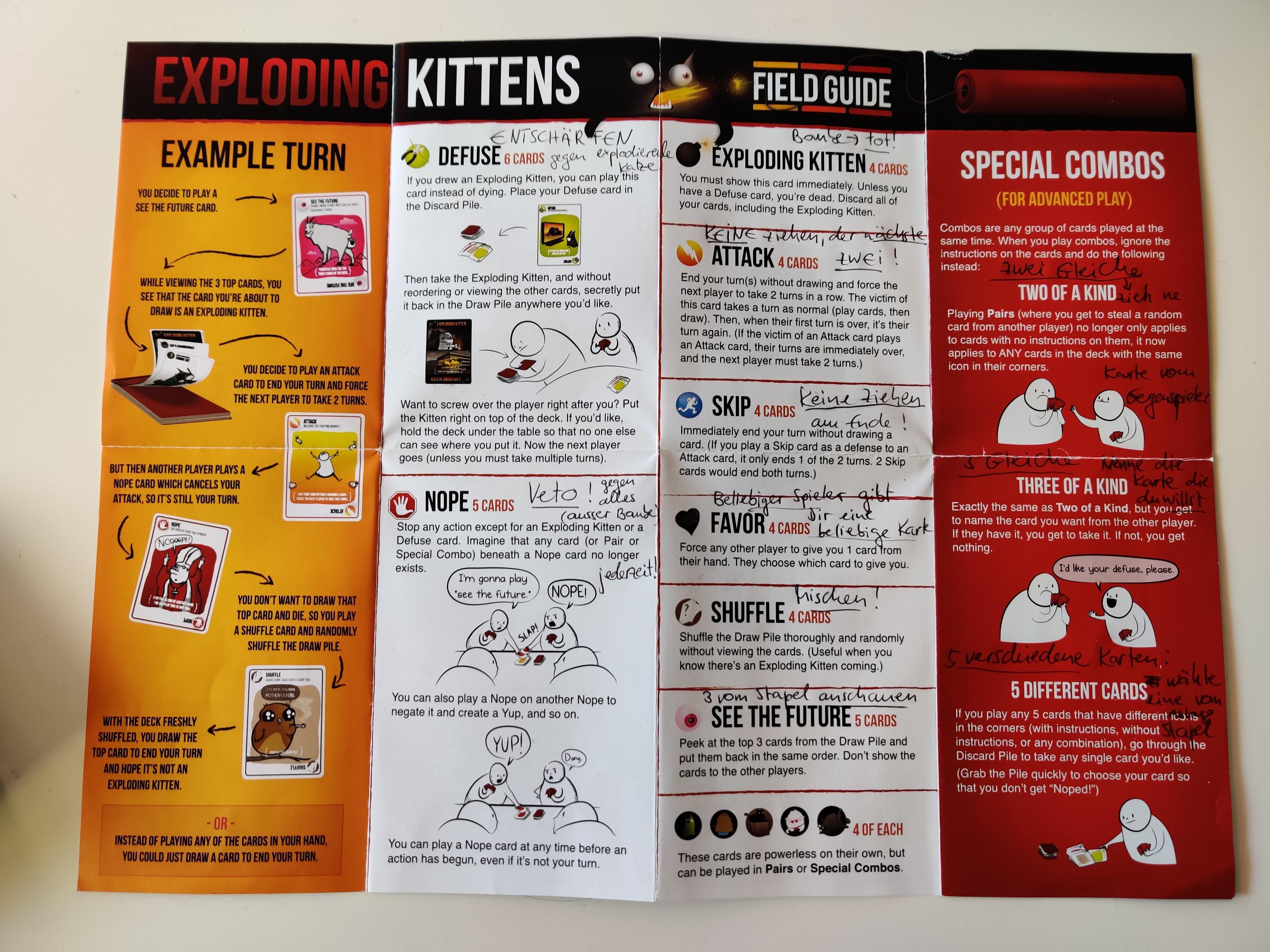 Bei Exploding Kittens hat jeder Spieler zunächst fünf Karten auf der Hand. In jedem Zug spielt man beliebig viele Aktionskarten aus und zieht zum Abschluss eine Karte von Stapel. In diesem versteckt sich immer mindestens eine explodierende Katze . Der Spieler, der diese Karte zieht, ist raus, der letzte Spieler am Tisch gewinnt. Nun gibt es verschiedene Aktionskarten, um das Ausscheiden zu verhindern. Entschärfung neutralisiert die explodierende Katzenkarte, der Spieler mischt sie schließend wieder in das Kartendeck. Wer auf Nummer sicher gehen will, schaut sich mit der Karte Blick in die Zukunft die obersten drei Karten an. Angriff setzt das eigene Ziehen aus, der nächste Spieler muss dafür doppelt ziehen. Die Nope -Karte verhindert so ziemlich jede Aktion anderer Spieler, nur explodierende Kätzchen nicht.