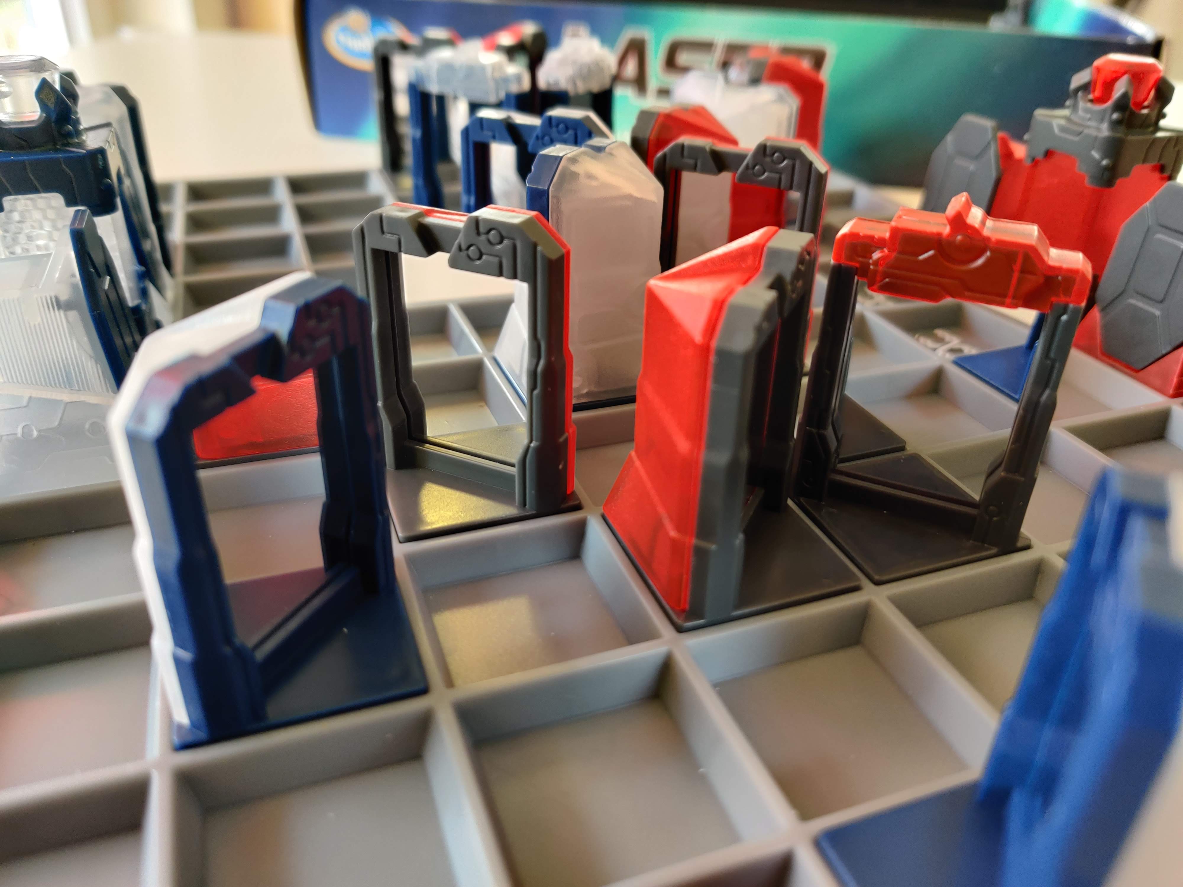 Jeder Spieler hat einen Laserturm, einen König und elf weitere Figuren, die meisten davon sind Spiegel. Diese Steine platzieren die Spieler zunächst alle auf dem Feld. Dafür nutzen sie eine von fünf Startaufstellungen aus der Anleitung. Abwechselnd ziehen die Spieler nun eigene Figuren und aktivieren anschließend ihren Laser. Trifft dieser auf eine gegnerische Figur, verlässt die das Spielfeld. Trifft der Laser den gegnerischen König, ist das Spiel vorbei.