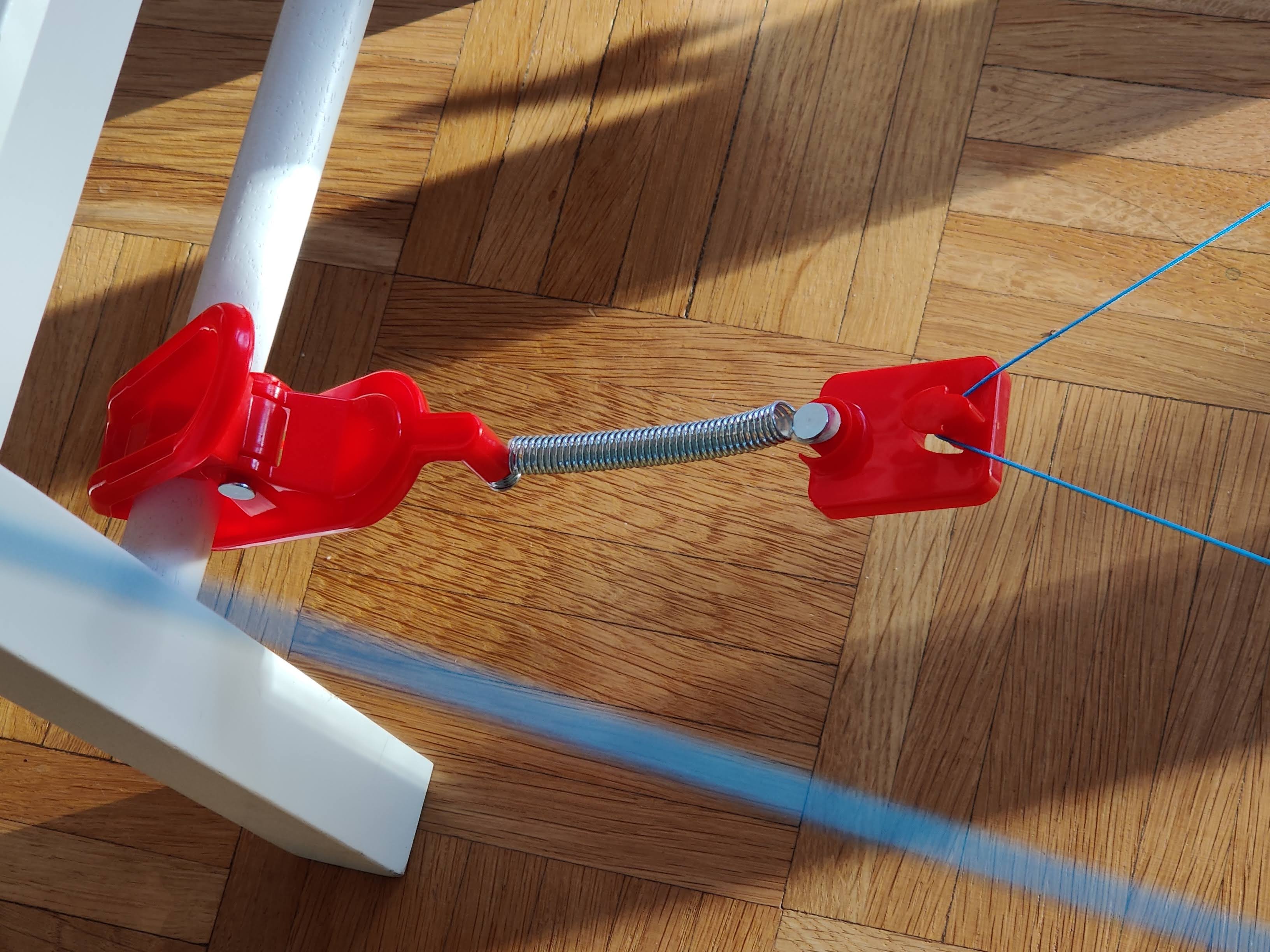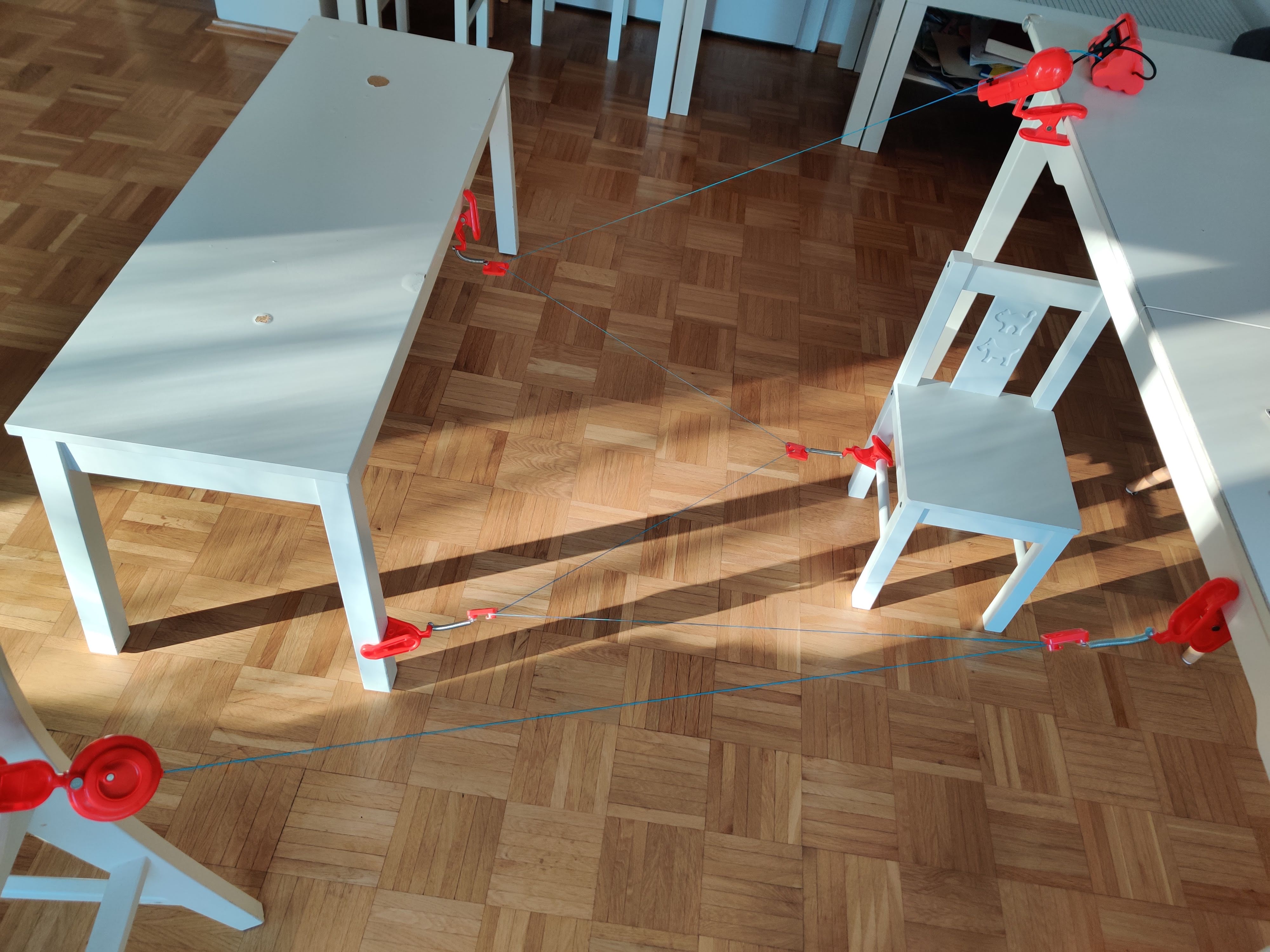 Der Aufbau gestaltet sich zunächst schwierig. Schließlich muss man geeignete Stellen finden, an denen die Klammern halten und so anschließend ein nicht zu leichter, aber auch nicht zu schwerer Parcour entsteht. Dann gilt es, den Faden über eine Kurbel zu spannen. Ist er zu locker, funktioniert der Sensor nicht richtig, ist er zu straff, geben die Klammern nach. Auch sollte man darauf achten, dass alle Spieler in etwa die gleiche Körpergröße und einen vergleichbaren Fitnesszustand mitbringen. Kontorsionisten und kleine Kinder mit Körpergefühl sind dabei klar im Vorteil.
