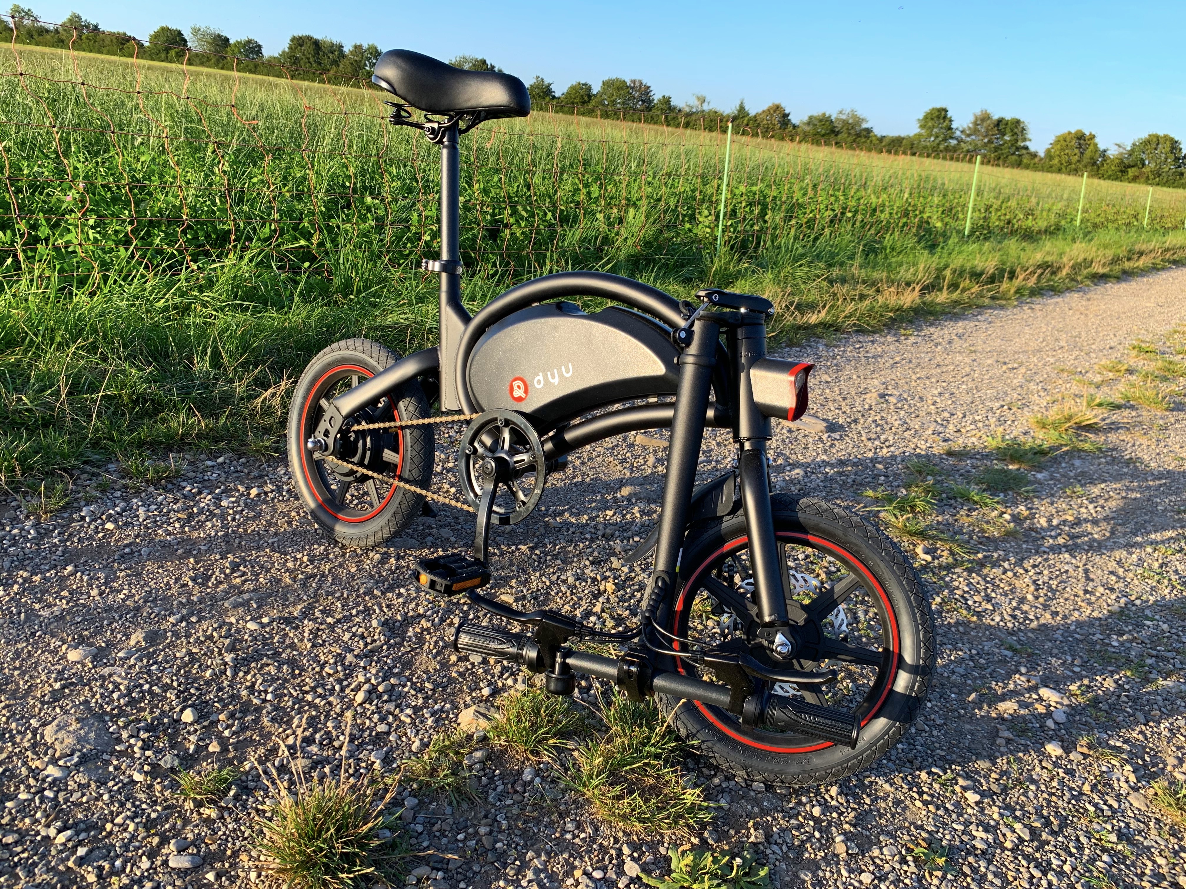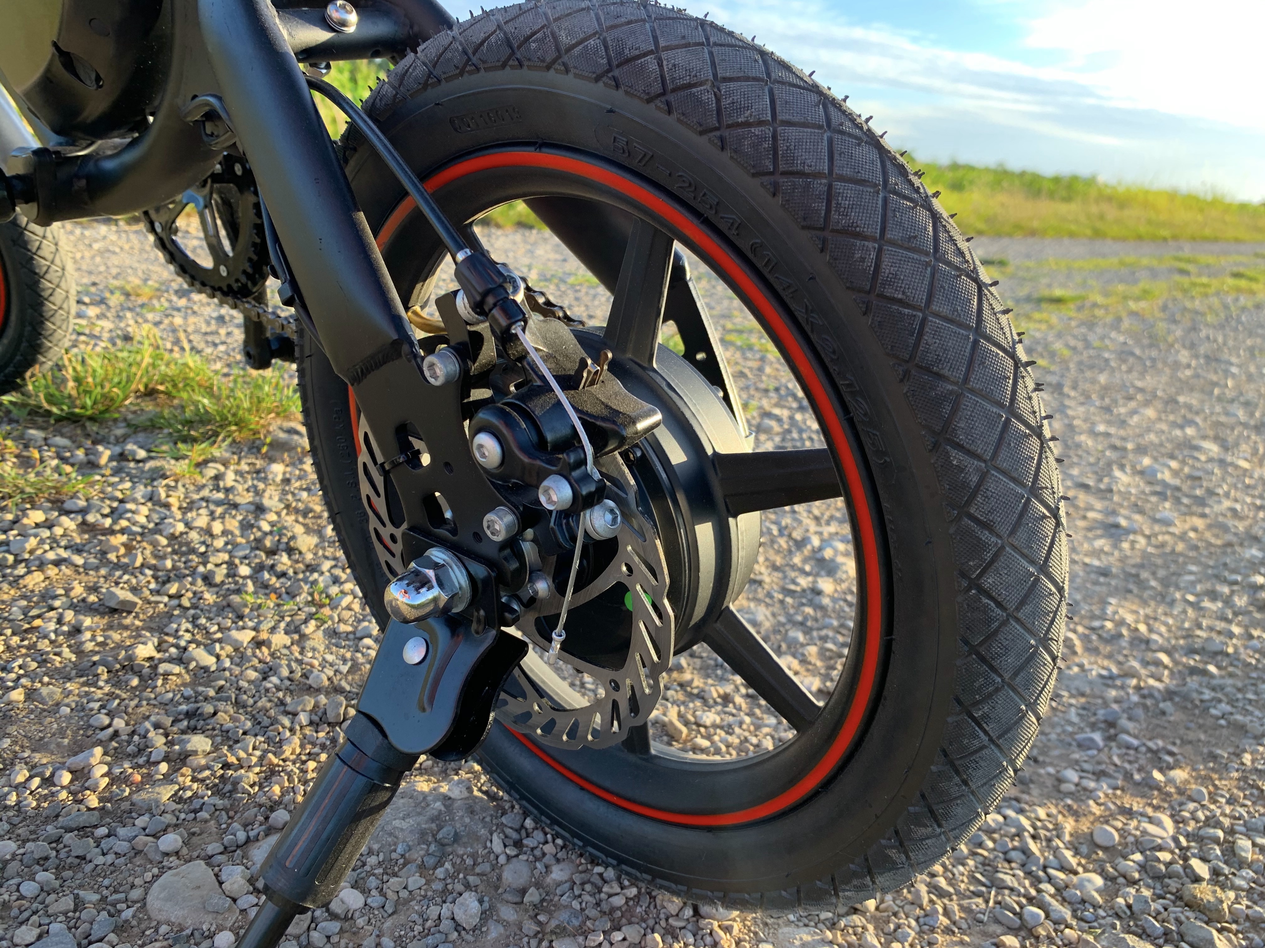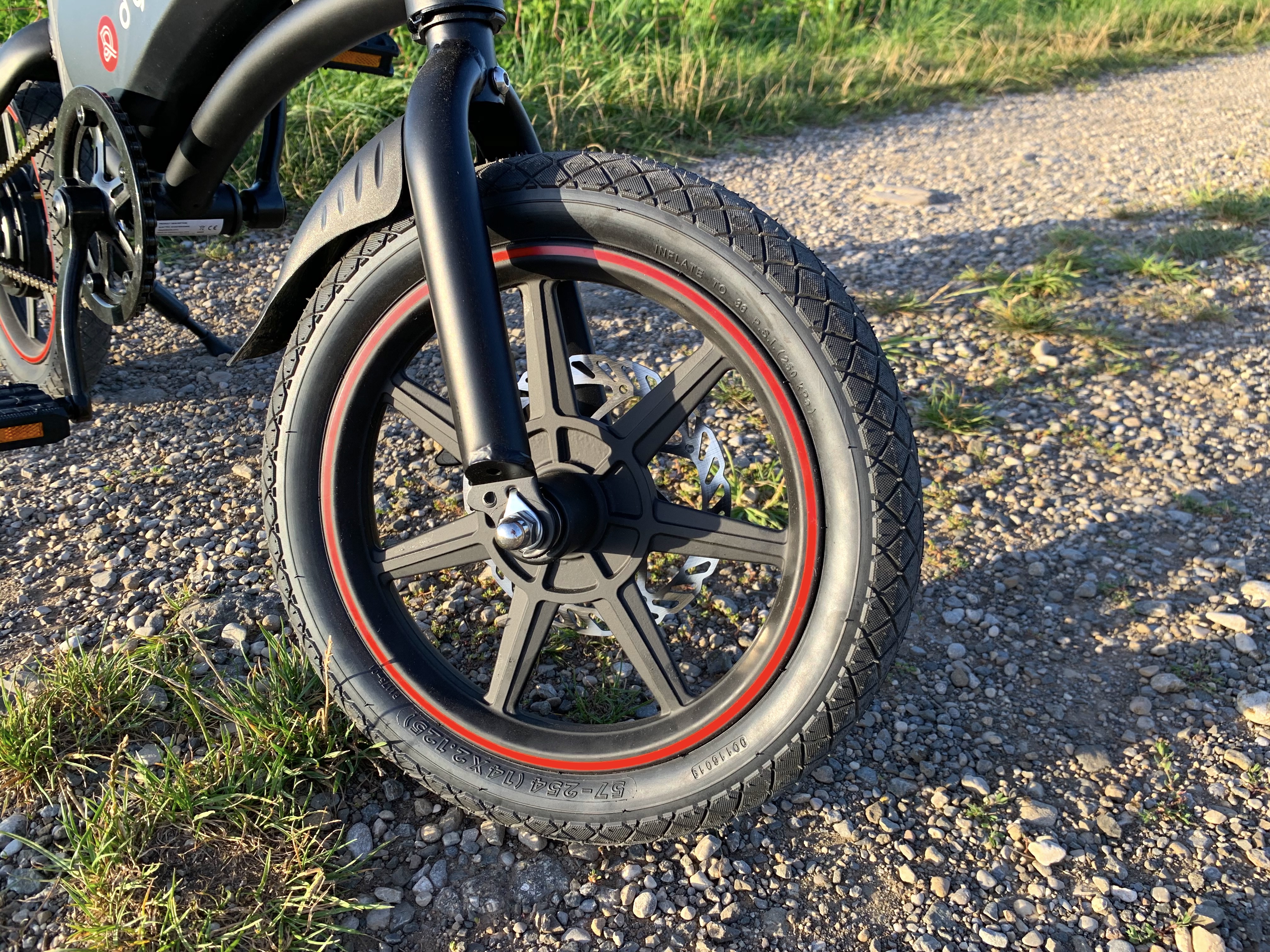 Als Faustregel gilt: Je größer die Räder, desto besser das Fahrgefühl. Schließlich schlucken größere Räder Unebenheiten, Bordsteine, Schotter und kleine Schlaglöcher einfach weg. Die Reifengröße beträgt bei den von uns getesteten elektrischen Klapprädern 14, 16 und 20 Zoll. 14 Zoll kommen beim Winzling DYU D3F zum Einsatz, 16 Zoll bei den ebenfalls sehr kompakten Brompton Electric, Fiido D2S und Xiaomi Himo Z16. Entsprechend ist das Fahrgefühl beim DYU D3F eher durchwachsen. Damit der Fahrer aufgrund der kleinen Reifen nicht zu sehr durchgeschüttelt wird, hat DYU den Sattel beim D3F gefedert. Das Brompton Electric, das Xiaomi Himo Z3F und das Fiido D2S bieten eine Hinterradfederung, dank der das Fahrgefühl insgesamt gut ist.