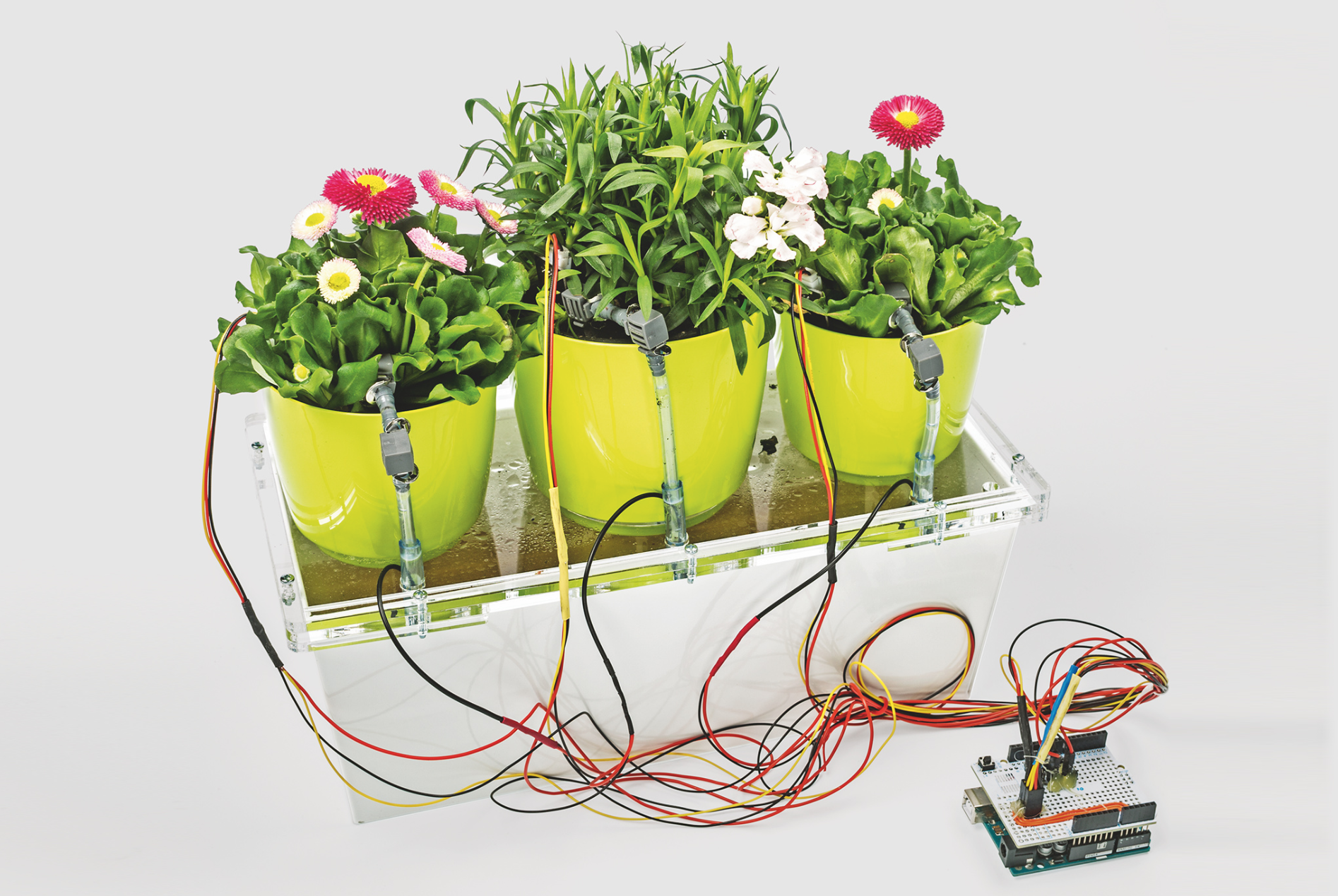 Aber was ist, wenn es regnet oder die Pflanzen schon genug Wasser haben? Für rund fünf Euro mehr baut man sich einfach einen Bewässerungsautomaten mit smarten Funktionen. Der ist dann sogar mit einem Netzteil am Strom angeschlossen. Beispielhaft haben die Kollegen des Make-Magazins (Ausgabe 02/2020) eine Variante konstruiert, die sogar im Dauerbetrieb Überschwemmungen verhindert. Der Wasservorrat befindet sich nämlich in einem Blumenkasten direkt unter den Pflanzen. Die stehen auf einer Platte, durch die alles überflüssig geförderte Wasser wieder in den Vorratsbehälter zurückfließt. Da auch bei Dauerpumpen maximal so viel Wasser in den Behälter läuft, wie abgepumpt wird, kann nichts überfließen. Das gilt auch, falls einer der Schläuche zu den Töpfen undicht wird, da sich auch die undichte Stelle stets über dem Blumenkasten und der Rücklaufmöglichkeit in der Deckelplatte befindet. Bei den kommerziellen Modellen gibt es so eine Wasserrückgewinnung nicht. Die richtige Wassermenge ermittelt die DIY-Bewässerung für jede Pflanze individuell durch Boden-Feuchtigkeitssensoren. Die komplette Bastelanleitung und Komponenten findet man auf heise online.