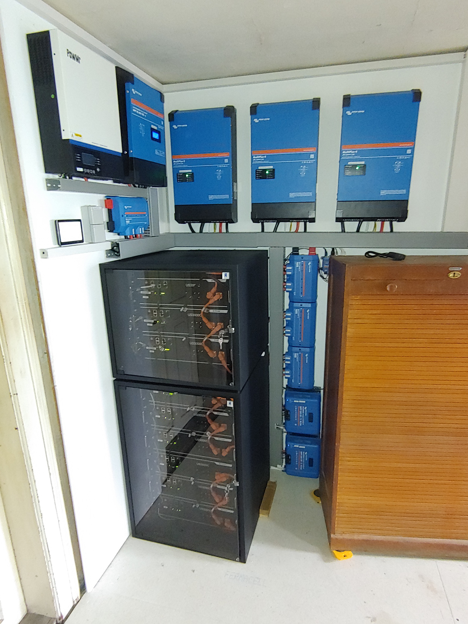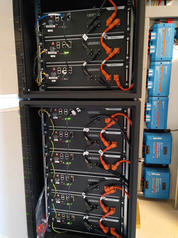 Der Strom der PV-Module wird per MPPT-Laderegler auf das Niveau der Batteriespannung von circa 52 Volt gebracht. Die Victron-Inverter wandeln den Strom, der gerade benötigt wird für Eigenverbrauch respektive Einspeisung, in Wechselstrom um, der Rest landet im Akku und wird dann entnommen und umgewandelt, wenn er gebraucht wird. Es handelt sich also um eine DC-PV-Lösung, die aus Sicht unseres Lesers in Verbindung mit einem Speicher gegenüber einer AC-PV-Anlage den Vorteil bietet, dass eine Batterieladung unabhängig vom Wechselstrom etwa bei einem Netzausfall erfolgt. Außerdem ist die Effizienz höher als bei AC-PV-Anlagen, da der Strom nur einmal umgerichtet wird. AC-PV Anlagen hingegen müssen Strom erst gleichrichten, um ihn zu speichern und beim Entladen des Speichers wiederum in Wechselstrom wandeln.