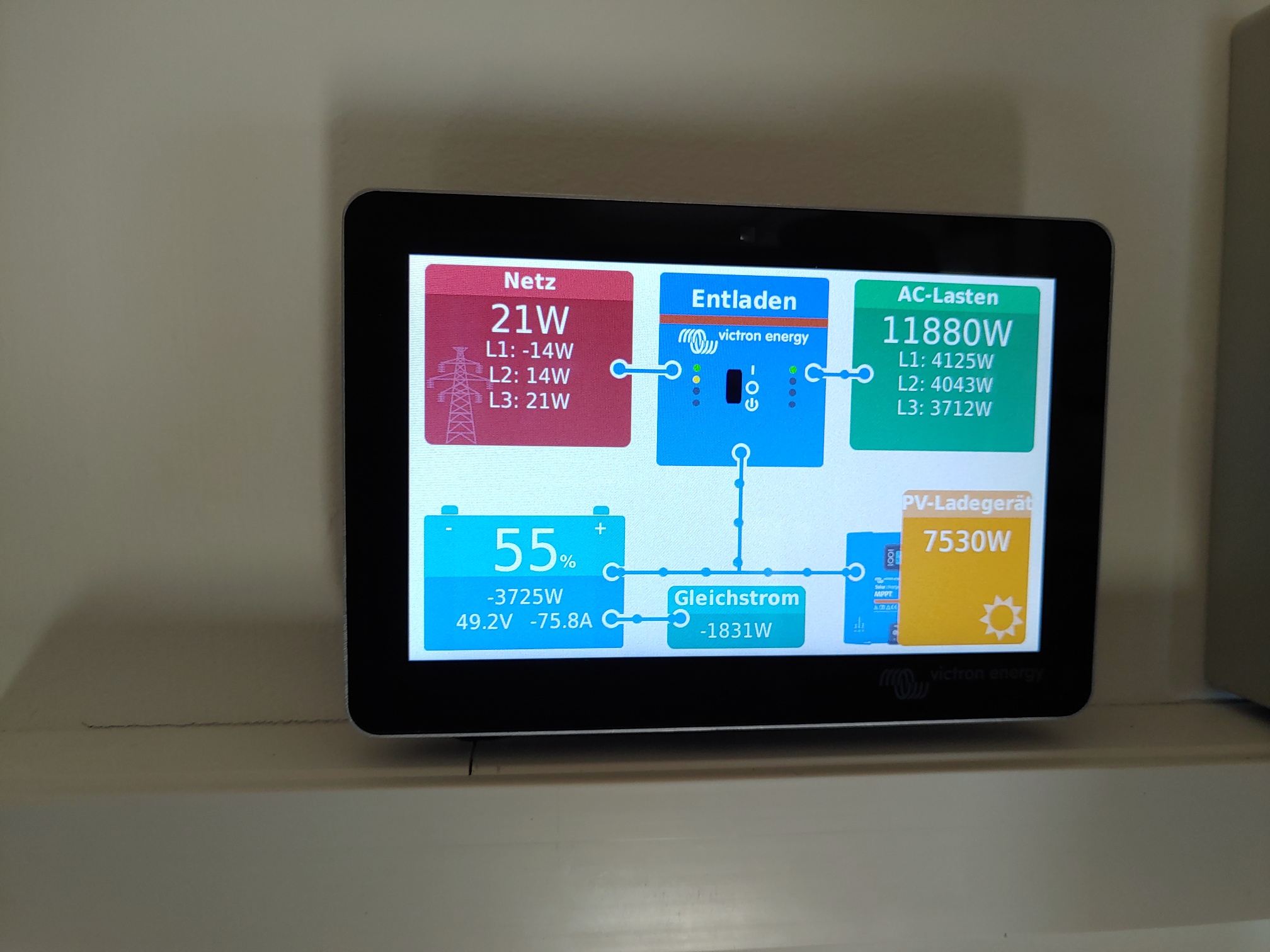 Zur IT-Absicherung komme ich also nicht drumherum, mir pro Rechner eine echte USV zusätzlich zu installieren. Die positive Seite ist die, dass ich im Falle eines Stromausfalles (bei vorhandener Akkukapazität natürlich nur) eine halbe Sekunde im Dunkeln sitze und dann alles wieder normal funktioniert. So kann ich reagieren und große Verbraucher (Herd, Backofen, Warmwasser) gegebenenfalls ausschalten und mich auf die notwendigsten Funktionen beschränken. Für Internet, Telefon, Licht, Handys und Powerbanks laden et cetera reicht eine halbe Akkuladung von gut 5 kWh schon eine ganze Weile.