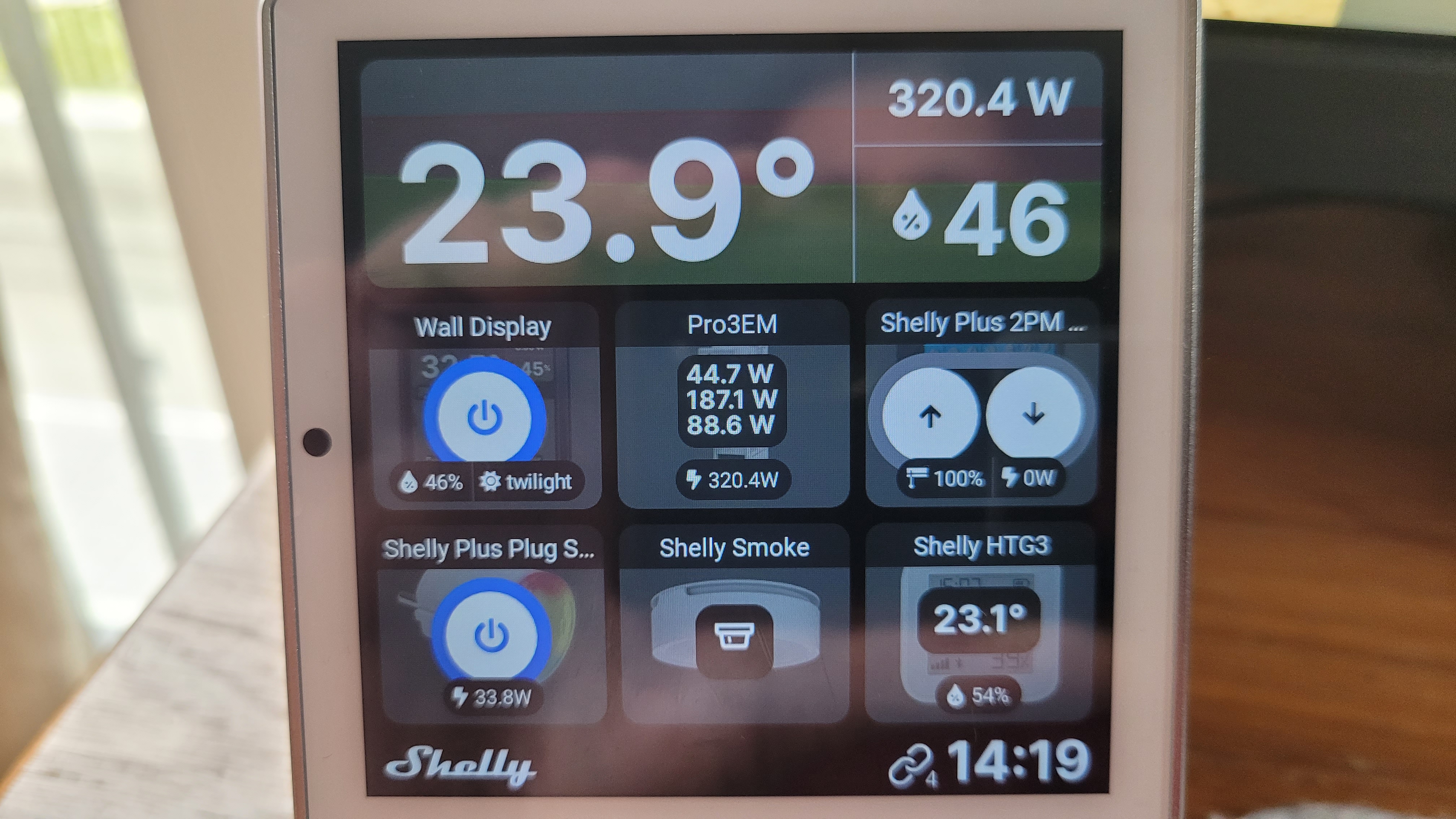 Es bietet außerdem ein 5-Ampere-Relais, das Verbraucher mit bis zu 1150 Watt unterstützt. Somit könnte man das Wall Display anstelle eines Lichtschalters montieren. Allerdings reicht die Montagehöhe der meisten Lichtschalter nicht aus, um das Display gut ablesen zu können. Wer also den Einsatz eines Shelly Wall Displays plant, sollte dies bereits bei der Bauplanung seines Hauses oder Wohnung berücksichtigen. Dann kann das Gerät auch eventuell vorhandene Rollladenschalter ersetzen. Statt Schalter für jedes einzelne Rollo zu montieren, könnte man stattdessen mit Relais wie dem Shelly Plus 2PM die Steuerung über das Wall Display erledigen. In einem Zimmer mit drei Rollläden und einer Lichtquelle könnten Anwender statt des Lichtschalters das Wall Display montieren und die drei Schalter für die Rollos durch Relais einsparen. Das sieht natürlich besser aus als eine Wand mit einer Schalter-Armada.