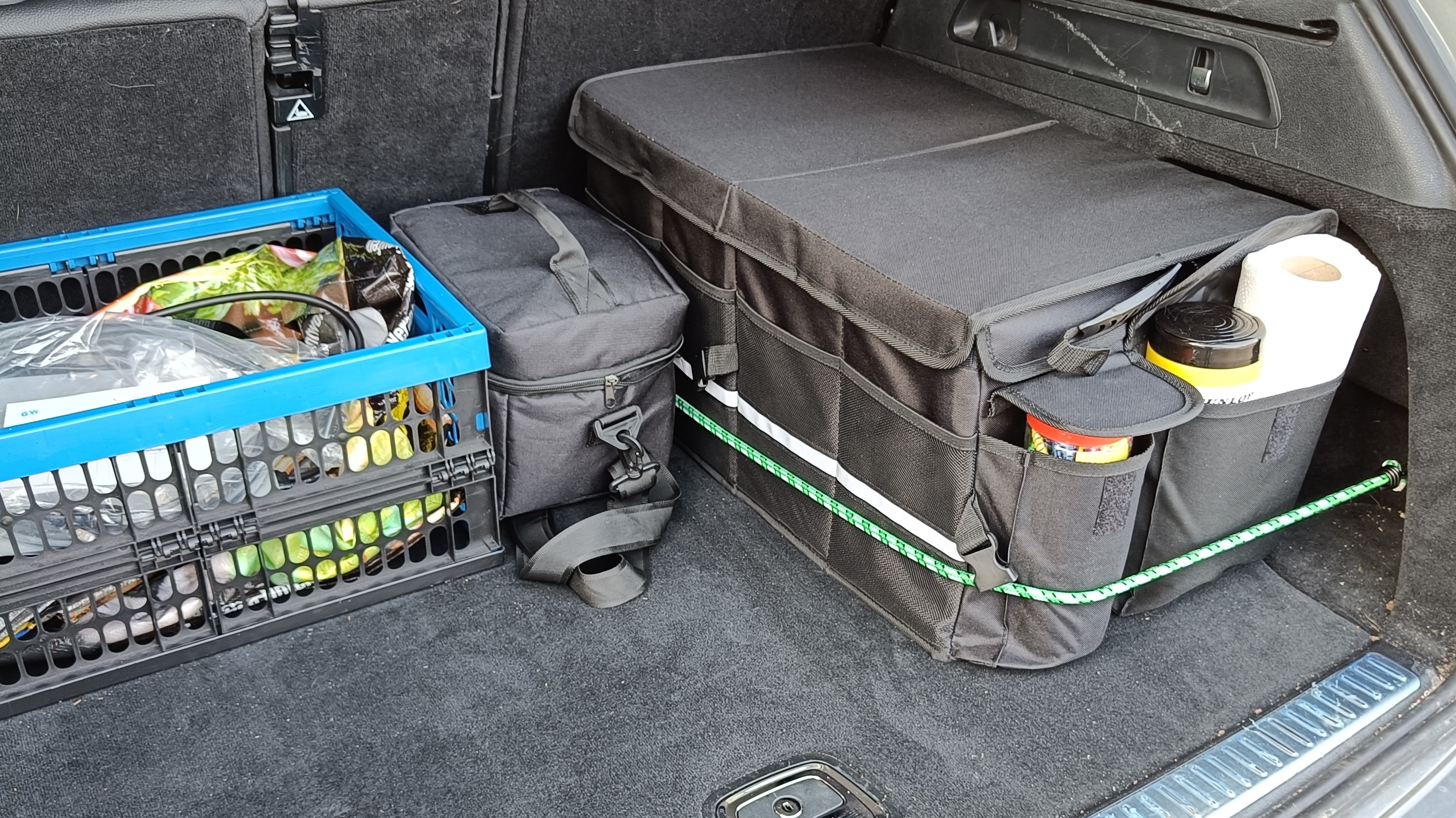 Auch für den Kofferraum gibt es zahlreiche praktische Taschen und Boxen. Los geht es mit Taschen, die an der Lehne der Rücksitze befestigt werden. Die ab 15 Euro erhältlichen Taschen sind breiter als jene für die Rücksitze und eignen sich um etwa Warndreieck, Erste-Hilfe-Box, Zurrgurte und Ähnliches aufzuräumen. Noch deutlich besser finden wir große Organizer-Boxen zum Aufstellen im Kofferraum. Diese bieten viel Platz und so können hier auch Einkäufe oder sonstige Gegenstände transportiert werden, ohne durch den Kofferraum zu rutschen. Privat haben wir uns für ein Modell mit satten 68 Litern Stauraum für 26 Euro entschieden. Das ist ordentlich verarbeitet, wasserdicht und zudem mit einer Isolationsschicht ausgestattet. So bleiben die Einkäufe auch bei sommerlichen Temperaturen frisch. Doch auch hier muss man genau hinsehen. Unsere Kofferraumtasche befestigen wir mit einem Gummigurt – das ist aber nicht immer möglich. Alternativ bieten sich Taschen mit Klettverschluss an, welche an Rücksitz und Kofferraumboden befestigt werden.