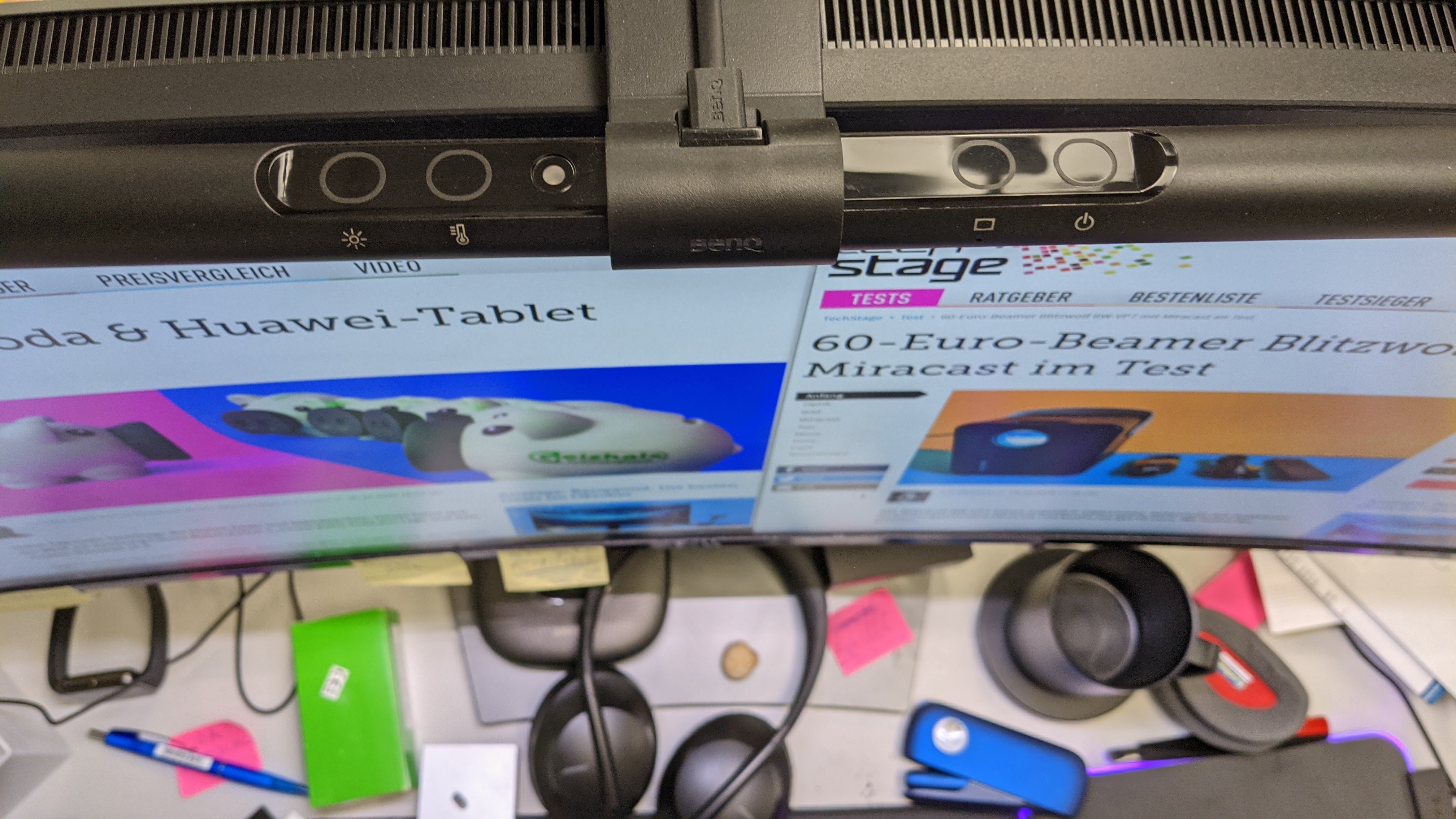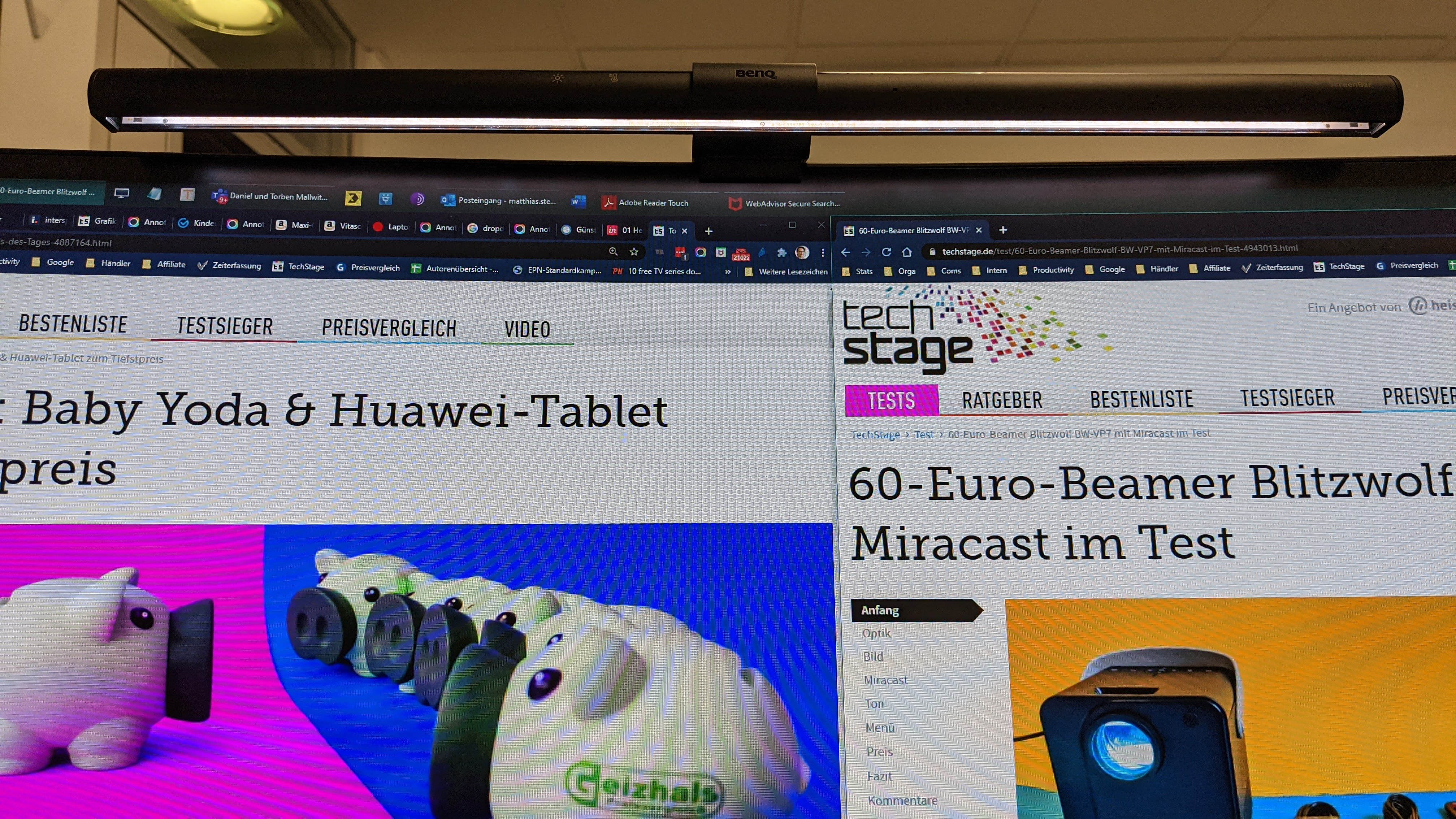 Eine vernünftige Tastatur macht nicht nur das Tippen einfacher, sie beugt auch Krankheiten wie der Sehnenscheidenentzündung vor. Das gilt auch für die Maus, gerade vertikale Eingabegeräte sind gute Alternativen für alle, die viel scrollen. Ein USB-C-Hub liefert die Anschlüsse, die man sonst am Notebook vermisst. Das Licht wird oft übersehen. Denn die meisten Arbeitsplätze sind schlicht zu dunkel. Neben klassischen Schreibtischlampen sollte man sich Screenbars (Bestenliste) ansehen. Die werden oben an den Monitor geschnallt und leuchten ohne Spiegelung. Weil wir gerade beim Thema Monitor sind, ein zusätzlicher Bildschirm liefert nicht nur mehr Platz, er lässt sich auch ergonomischer aufstellen.