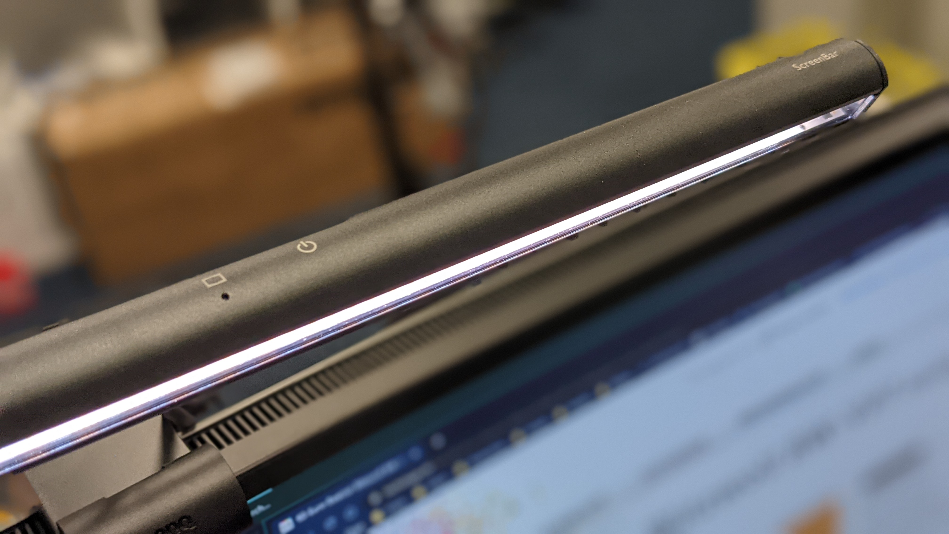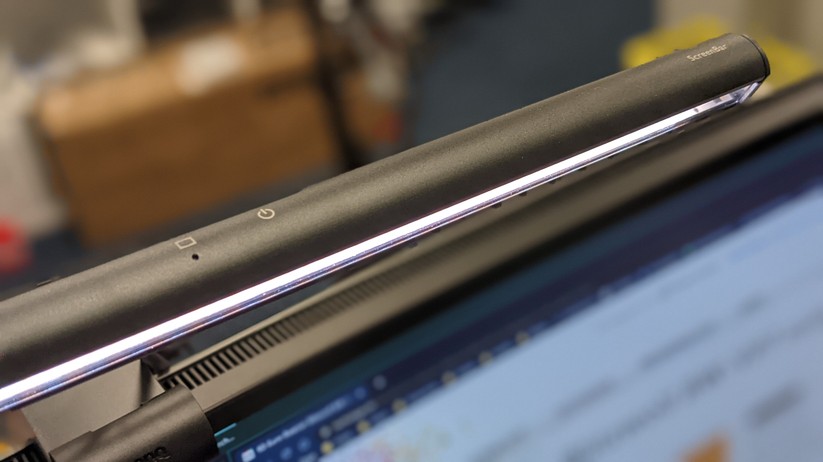 Eine weitere Alternative zur klassischen Schreibtischlampe ist die Screenbar (Top 5 Bestenliste). Sie ist ein schmaler, etwa 45 Zentimeter langer Zylinder, der über eine Aufhängung direkt am oberen ein bis drei Zentimeter dicken Rand des Monitors hängt und sein Licht am Display entlang nach unten strahlt. Ihr Licht geht etwa von 0 bis maximal 45 Grad von Displayrand in Richtung des Nutzers. So erhellt sie den wichtigsten Teil des Schreibtisches, in dem sich üblicherweise Tastatur und Maus befinden.