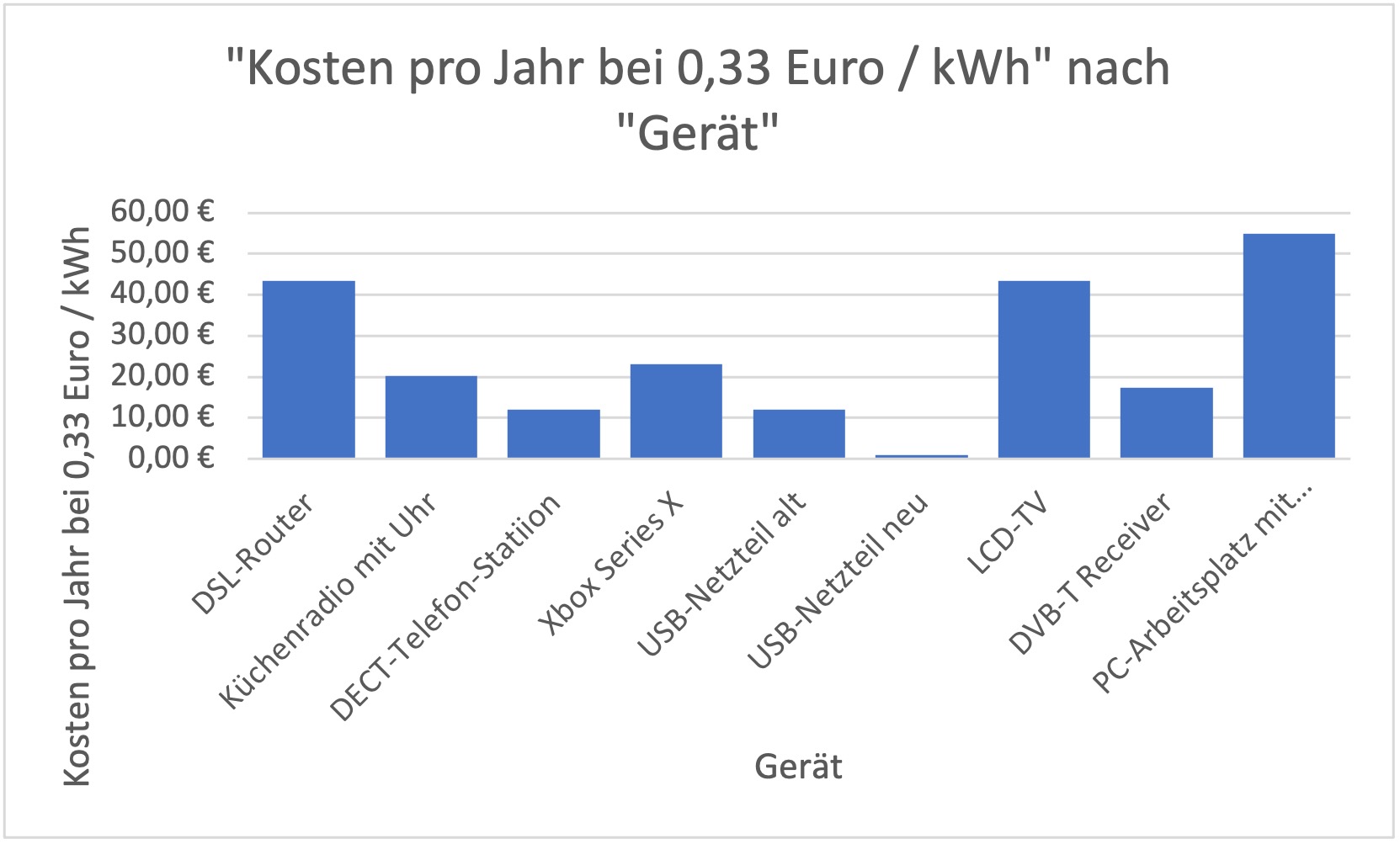 | Gerät | gemessene Leistung | Verbrauch in 24 Stunden | Verbrauch pro Jahr | Kosten pro Jahr bei 0,33 Euro / kWh |