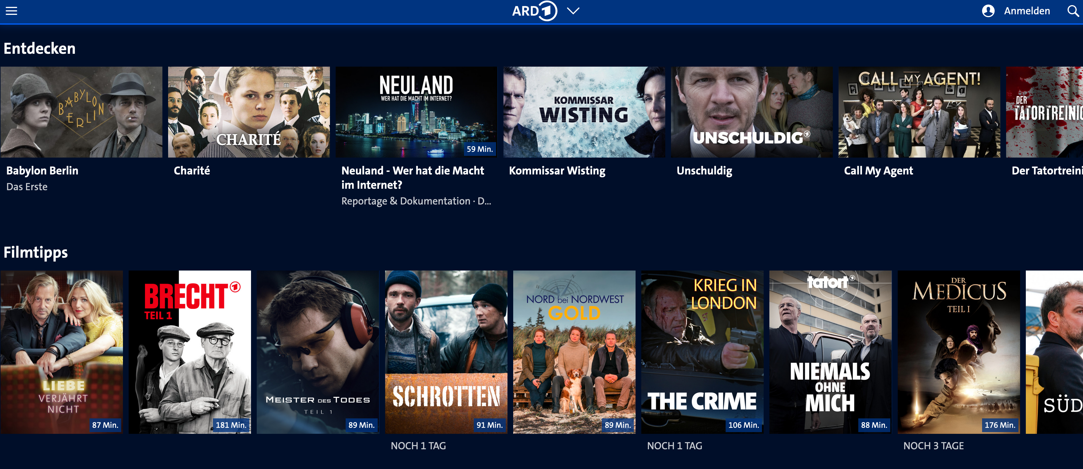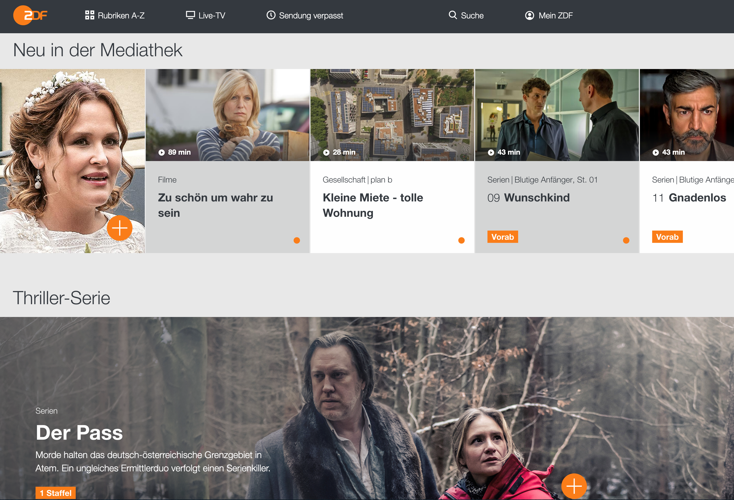 Uns persönlich gefällt die Oberfläche des ZDF mittlerweile deutlich besser. Das Ganze erinnert mehr an eine etablierte Streaming-Plattform und weniger an die herkömmliche Mediathek, also eine Sammlung von Sendungen von A bis Z. Beim ZDF gibt es bereits auf der Startseite beliebte Serien und Filme, Neuerscheinungen und Letzte-Chance-Angebote, die bald wieder verschwinden.