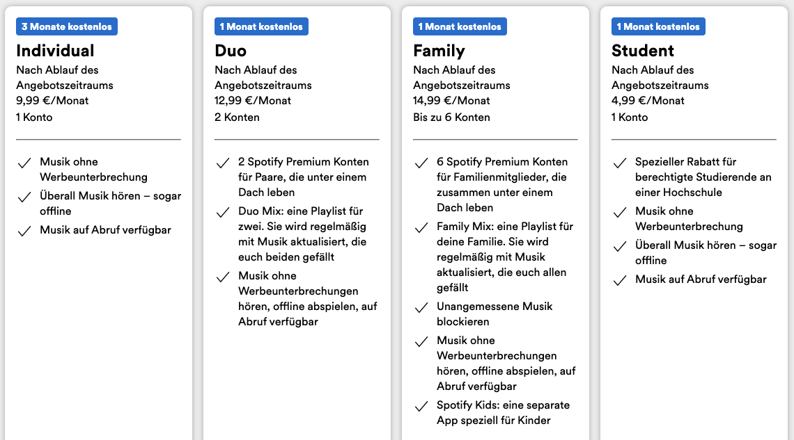 Wie Deezer oder YouTube Music ist Spotify kostenfrei. Dann gibt es allerdings Werbung und Offline-Playlisten sind nicht verfügbar. Wer das nicht möchte, bekommt Spotify Premium für drei Monate kostenfrei. Im Anschluss zahlt man monatlich 10 Euro respektive 13 Euro als Duo-Tarif für zwei Personen oder 15 Euro als Family-Account für maximal sechs Nutzer. Studenten zahlen 5 Euro pro Monat.