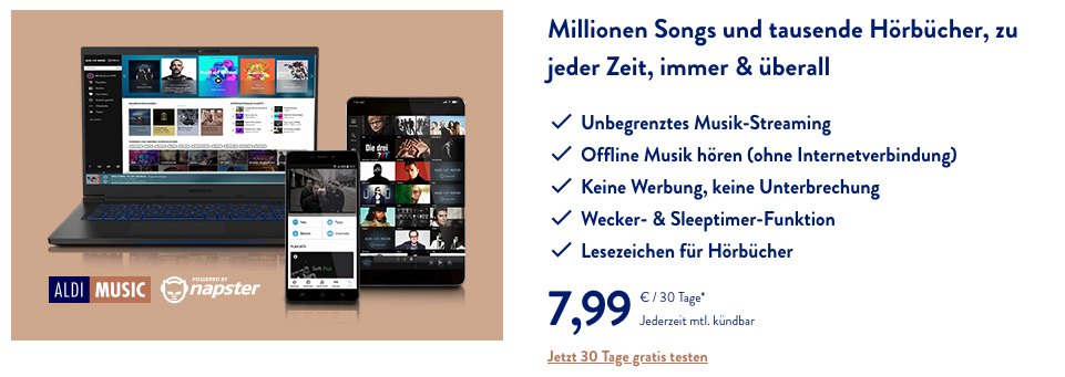 Napster bietet 60 Millionen Songs und Hörbücher. Den Dienst gibt es direkt vom Anbieter oder via Aldi Musik als Kooperationspartner. Unterschiede zwischen den Bezugsquellen gibt es vordergründig beim Preis. Bei Napster zahlt man rund 10 Euro im Monat, bei Aldi 8 Euro. Zudem ist Napster in Autos von Audi, BMW oder Mini ab den Baujahren 2013/2014 verfügbar. Das kann Aldi Musik nicht.