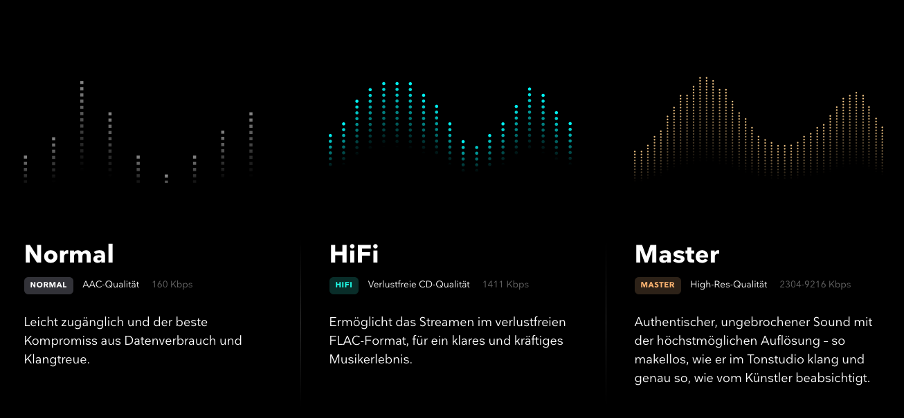 Tidal bietet mit über 100 Millionen Songs ein sehr breites Portfolio. Der Dienst richtet sich mit seinem Angebot vorrangig an audiophile Kunden. Der Zugriff auf Inhalte mit HiFi-Qualität und bis zu 1411 kbps kostet monatlich 10 Euro. Songs in Master Quality Authenticated (MGA) und Dolby Atmos mit bis zu 9216 kbps kosten 20 Euro im Monat.