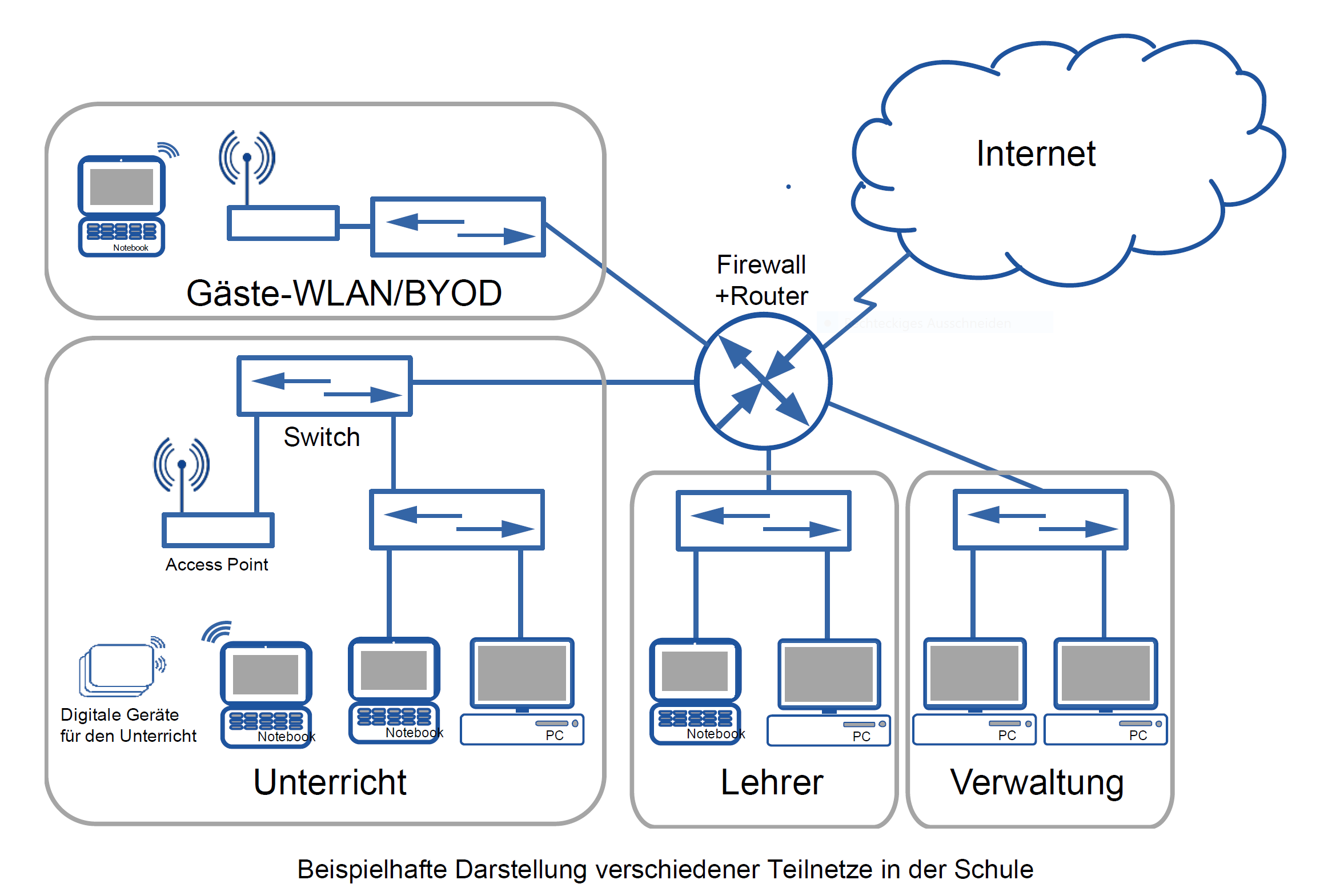 Das Landesmedien-Zentrum Baden-Württemberg gibt einen klaren Hinweis: „An baden-württembergischen Schulen soll es nach Empfehlung des Kultusministeriums immer eine dreigliedrige Netzinfrastruktur geben, wonach das Verwaltungsnetz (Schulleitung), das Lehrernetz (Arbeitsnetz für Lehrkräfte) und das pädagogische Netz (Unterrichtsnetz für Schüler/-innen und Lehrkräfte) physikalisch (über Switches/Router und Firewalls) voneinander getrennt sind. So können sensible und personenbezogenen Daten separat gespeichert und geschützt werden. Schüler/-innen dürfen sich nur über das WLAN in das pädagogische Netz einwählen.“