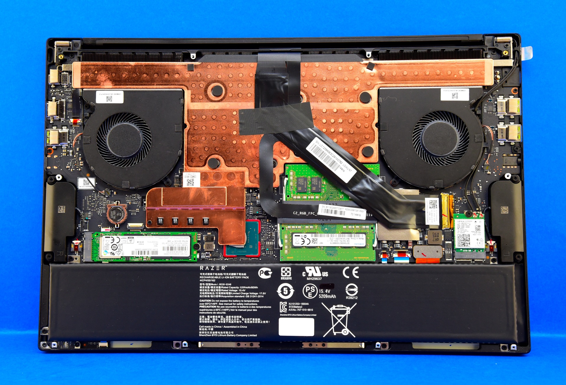 Beim Razer Blade 15 lässt sich die Bodenplatte nach dem Entfernen von 10 kleinen Torx-Schrauben (T5) sehr leicht komplett abnehmen. Darunter sind alle austauschbaren Komponenten zugänglich. Neben der Wifi-5-Karte (erkennbar durch die beiden Kabelanschlüsse), könnten wir auch die NVMe-SSD austauschen oder den Arbeitsspeicher aufrüsten.