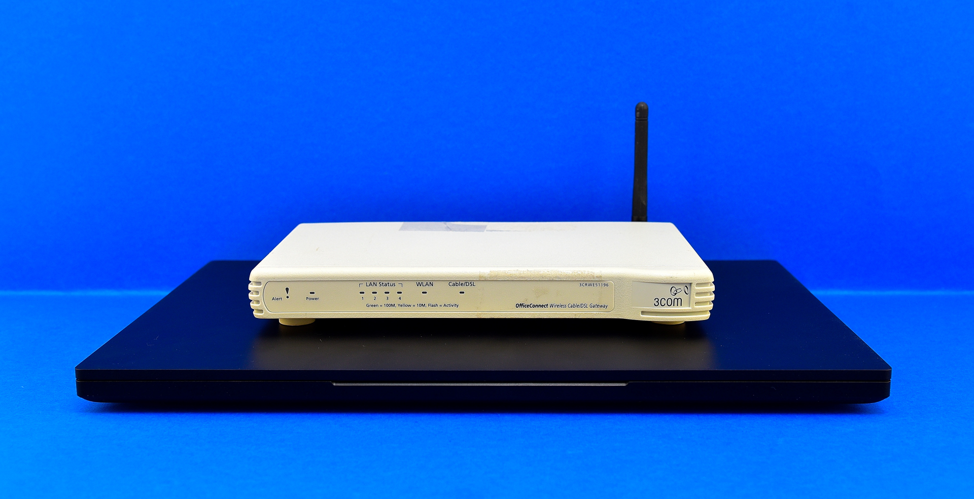Zuerst testen wir den 11b-Router 3Com OfficeConnect 3CRWE51196 vom April 2002. Er soll als Worst-Case-Szenario gelten, im Alltag wird man wahrscheinlich selten auf ein älteres Gerät treffen. Dieser Router hängt per Ethernet-LAN-Kabel an einer AVM FRITZ!Box 6591 Cable, die ihrerseits an einem Vodafone Kabel 500 Internet-Anschluss hängt. So kommt schnelles Internet in den alten 11b-Funker. Alle folgenden WLAN-Messungen fanden tagsüber in stark verschmutzter WLAN-Luft statt