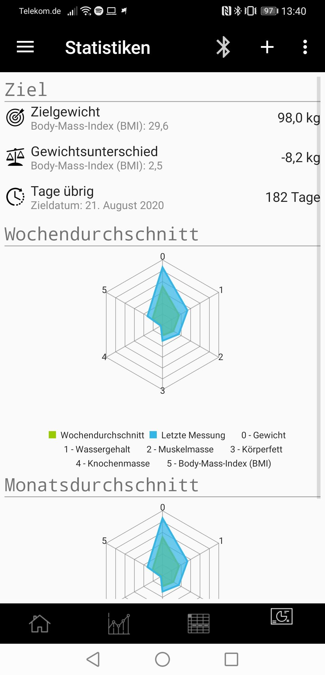 Für uns ist eine vernünftige digitale Waage ein wichtiger Bestandteil des Fitness-Arsenals. Sie kosten inzwischen nicht mehr als eine einfache Personenwaage und es ist immer wieder motivierend, die eigene Gewichtskurve verfolgen zu können. Ja, das geht auch mit einer Excel-Tabelle oder einem Notizbuch – in der App ist es aber deutlich praktischer (und man „vergisst” keine Werte).