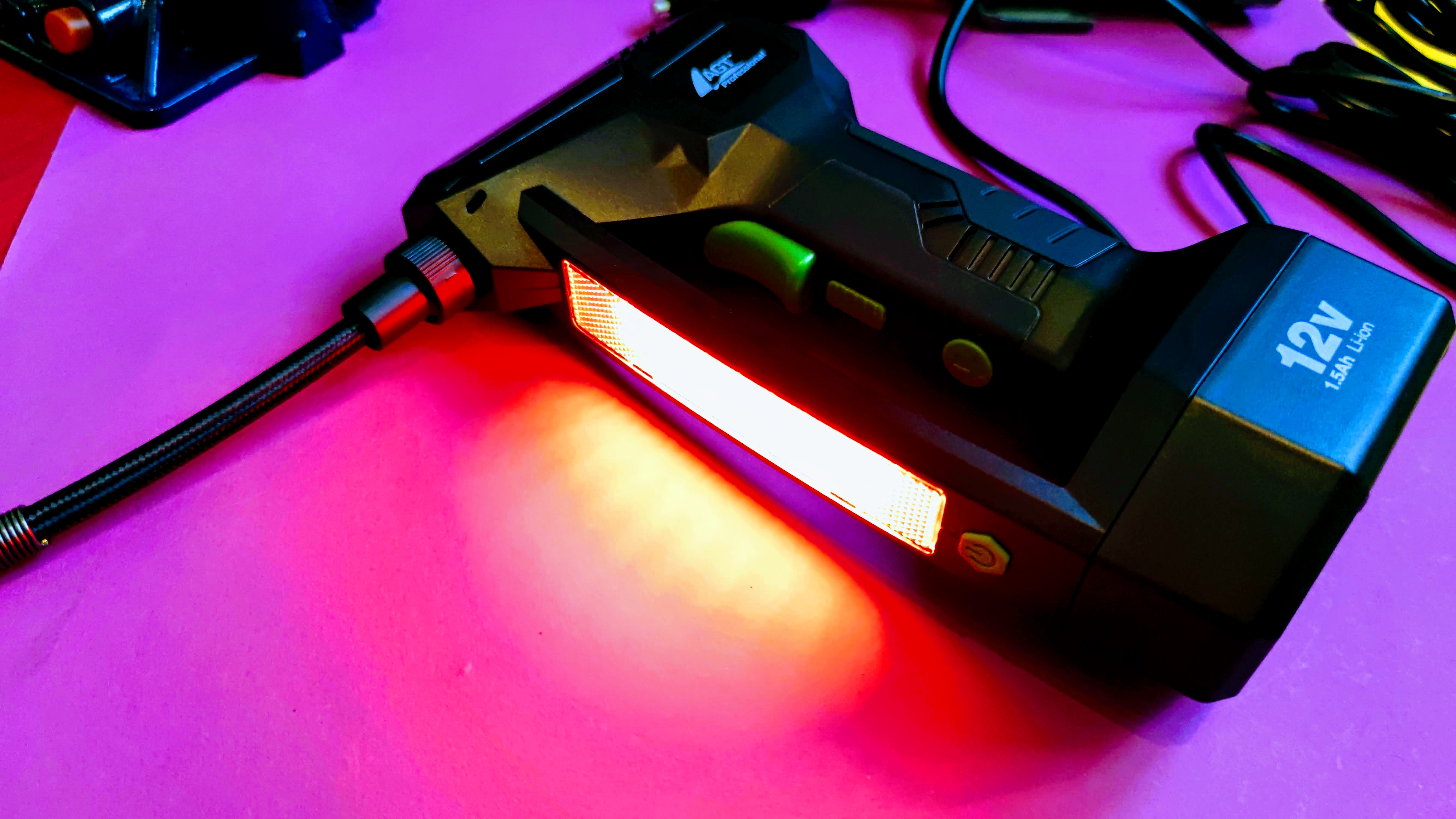Sehr praktisch ist zudem das große LED-Licht – dieses leuchtet wahlweise in Weiß oder blinkt in Rot. Das macht die Pumpe zu einer praktischen Taschenlampe bei Nacht. Zusätzlich gibt es drei austauschbare Adapter für Ventile für einen Ball, für Spielzeug sowie ein Fahrrad (Sclaverand). Als Stromquelle dient ein Lithium-Ion-Akku mit 1500 mAh, alternativ ist auch der Betrieb über den 12-V-Stecker möglich. Dafür gibt es einen Adapter mit Kabel, den man anstatt des Akkus einsetzt. Der maximale Druck liegt bei 150 psi oder 10 bar. Eine Auswahl an weiteren geeigneten Geräten zeigen wir in unserer Top 10: Die besten elektrischen Luftpumpen mit Akku für Fahrrad & Auto ab 17 Euro.