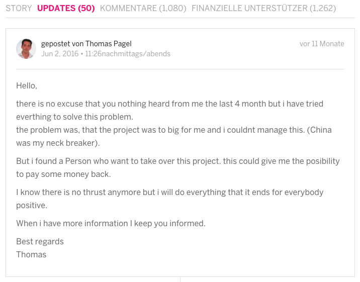 Bei einer der von mir unterstützten Kampagnen mit Totalverlust hat ein anderer Leidensgenosse das Fazit schön zusammengefasst: Überlasst das Risiko von Produktentwicklungen lieber professionellen Kapitalgebern und Banken. Kauft fertige Produkte bei Amazon, eBay & Co. und zahlt mit Paypal, statt ein paar Euros zu sparen und Totalverlust zu riskieren.