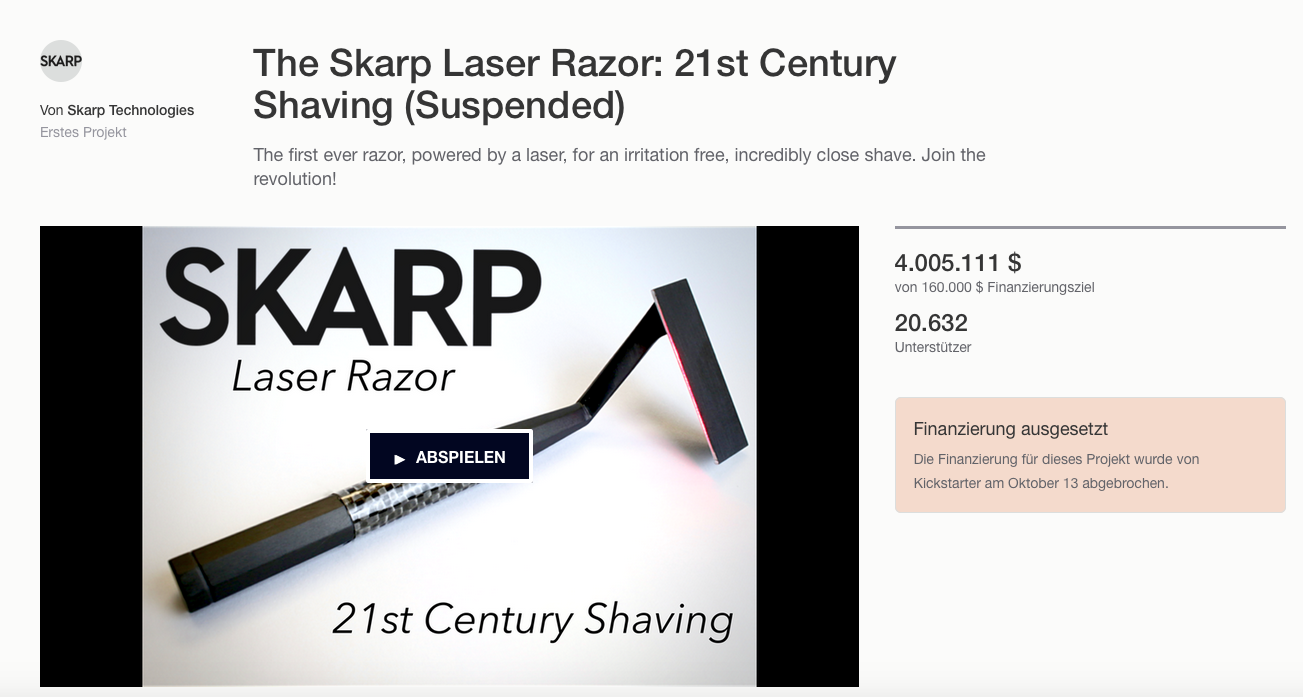 Dazu gehört die coole E-Paper-Uhr CST-01 , mehr als eine Million Dollar, etliche tausende Unterstützer – das Produkt kam nie. Und auch, wenn der Laser-Rasierer Skarp bislang noch kein eindeutiger Fail ist, sehen auch hier die Vorzeichen nicht sonderlich gut aus. Die Kampagne machte auf Kickstarter über 4 Millionen Dollar , wurde dann von Kickstarter selbst gesperrt – und lief danach auf Indiegogo, wo sie immerhin noch eine halbe Million Dollar einnahm . Die Auslieferung der ersten Rasierer hätte im Dezember erfolgen sollen, passiert ist bislang: nichts.