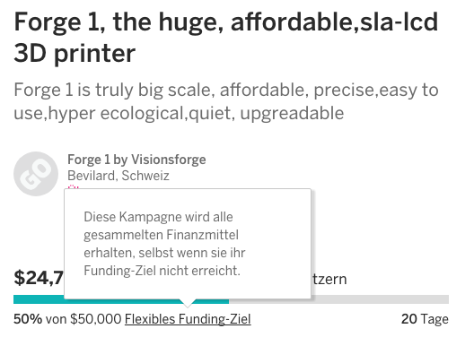 Das Angebot ist verlockend. Forge 1 heißt er, ein 3D-Drucker, der nach dem SLA-Verfahren arbeitet – also eine Kunststoff-Flüssigkeit durch Licht gezielt aushärtet. Damit sind deutlich höhere Auflösungen und schönere Ergebnisse möglich als bei den verbreiteten FDM-Druckern, die geschmolzenen Kunststoff Schicht für Schicht aufeinander auftragen. Nachteil sind die hohen Kosten für Hardware und Druckmittel sowie die kleinen Druckraumgrößen der bezahlbaren Modelle.