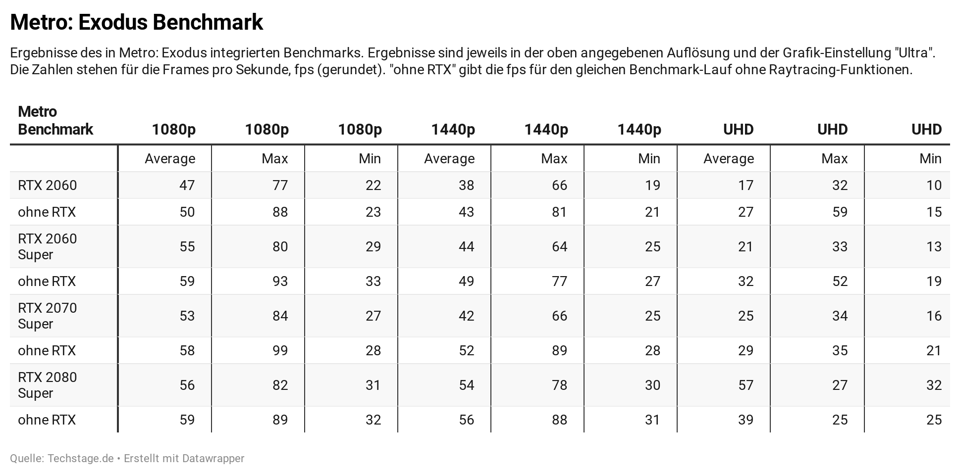 Die Leistung der Grafikkarten messen wir in Frames pro Sekunde, fps. Dieser Wert gibt an, wie viele Bilder pro Sekunde zu sehen sind. Je geringer der fps-Wert, desto eher ruckelt das Bild. Ein grober Richtwert sind 24 fps als Untergrenze, grundsätzlich sollten es aber eher Richtung 30 fps gehen. Den Metro:-Exodus-Benchmark testen wir mit der Grafikvoreinstellung „Ultra” in den Auflösungen 1920 × 1080 Pixel (1080p), 2560 × 1440 Pixel (1440p) und 3480 × 2160 Pixel (UHD).
