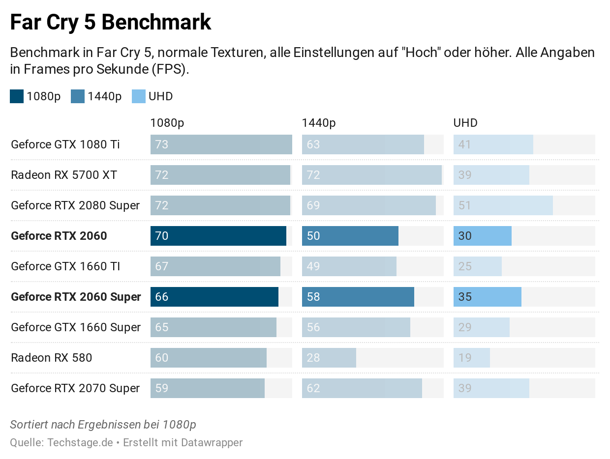 Bei den Spiele-Benchmarks sahen wir in Far Cry 5 ein sehr seltsames Verhalten: Bei 1080p lieferte die RTX 2060 in mehreren Benchmark-Läufen höhere Werte als die RTX 2060 Super. Bei anderen Auflösungen, etwa 1440p und UHD ändert sich das, hier schiebt sich die RTX 2060 Super wie erwartet vor. Da sich dieser Effekt über mehrere Grafikkarten mit RTX 2060 Super-GPU zieht, gehen wir hier eher von einem seltsamen Verhalten im Benchmark aus.