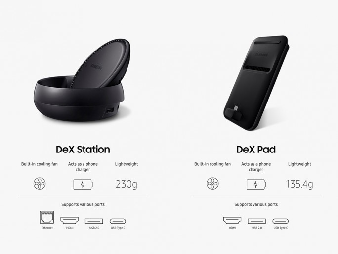 Die DeX-Produkte schließen das Samsung Galaxy Note 9, Galaxy S8, Galaxy S8+ oder Galaxy S9 sowie Galaxy S9+ an einen Monitor mit bis zu WQHD-Auflösung nativ an. So bildet es die Basis für einen Desktop-Arbeitsplatz. Dafür hat Samsung den Desktop-Betriebsmodus Experience 9.0 ins Leben gerufen, über den sich auch Spiele im Vollbildmodus starten lassen.