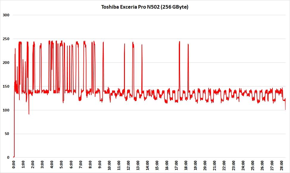 Sämtliche Dauerschreibtests laufen allerdings mehrfach pro Speichermedium: Während des ersten Durchlaufs arbeitete auch die Exceria Pro N502 mit maximaler Leistung, ab dem zweiten Durchlauf brach sie zur Hälfte des Kopiervorgangs ein und ein dritter, vollständiger Schreibvorgang förderte die dargestellte Verlaufskurve zutage. Da der zuvor gezeigte Kopiertest mit einer 25-GByte-Datei erst nach dem Dauerschreibtests durchgeführt wurde, zeigt sich das Verhalten auch dort und wäre ansonsten gar nicht aufgefallen. Trotz der Verwendung von drei unterschiedlichen Testsystemen und zwei Testmustern trat der Leistungseinbruch immer wieder auf. Internen Tests von Toshiba zufolge konnte das Verhalten allerdings nicht nachgestellt werden.