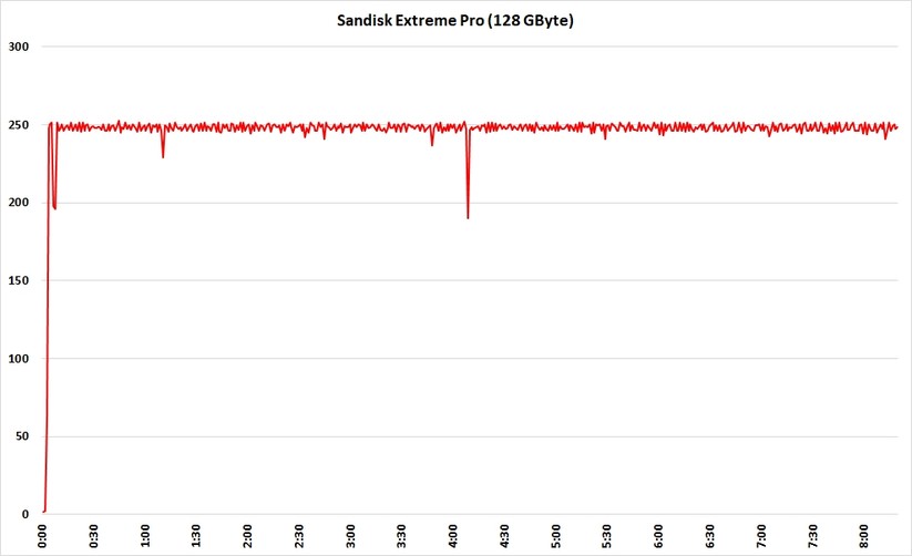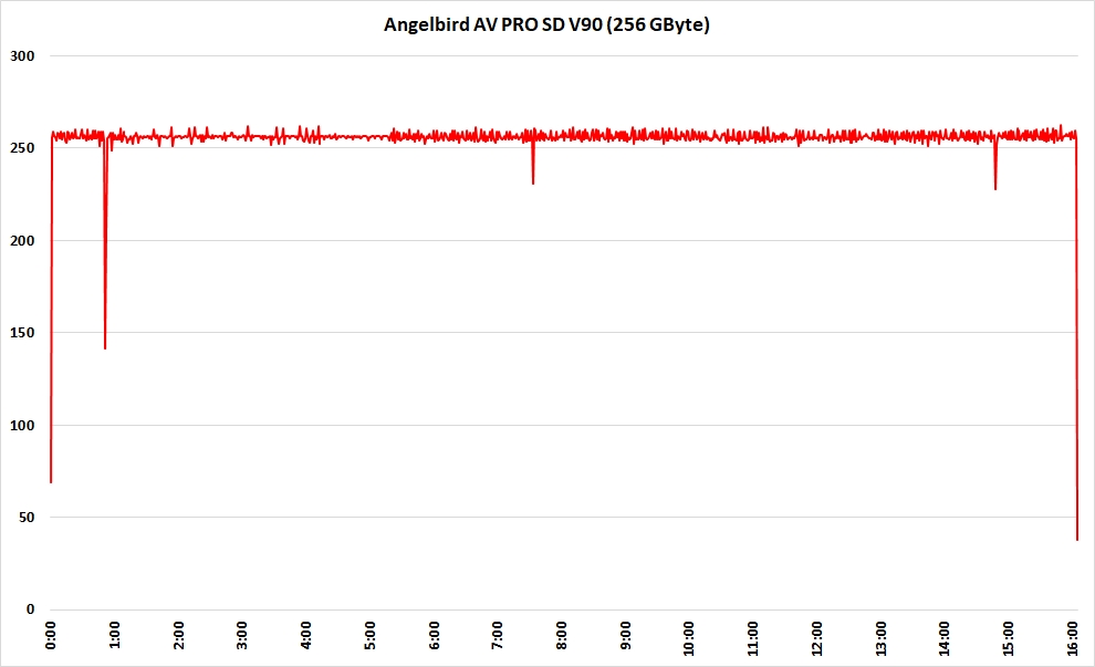 Spannender ist der Dauerschreibtest, der sowohl die 128- als auch 256-GByte-Karten fast komplett vollschreibt und die Leistungsergebnisse sekundengenau aufzeichnet. Die AV PRO SD V90 von Angelbird arbeitet während des gesamten Durchlaufs mit durchschnittlich 255,7 MByte/s und kann sich somit leicht von der ADATA Premiere One (248 MByte/s) und der Sandisk Extreme Pro (246,5 MByte/s) absetzen. Toshibas Exceria Pro N502 erreicht jedoch nur einen Mittelwert von 144,8 MByte/s. Den Grund dafür liefert ein Blick auf den Verlauf der Leistungskurve. Während die Kandidaten von ADATA, Angelbird und Sandisk eine beständige Performance aufweisen, bricht die Toshiba ein.