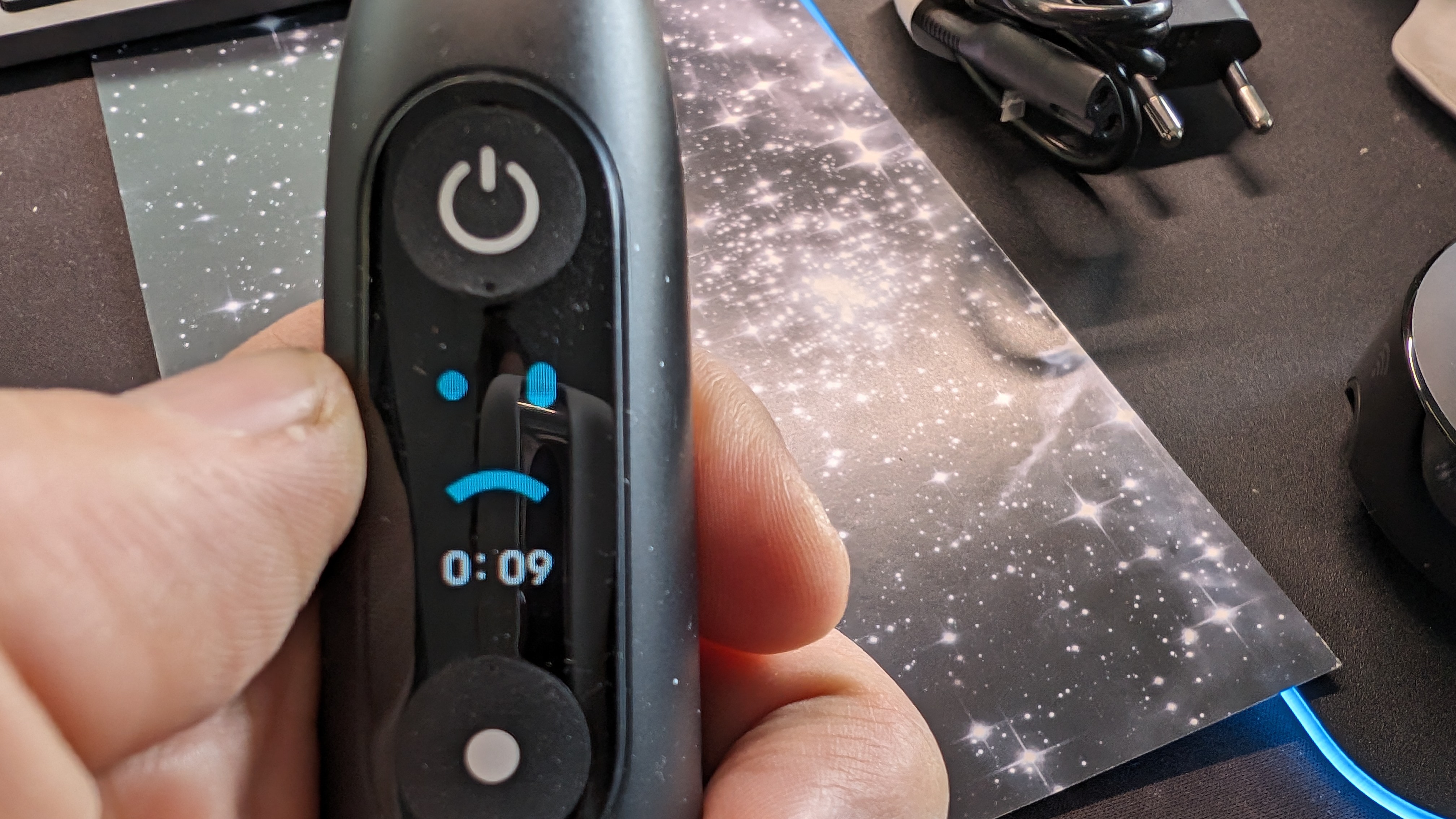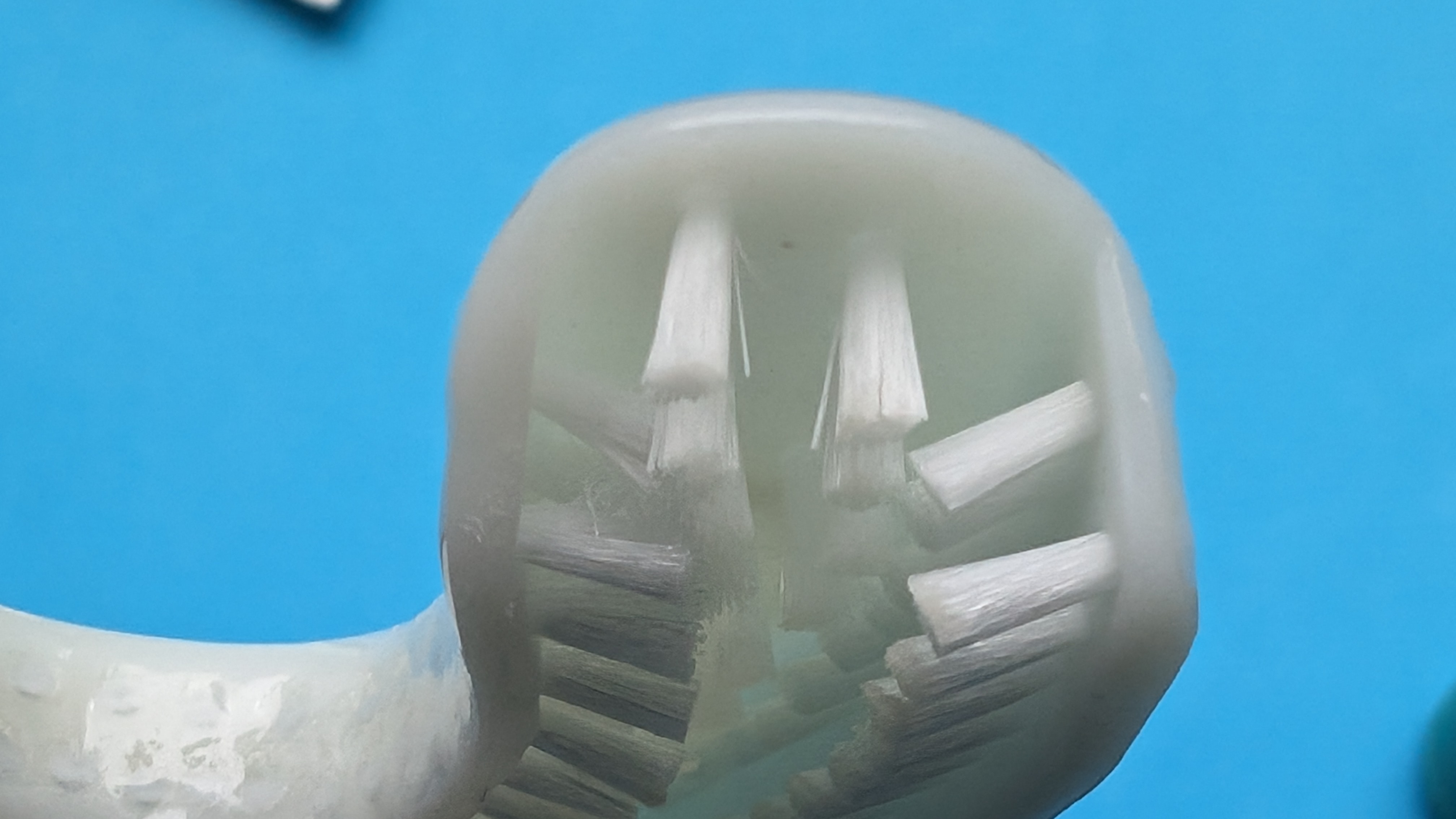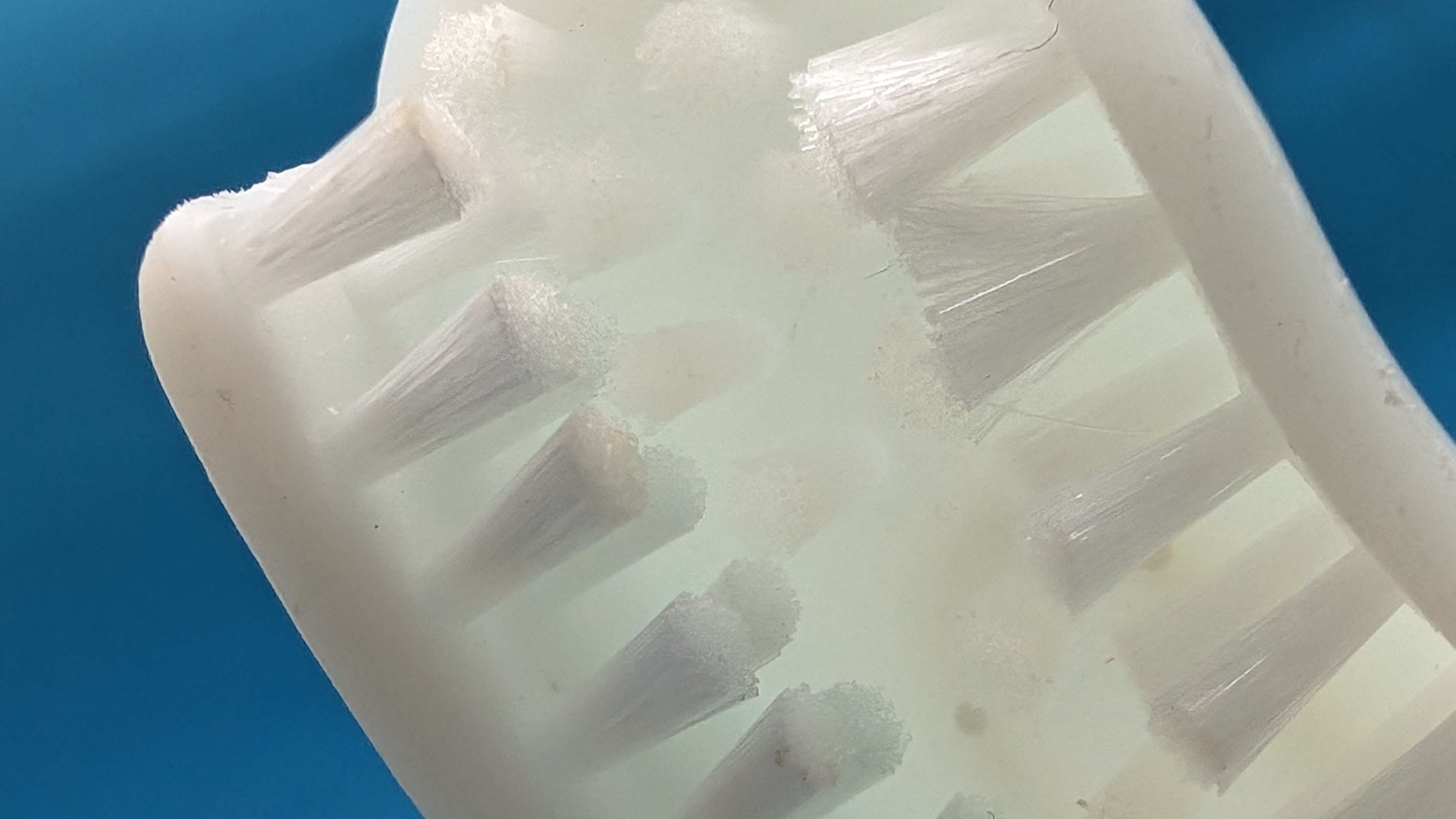 Das Prinzip ist einfach: Der halbkreisförmige Aufsatz legt sich um die Zähne des Ober- oder Unterkiefers. Die laut Fasteesh 35.000 Borsten bearbeiten dann mit angegebenen 20.000 Schwingungen pro Minute jeden Zahn gleichzeitig. Im Test funktionierte das relativ gut. Allerdings benötigten wir einige Anläufe, bis wir die Y-Brush richtig benutzen. Die richtige Anwendung erfordert eine Kombination aus hin- und herdrehen und Kaubewegungen. Zunächst benötigt man länger, bis zu 30 Sekunden. Wenn man den Dreh raus hat, geht’s tatsächlich innerhalb 10 Sekunden – 5 Sekunden Oberkiefer, 5 Sekunden Unterkiefer.