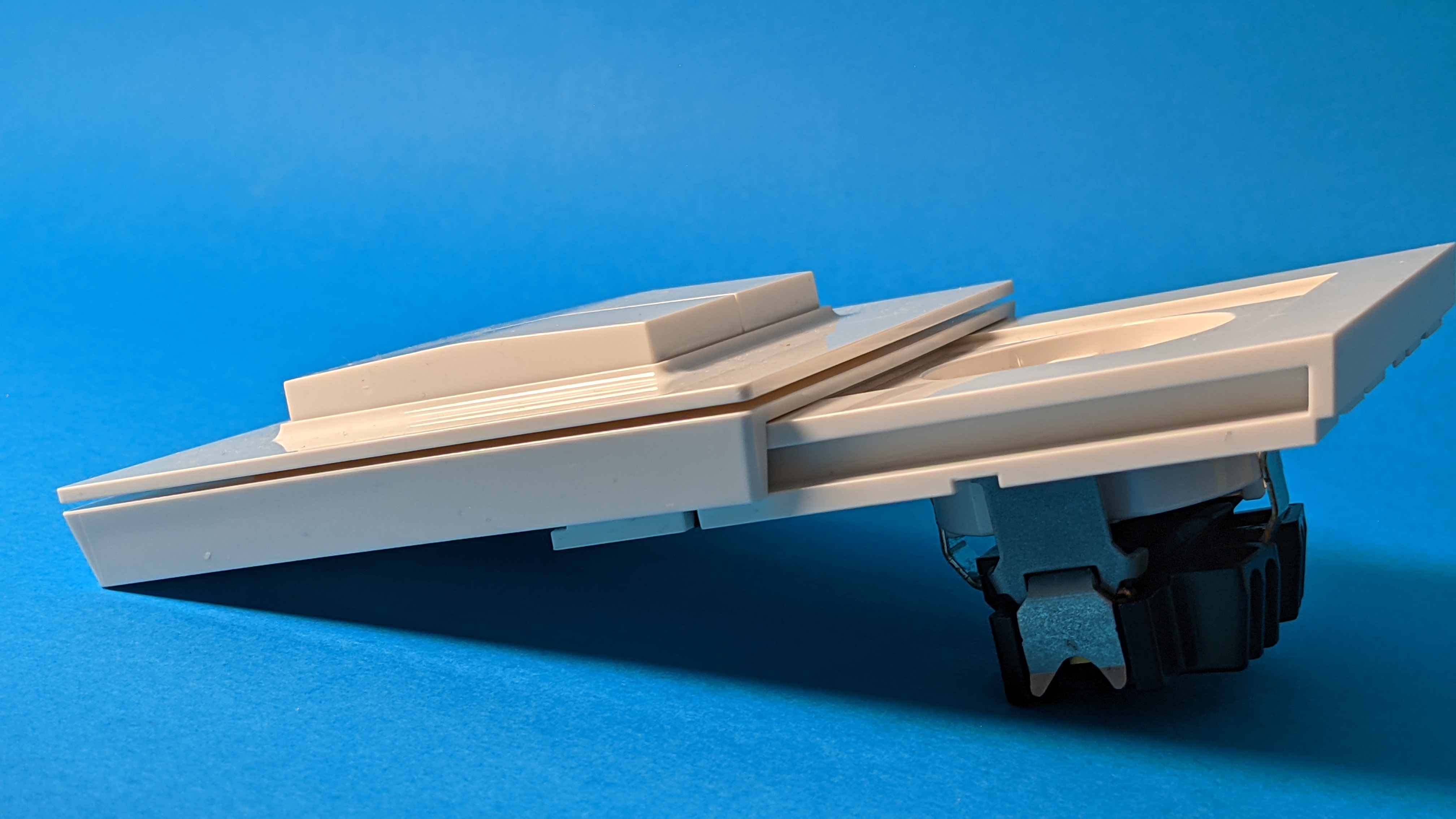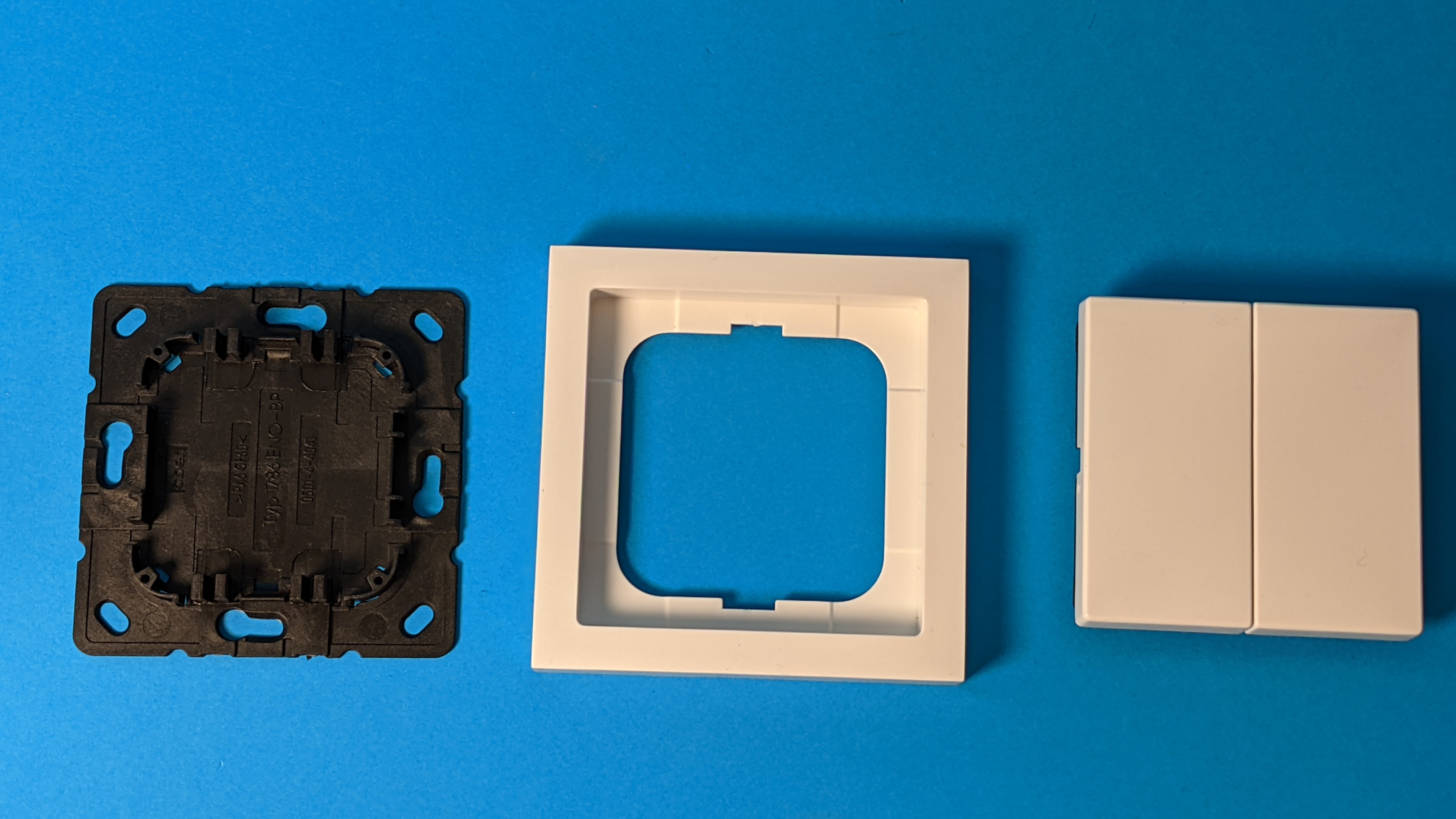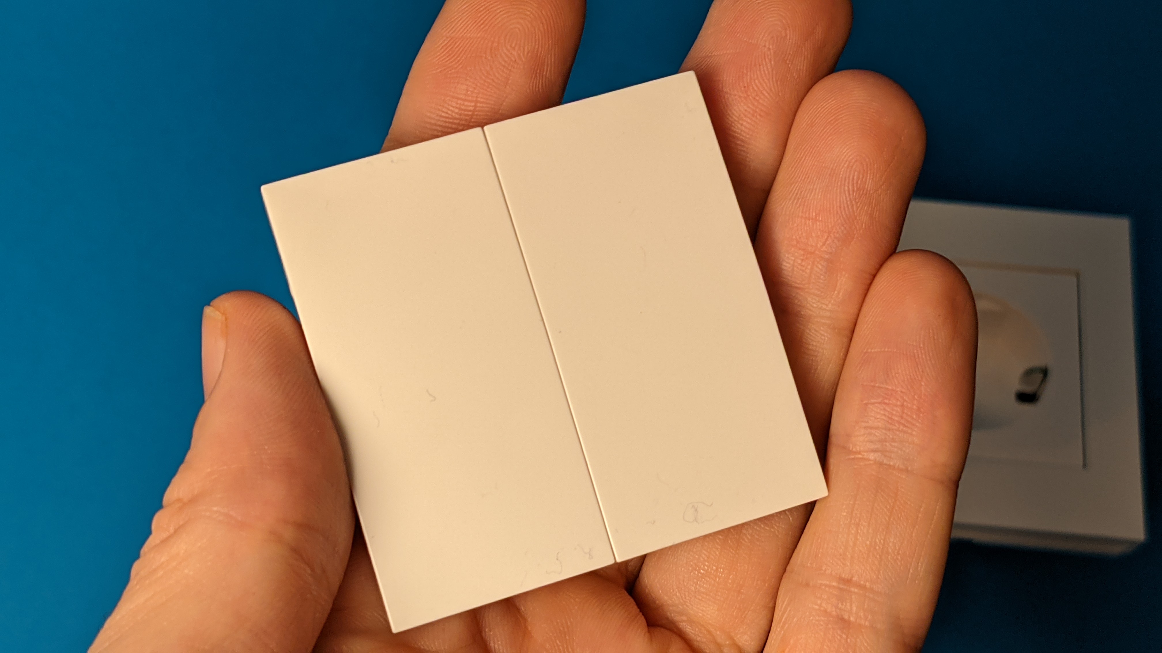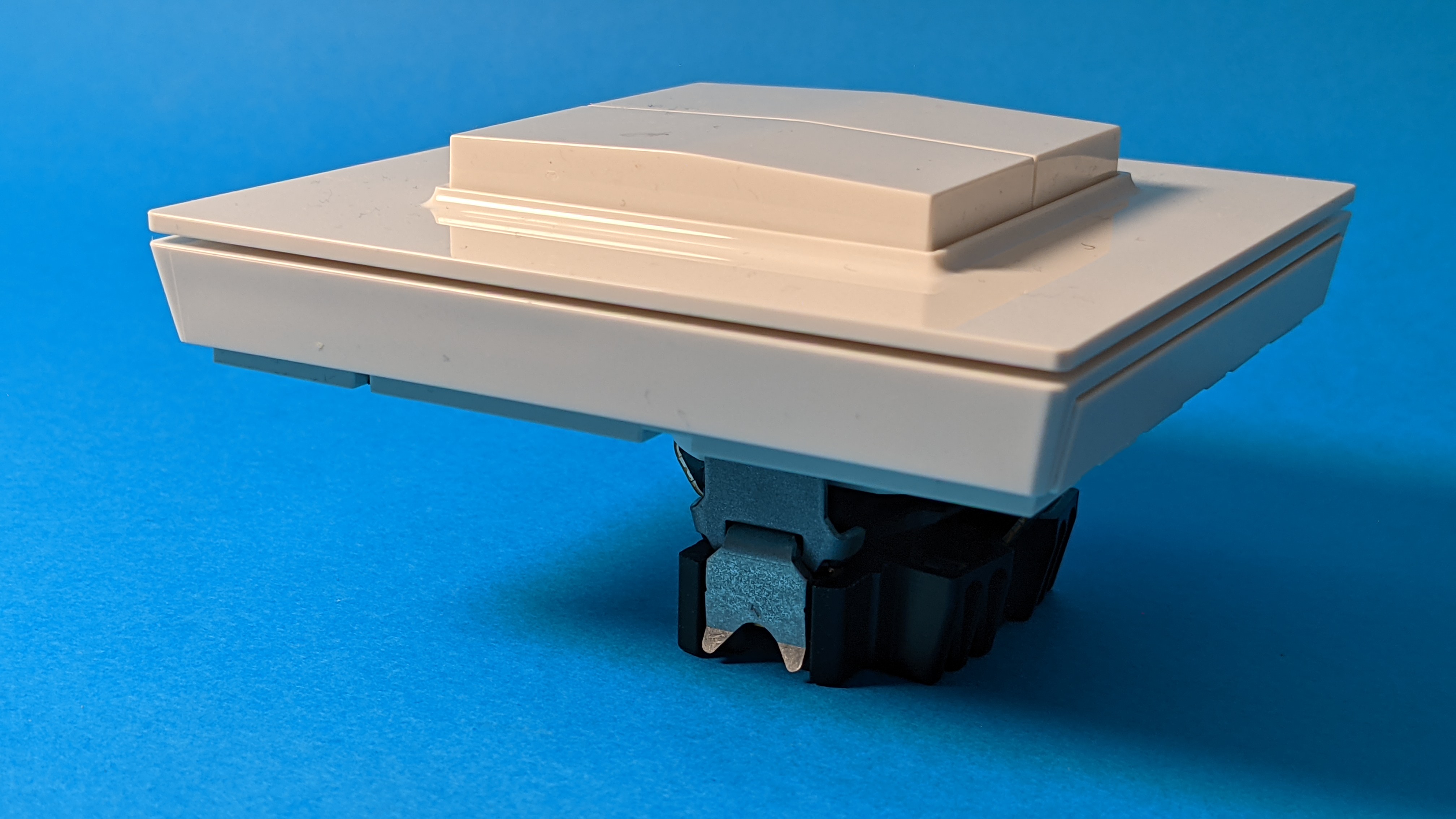 Der Busch-Jaeger Smart Switch wird entweder aufgeklebt oder am Montageort angeschraubt. Ihrer Erscheinung ist kaum von einem klassischen Lichtschalter zu unterscheiden. Sie besteht aus zwei Teilen, die jeweils an einen Kippschalter erinnern, im Grunde aber je zwei Taster sind. Das Besondere: Sie kommen komplett ohne Batterie aus. Die für die Datenübertragung per Zigbee benötigte Spannung gewinnt der Busch-Jaeger Smart Switch durch das Betätigen des Schalters selbst. Dafür muss man tatsächlich etwas kräftiger drücken, das stört jedoch nicht. Ganz im Gegenteil, es vermittelt ein sehr wertiges haptisches Feedback.