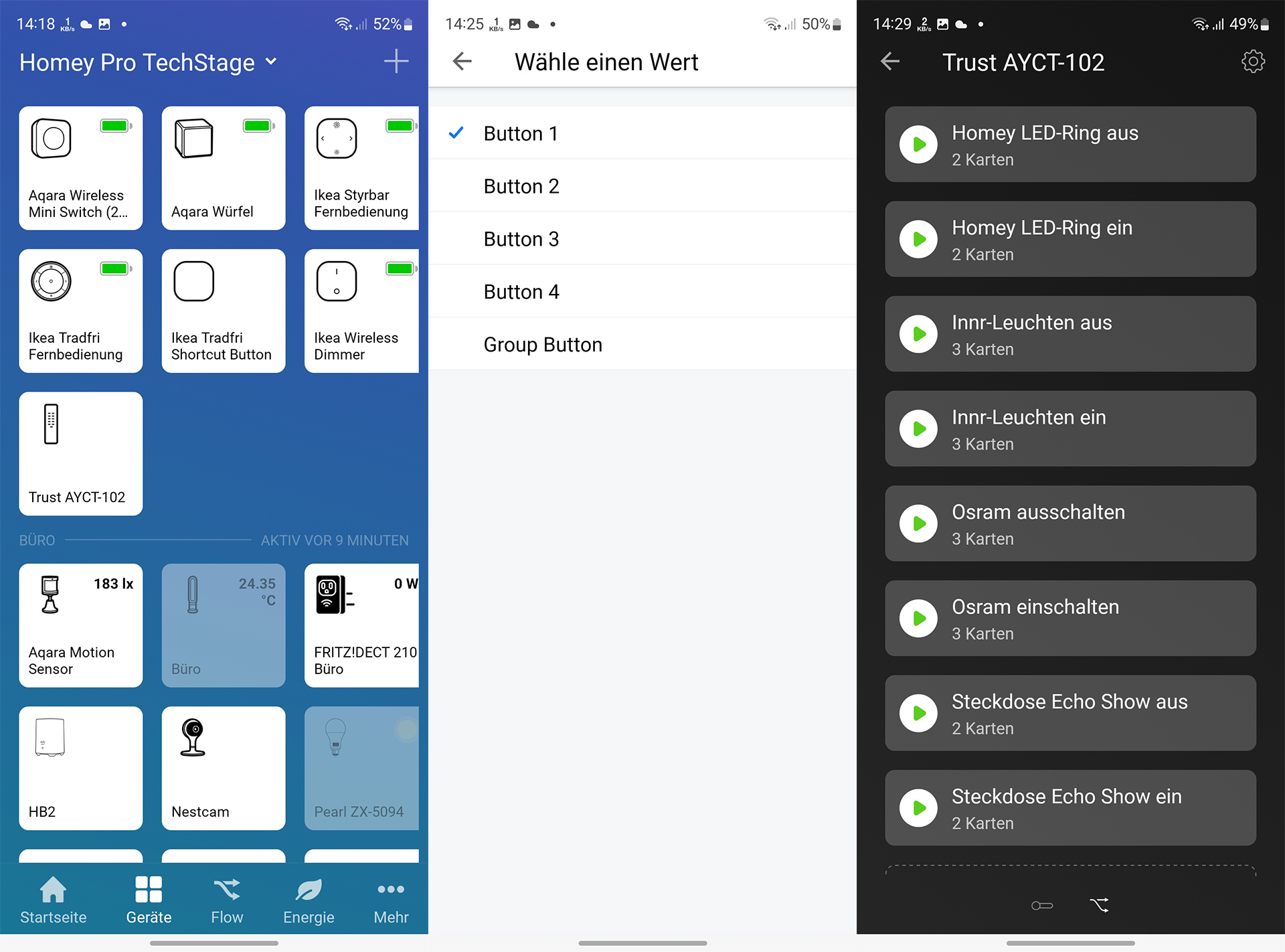 Die Belegung der Tasten geht leicht von der Hand und ist in wenigen Minuten erledigt. Im Test haben wir mit der Trust-Fernbedienung den LED-Ring von Homey, die Innr-Leuchten, die Osram-Lampe und die Popp-Steckdose, die einen Amazon Echo Show mit Strom versorgt, ein- und ausgeschaltet. Nicht schlecht für ein Gerät, das nur etwa 17 Euro kostet.
