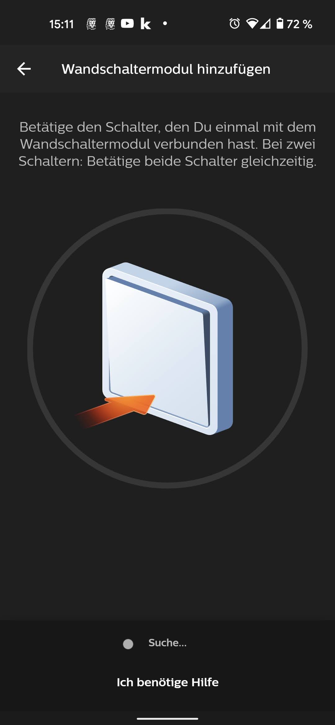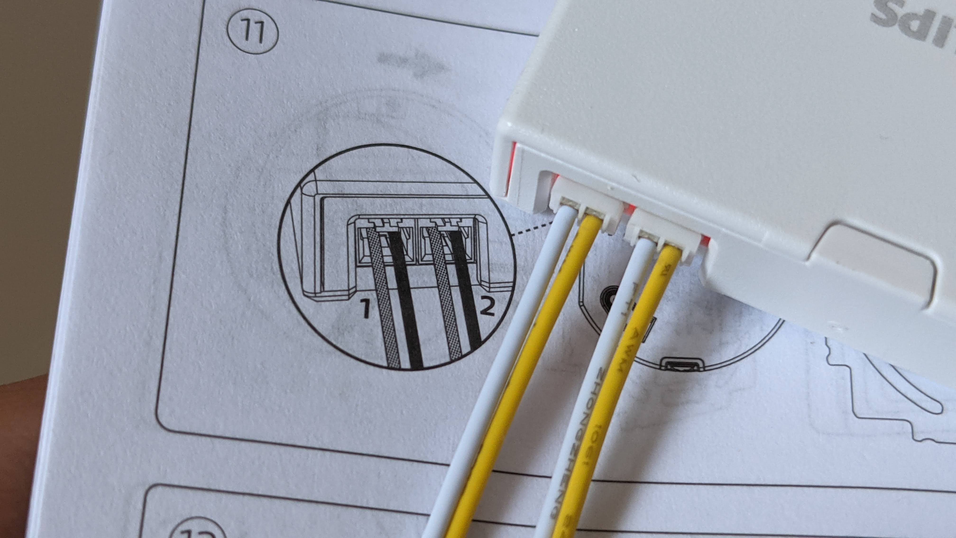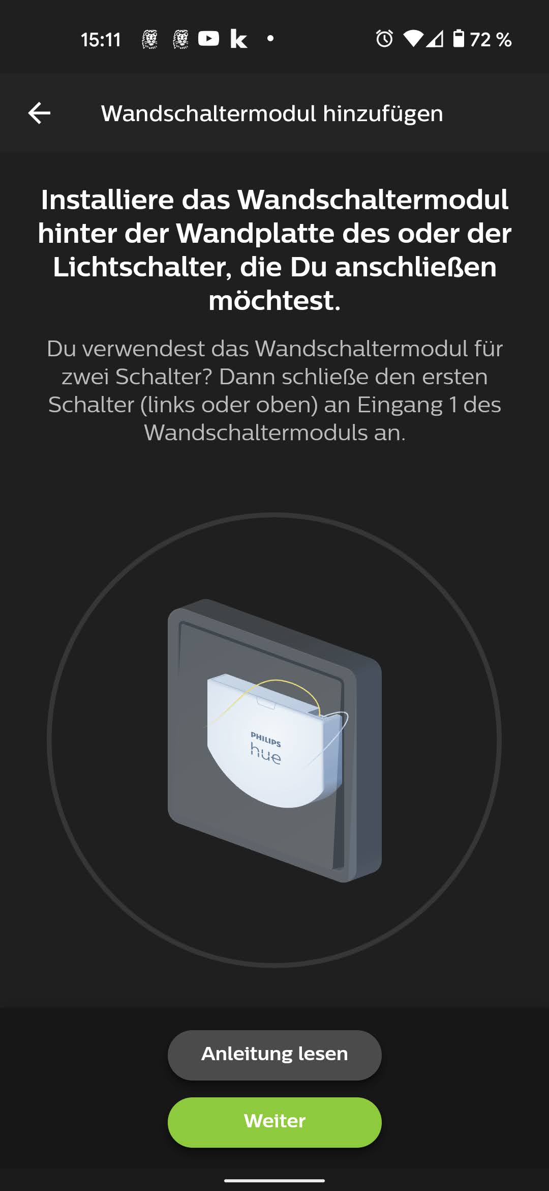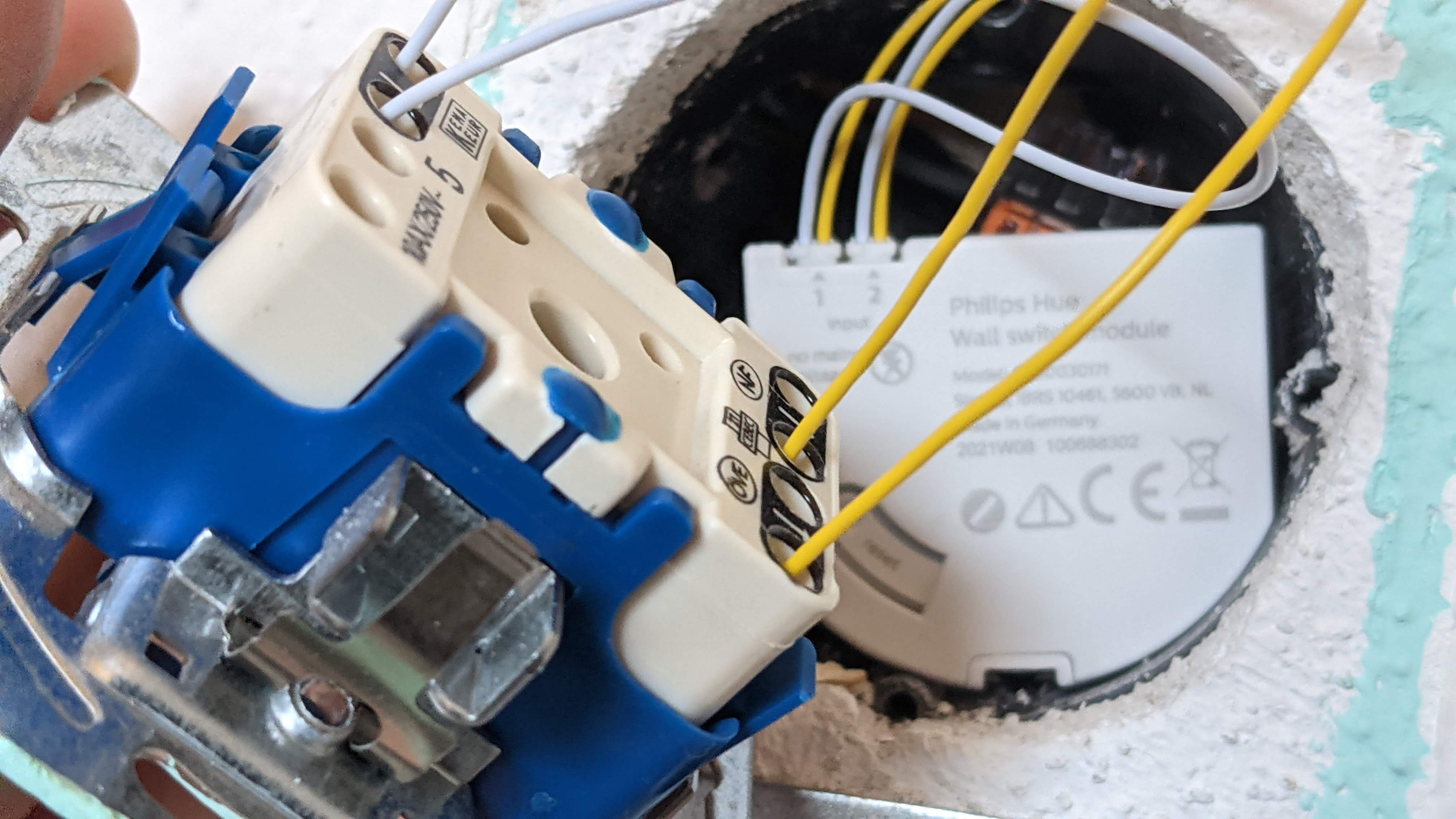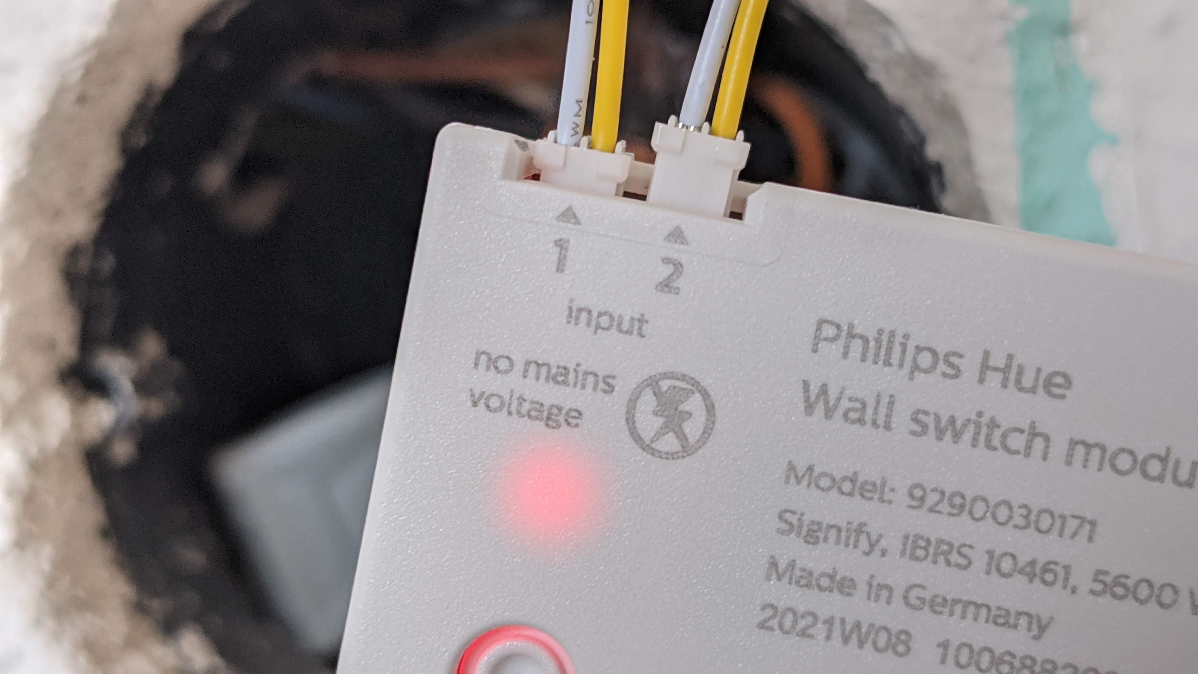 Nun nimmt man die Kabel aus der alten Schaltereinheit und steckt sie in die mitgelieferte Klemme. Daraufhin ist der Schaltkreis geschlossen und die Lampen stehen dauerhaft unter Strom. Der smarte Part steckt in dem flachen Modul, in welches zunächst ein oder zwei Kabelpaare geklemmt werden. Hat man einen einfachen Schalter, reicht eines. Handelt es sich wie in unserem Fall um einen Schalter mit Doppelwippe, benötigt man beide Paare, hat aber auch gleich die Möglichkeit, diese unabhängig voneinander zu programmieren. Tatsächlich kann man – ein paar Grundkenntnisse vorausgesetzt – beim Stecken der Verbindung nicht viel falsch machen. Mehr Informationen zur Installation gibt es in der Bildergalerie. Bei uns erkennt die Hue-App das Wandschaltermodul auf Anhieb und führt wie von Hue gewohnt komfortabel durch die Installation.