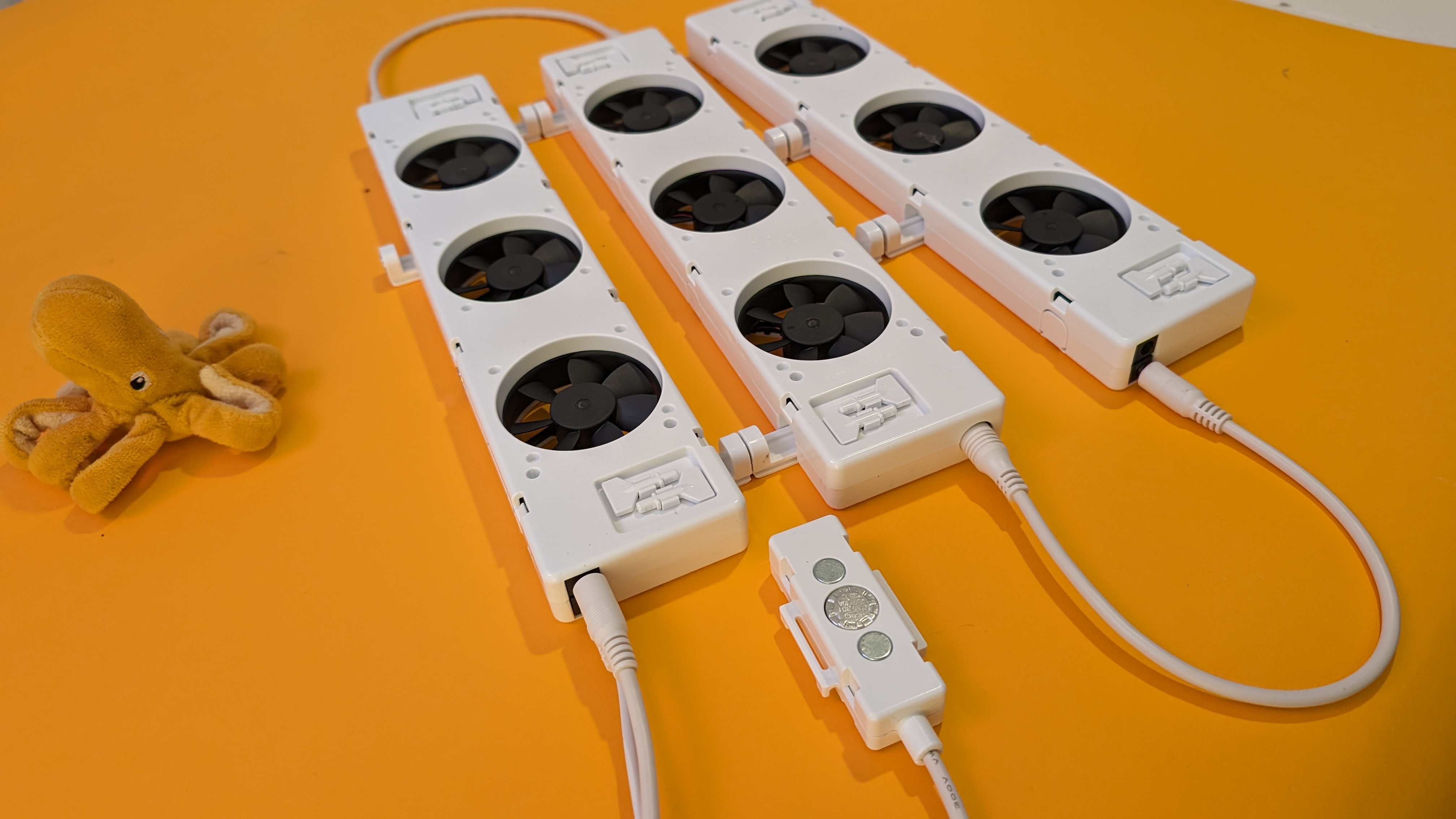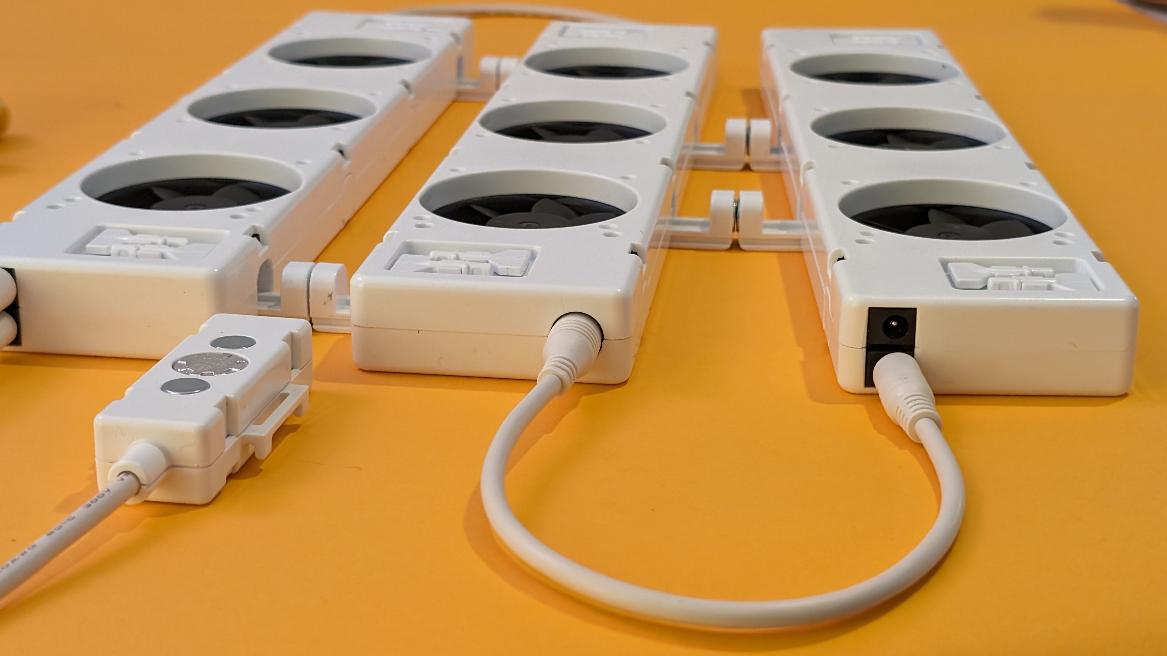 Das Set von Speedcomfort ist modular aufgebaut und funktioniert mit einem, zwei oder drei Modulen, die über Kabel miteinander verbunden sind. Diese Elemente besitzen je drei 60-Millimeter-Lüfter vom Typ Sunon HA60151V1, die mit 1900 Umdrehungen pro Minute laufen. Sie werden idealerweise unter dem Heizkörper angebracht. Dafür bieten sie ausziehbare Magnete. So ist ihre Montage auch für Anfänger kein Problem. Es ist auch möglich, sie auf den Heizkörper zu legen, das ist jedoch weniger effizient.