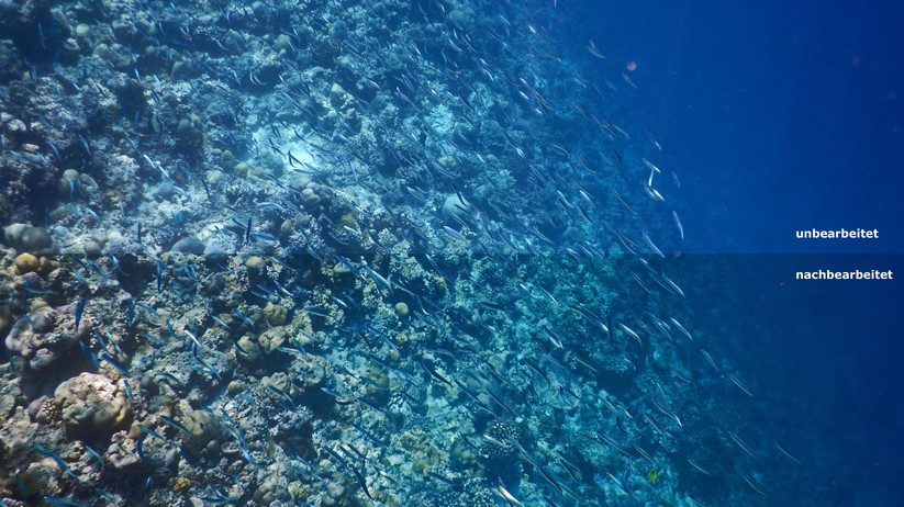 Wer tiefer als 30 Meter taucht, bekommt auch keine Gelbtöne mehr zu sehen, Grün verliert ab etwa 50 Meter seine Wirkung. Wer Korallen und Fische in voller Farbpracht abbilden möchte, muss an der Wasseroberfläche bleiben – oder mit einem Rotfilter gegensteuern. Ab 10 Meter Wassertiefe ist es grundsätzlich sinnvoll, eine zusätzliche Beleuchtung wie einen Blitz oder eine Lampe zu nutzen.