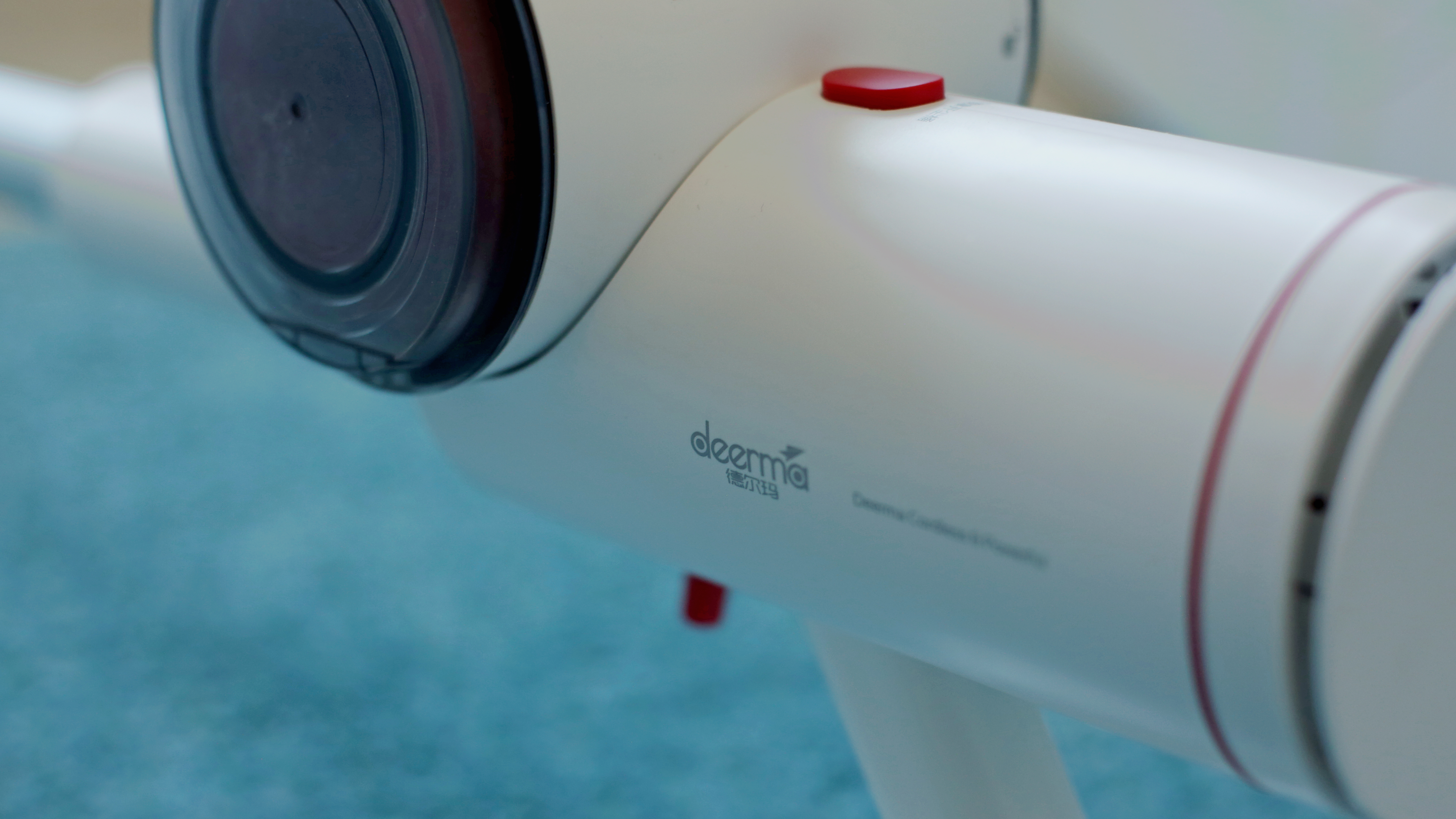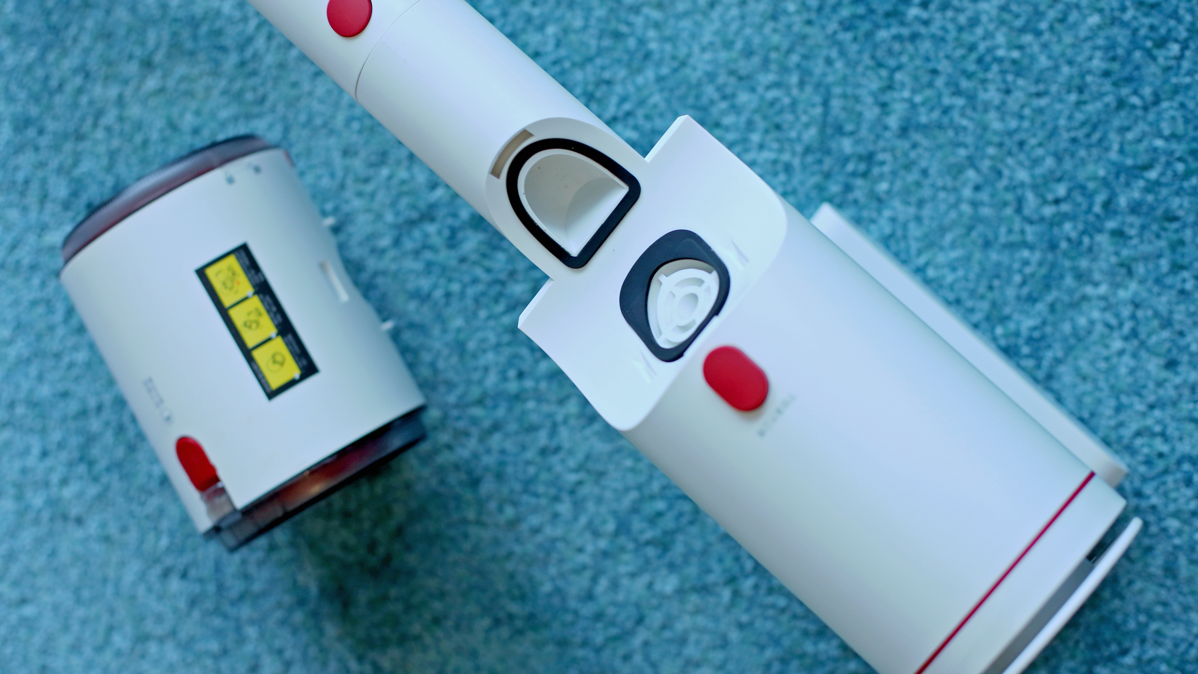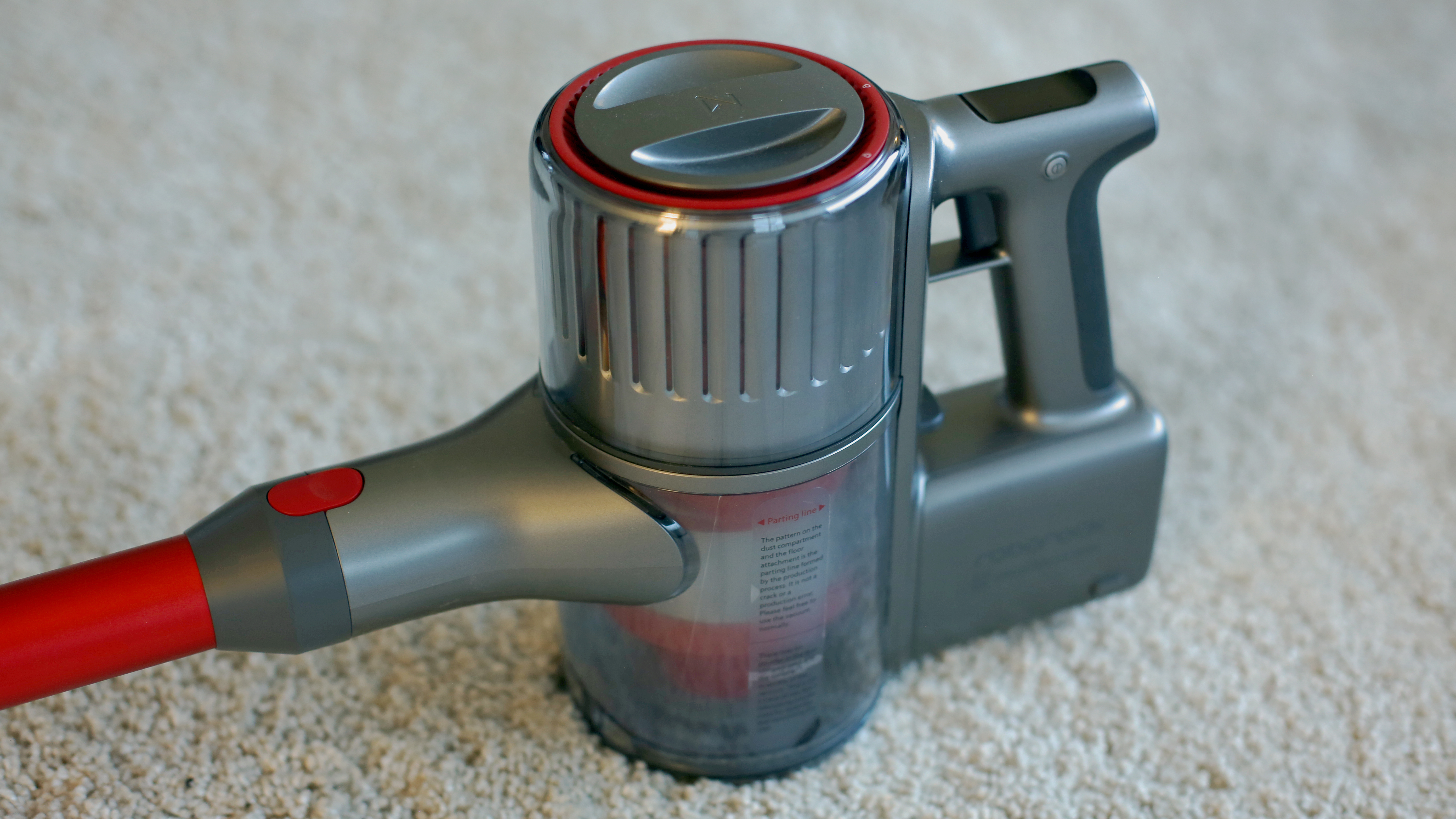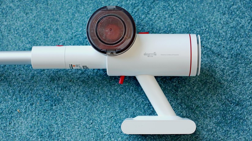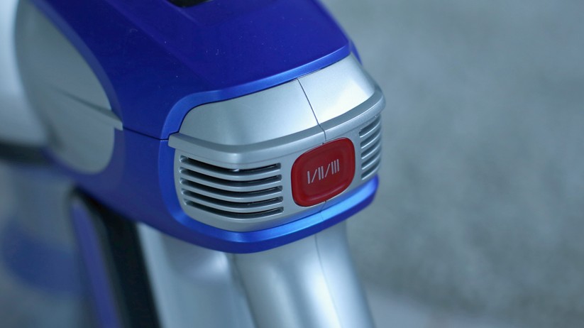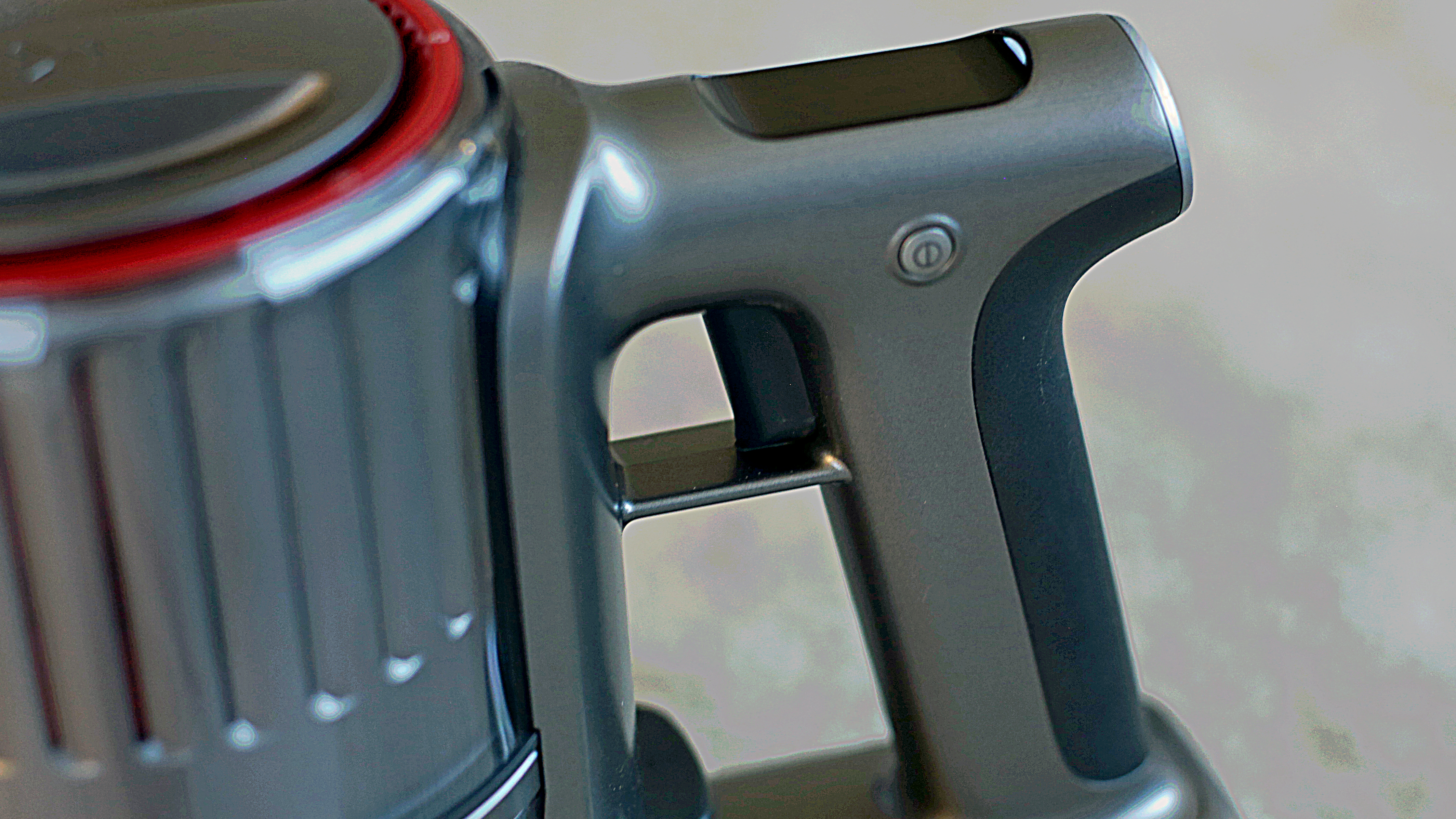 Beim Design oder zumindest bei der Qualitätsanmutung hat der günstige Deerma VC25 das Nachsehen. Beim Design lässt sich darüber allerdings streiten, denn das hat seinen ganz eigenen Charme. Der Staubsauger erinnert von den drei Modellen im Vergleich am ehesten an eine Laser-Waffe eines Science-Fiction-Films der 50er Jahre. Grund ist die runde Pistolenform mit etwas klobig unter dem Griff angebrachtem Akku, zudem sitzt der abnehmbare Schmutzbehälter liegend oben auf dem Gerät und erinnert entfernt an ein Trommelmagazin – oder eben die Energiezelle eines Lasers. Der mattweiße Kunststoff wirkt in Kombination mit einigen roten Druckknöpfen im Vergleich etwas billig, das silberfarbene Saugrohr aus Aluminium muss sich hingegen nicht vor der Konkurrenz verstecken. Etwas kurios ist der „Powerschalter“. Er erinnert entfernt an einen zu dick geratenen Abzug einer Pistole aus dem 3D-Drucker, verfügt allerdings nicht über einen Fingerschutz.