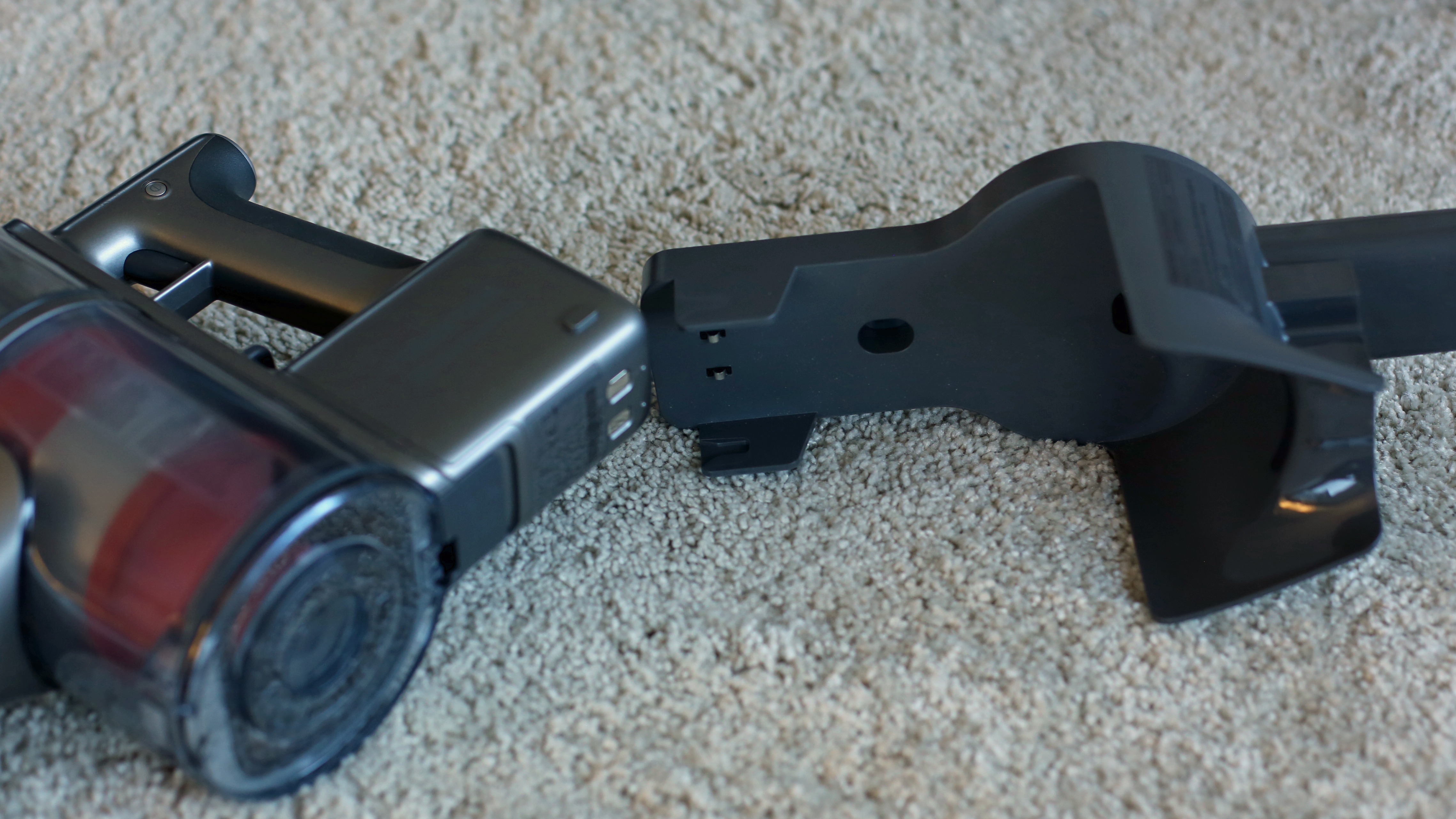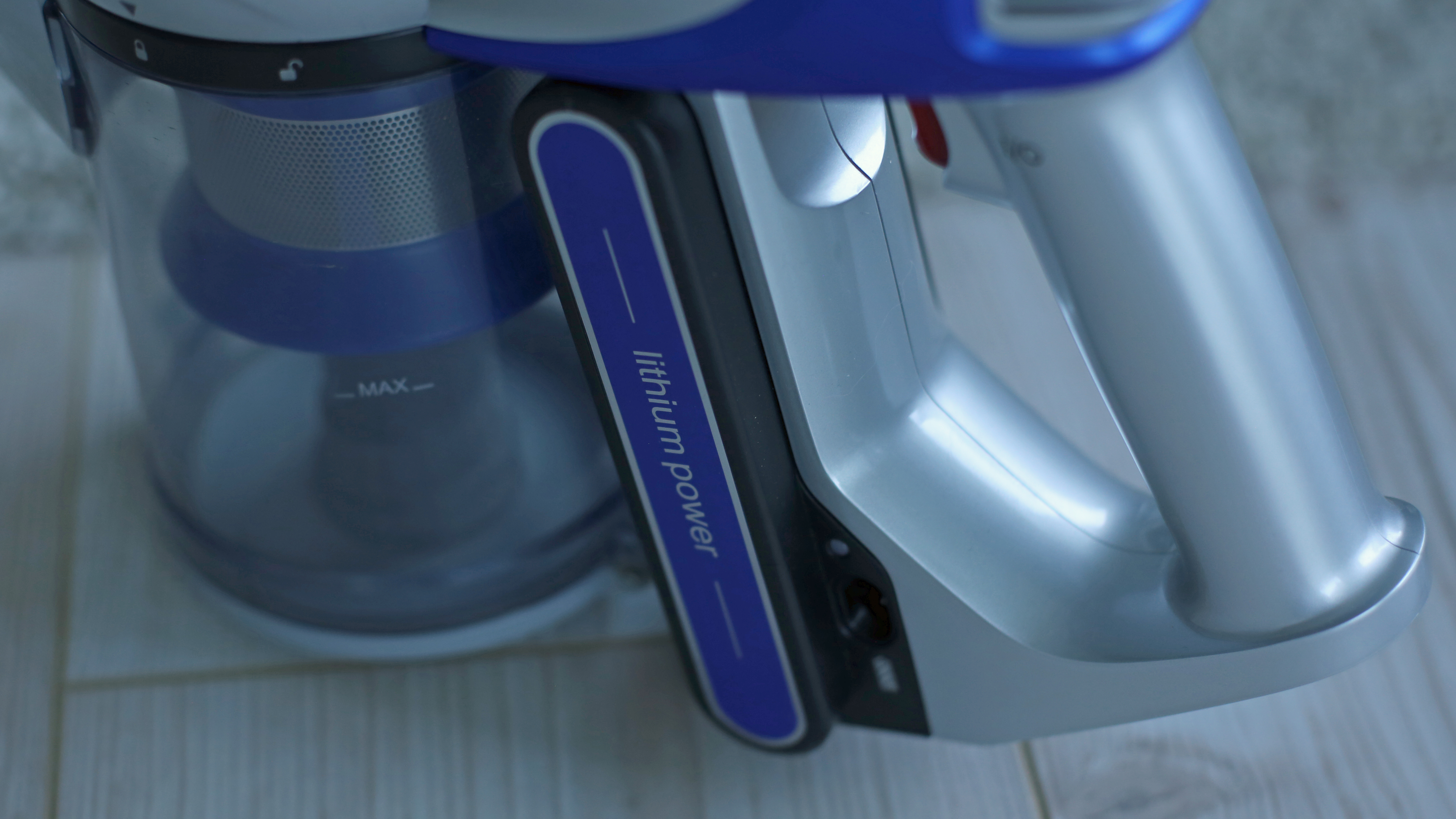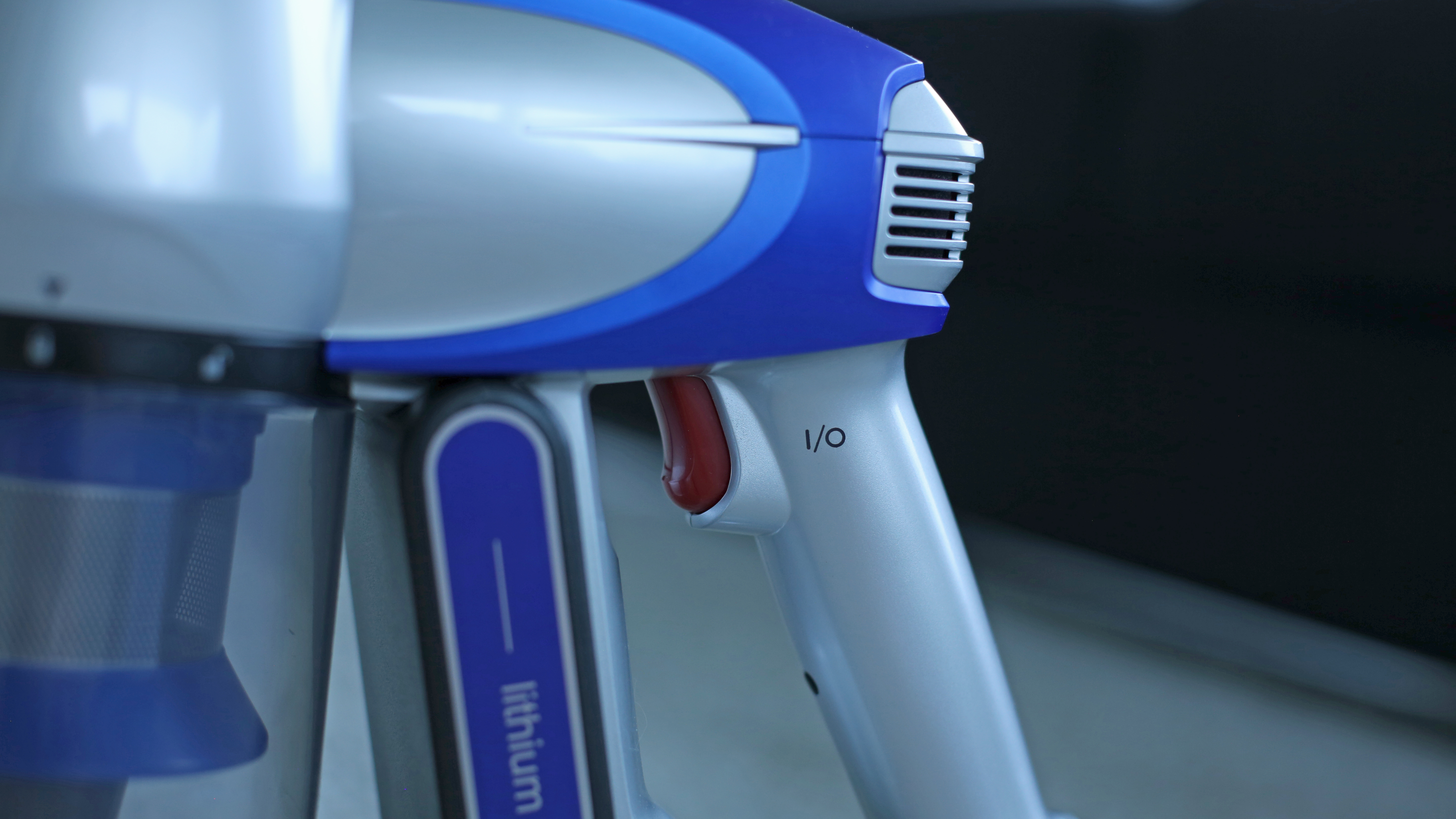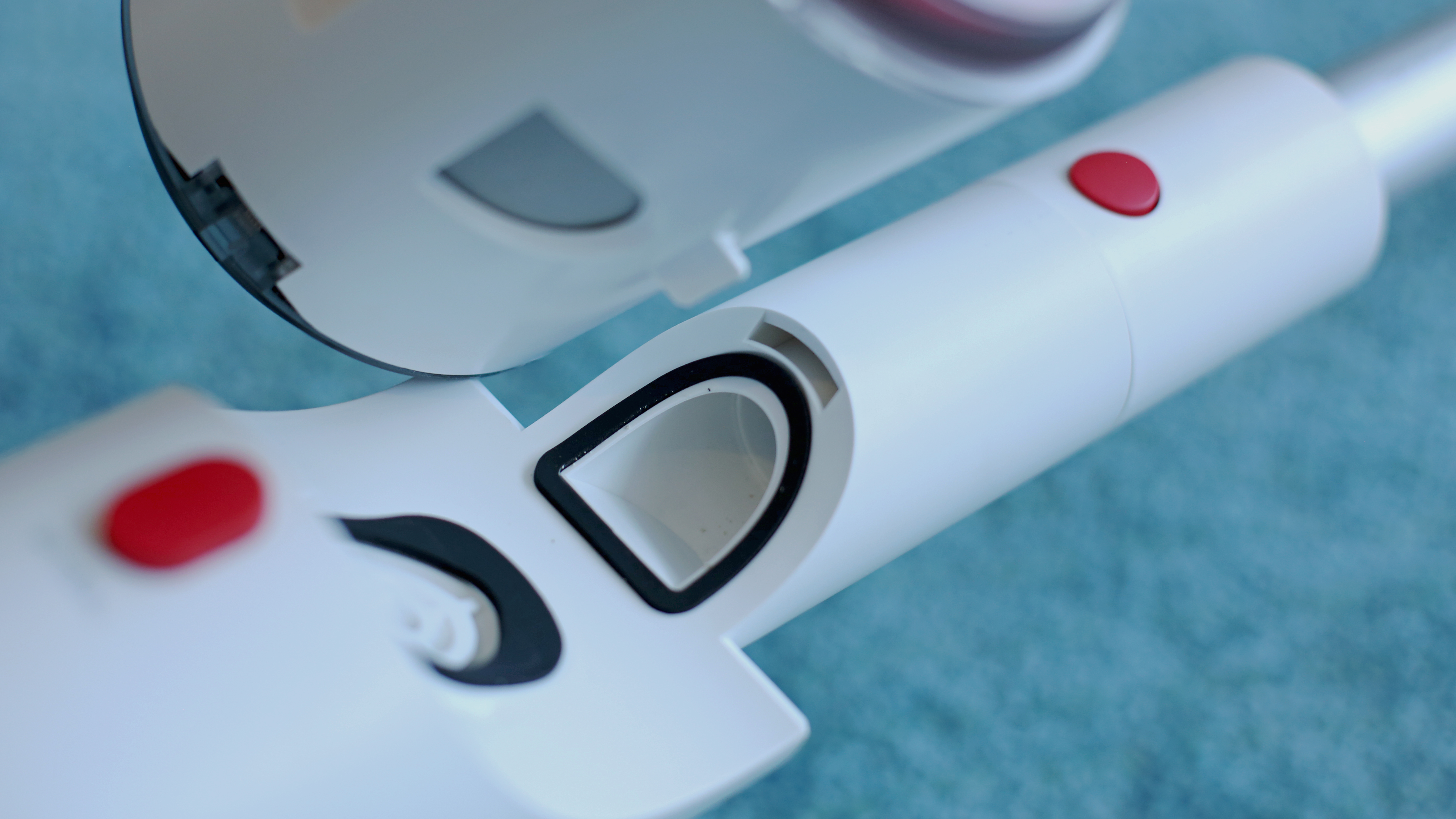 Beim Design oder zumindest bei der Qualitätsanmutung hat der günstige Deerma VC25 das Nachsehen. Beim Design lässt sich darüber allerdings streiten, denn das hat seinen ganz eigenen Charme. Der Staubsauger erinnert von den drei Modellen im Vergleich am ehesten an eine Laser-Waffe eines Science-Fiction-Films der 50er Jahre. Grund ist die runde Pistolenform mit etwas klobig unter dem Griff angebrachtem Akku, zudem sitzt der abnehmbare Schmutzbehälter liegend oben auf dem Gerät und erinnert entfernt an ein Trommelmagazin – oder eben die Energiezelle eines Lasers. Der mattweiße Kunststoff wirkt in Kombination mit einigen roten Druckknöpfen im Vergleich etwas billig, das silberfarbene Saugrohr aus Aluminium muss sich hingegen nicht vor der Konkurrenz verstecken. Etwas kurios ist der „Powerschalter“. Er erinnert entfernt an einen zu dick geratenen Abzug einer Pistole aus dem 3D-Drucker, verfügt allerdings nicht über einen Fingerschutz.