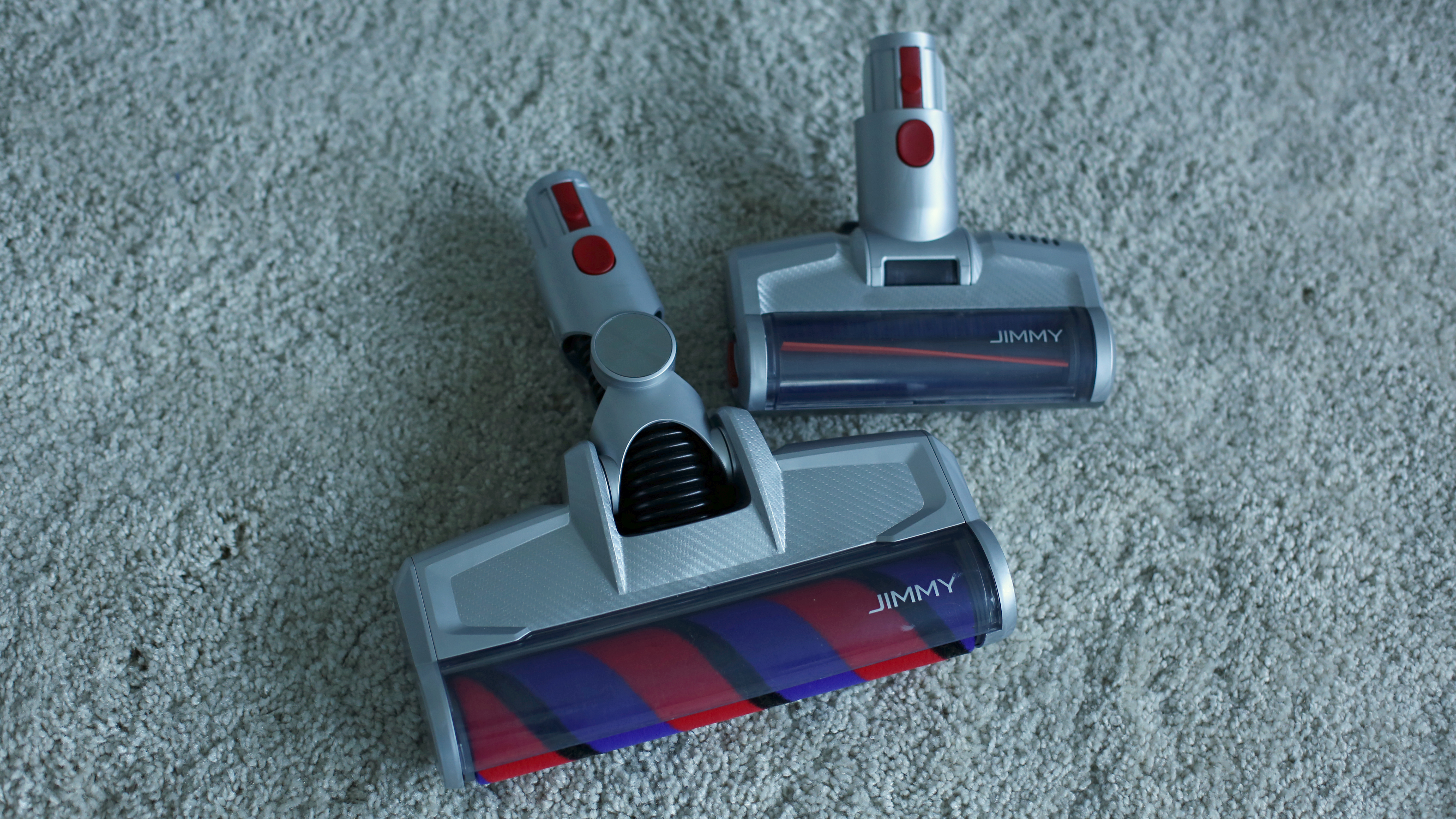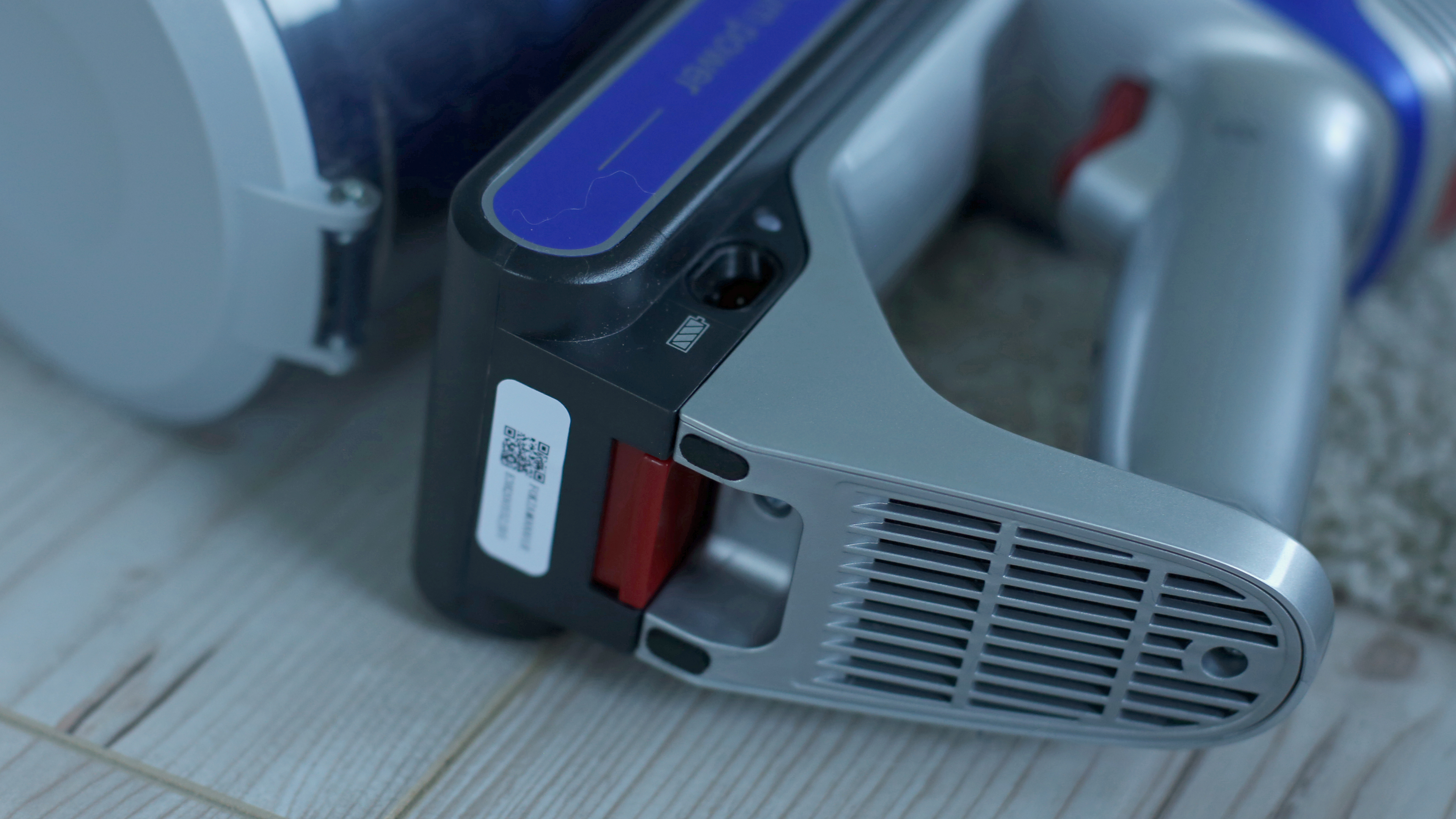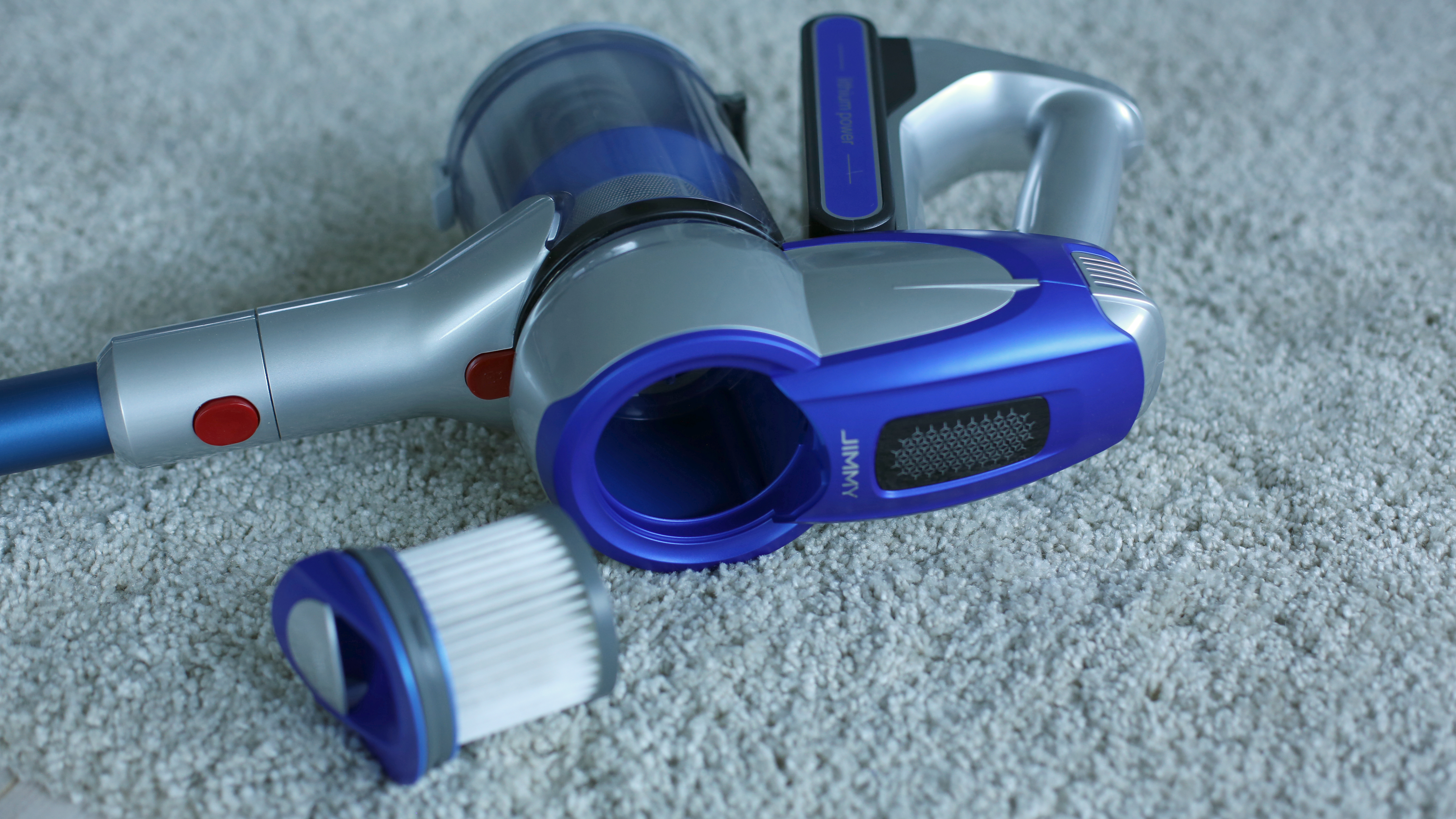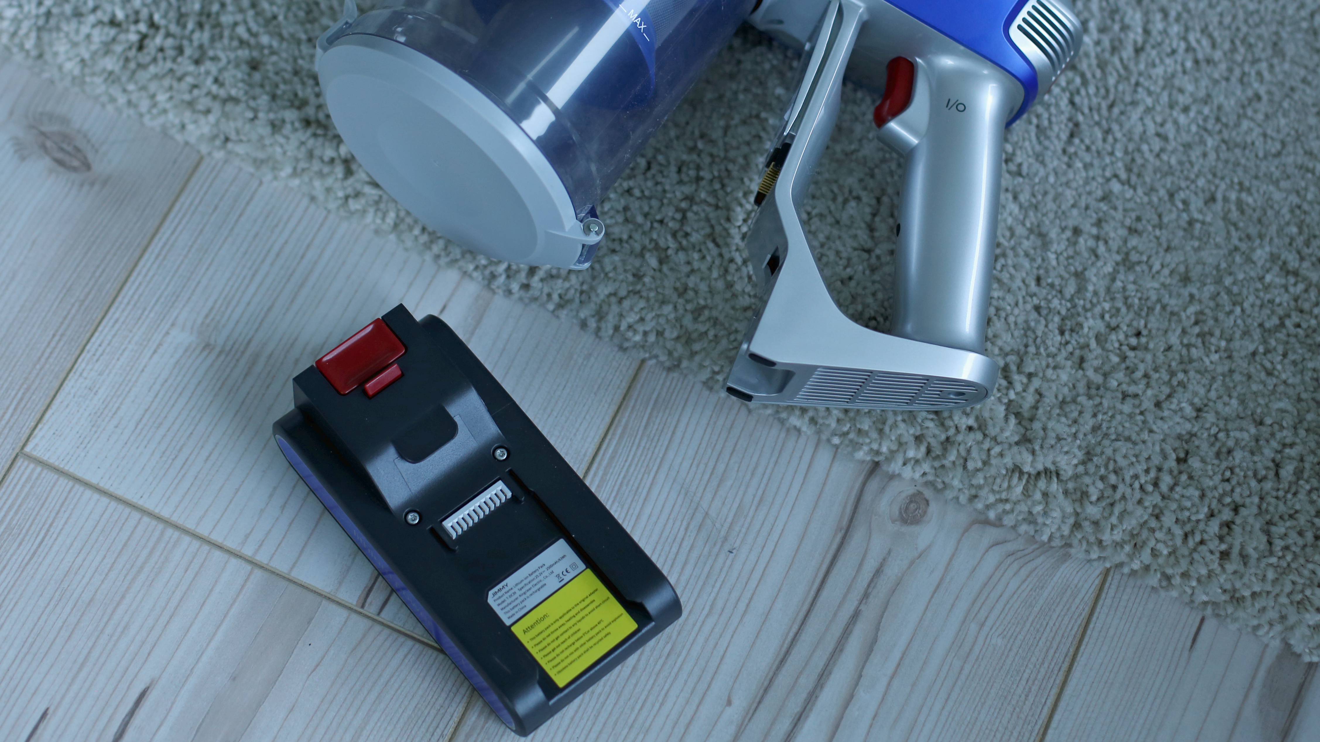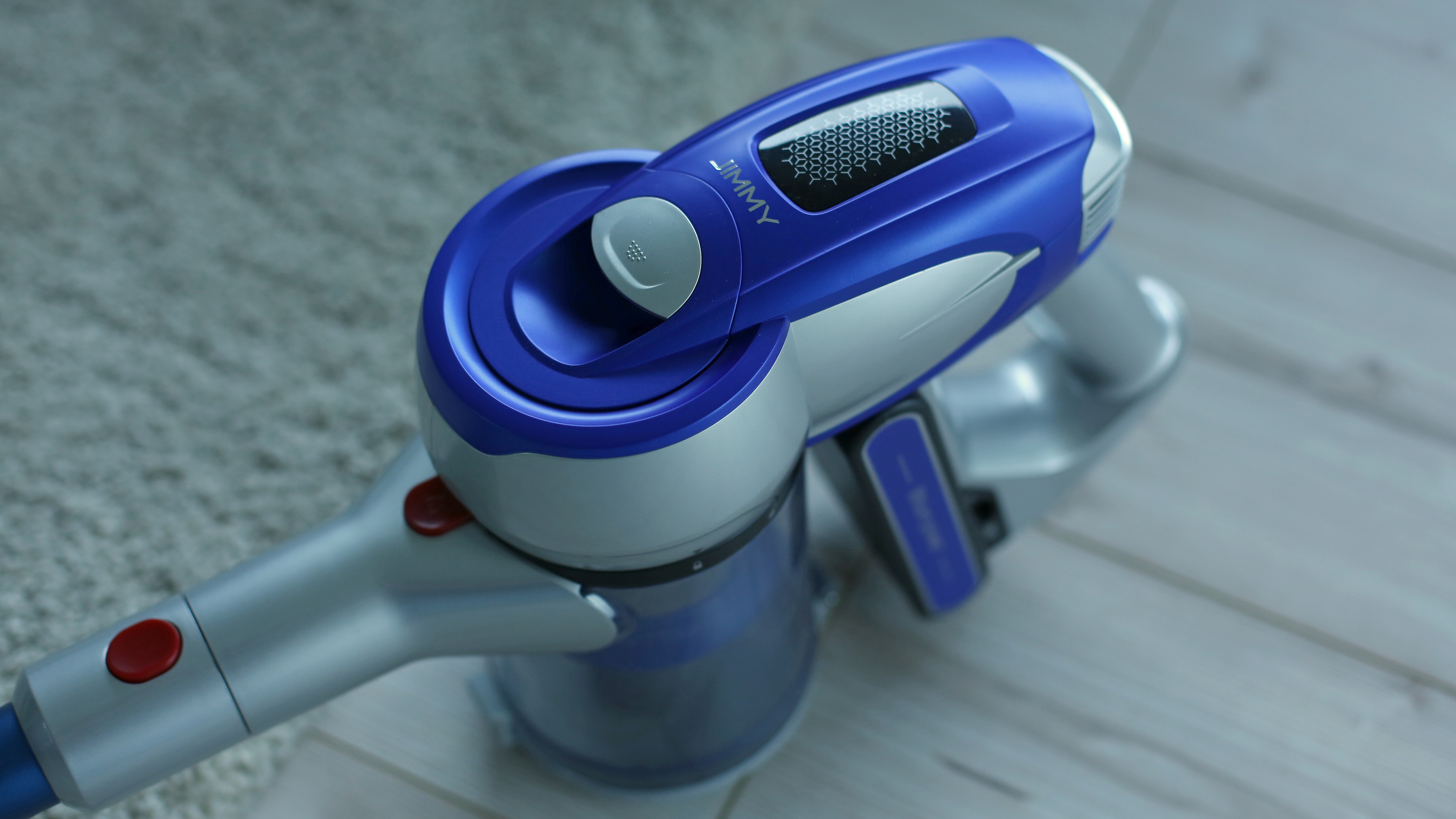 Der Jimmy JV83 nähert sich optisch trotz blauer statt roter Farbgebung weitaus mehr dem Roborock-Modell an, ist dabei aber insgesamt etwas fülliger. Bei beiden Modellen hängt der transparente Schmutzbehälter aufrecht unter dem Sauger, der Jimmy ist aber gerade im oberen Bereich in der Nähe der Hand wesentlich pummeliger und wirkt mit seinen Lüftungsschlitzen und der silber-blauen Zweiton-Farbgebung wie ein US-Haushaltsgerät aus den 60ern. Das ist allerdings nicht negativ gemeint – retro statt altbacken ist hier die Devise. Vorteil: Der flache Akku, der vor dem Handgriff angebracht ist, lässt sich problemlos wechseln. Das ist auf lange Sicht gut und erlaubt kurzfristig eine Verdoppelung der Saugzeit, sofern ein Zweitakku dazugekauft wird. Beim filigraner und moderner wirkenden Roborock-Modell haben wir dazu keine Möglichkeit gefunden, auch wenn der unter dem Handgriff montierte Akku bei genauerem Hinsehen entsprechende Fugen zeigt, die eine Austauschbarkeit nahelegen.