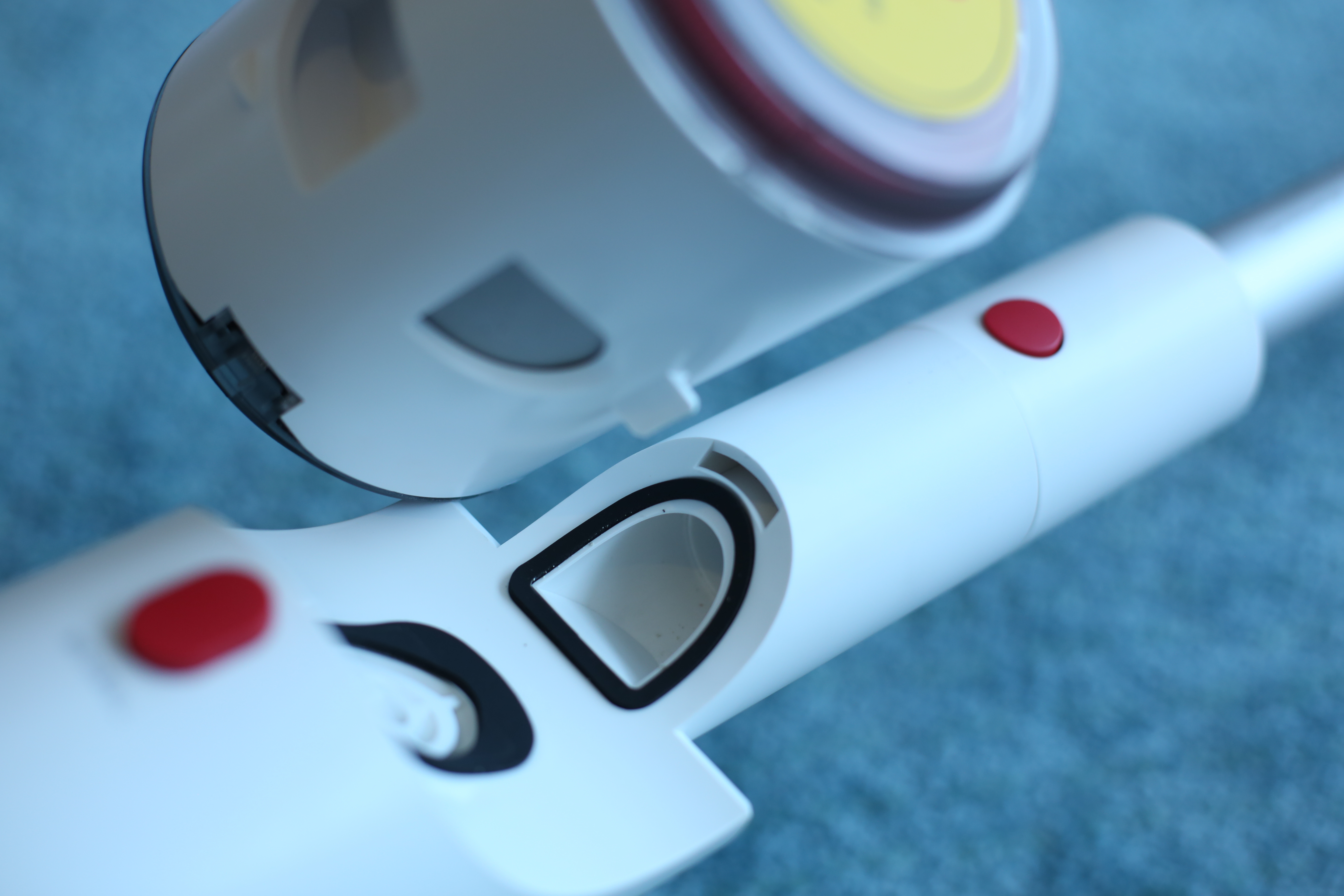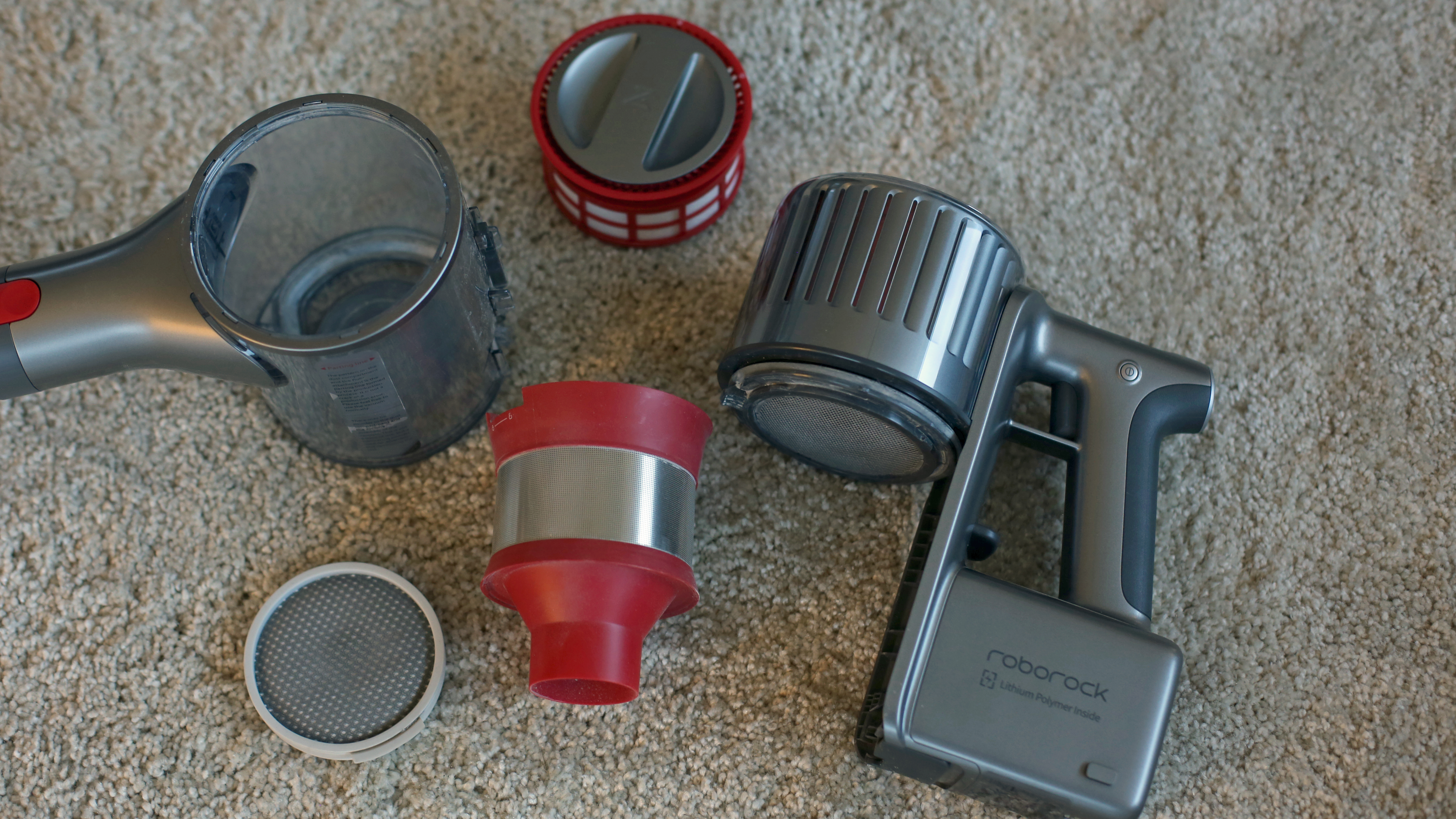 Beim Roborock H6 funktioniert das ganz ähnlich. Der HEPA-Filter wird hier ebenfalls nach oben abgenommen, allerdings wird er hier mittels einer leichten Schraubdrehung gehalten. Ein Entriegelungsmechanismus unter dem Akku ermöglicht die Entnahme des ganzen Staubbehälters, der Filter für groben Schmutz aus Kunststoff und Metallsieb wird ebenfalls mit einer Teildrehung entsichert. Wie bei den anderen Saugern ist auch beim Roborock-Modell das Auswaschen der Festfilter erlaubt. Wichtig ist wie immer eine vollständige Trocknung aller Komponenten vor erneuter Inbetriebnahme. Der Schmutz fällt ähnlich dem Jimmy-Sauger bei Entriegelung nach unten aus dem Behälter. Bei der Handhabung des Staubes tun sich Jimmy und Roborock nicht viel, das Innenleben wirkt allerdings beim H6 etwas hochwertiger.