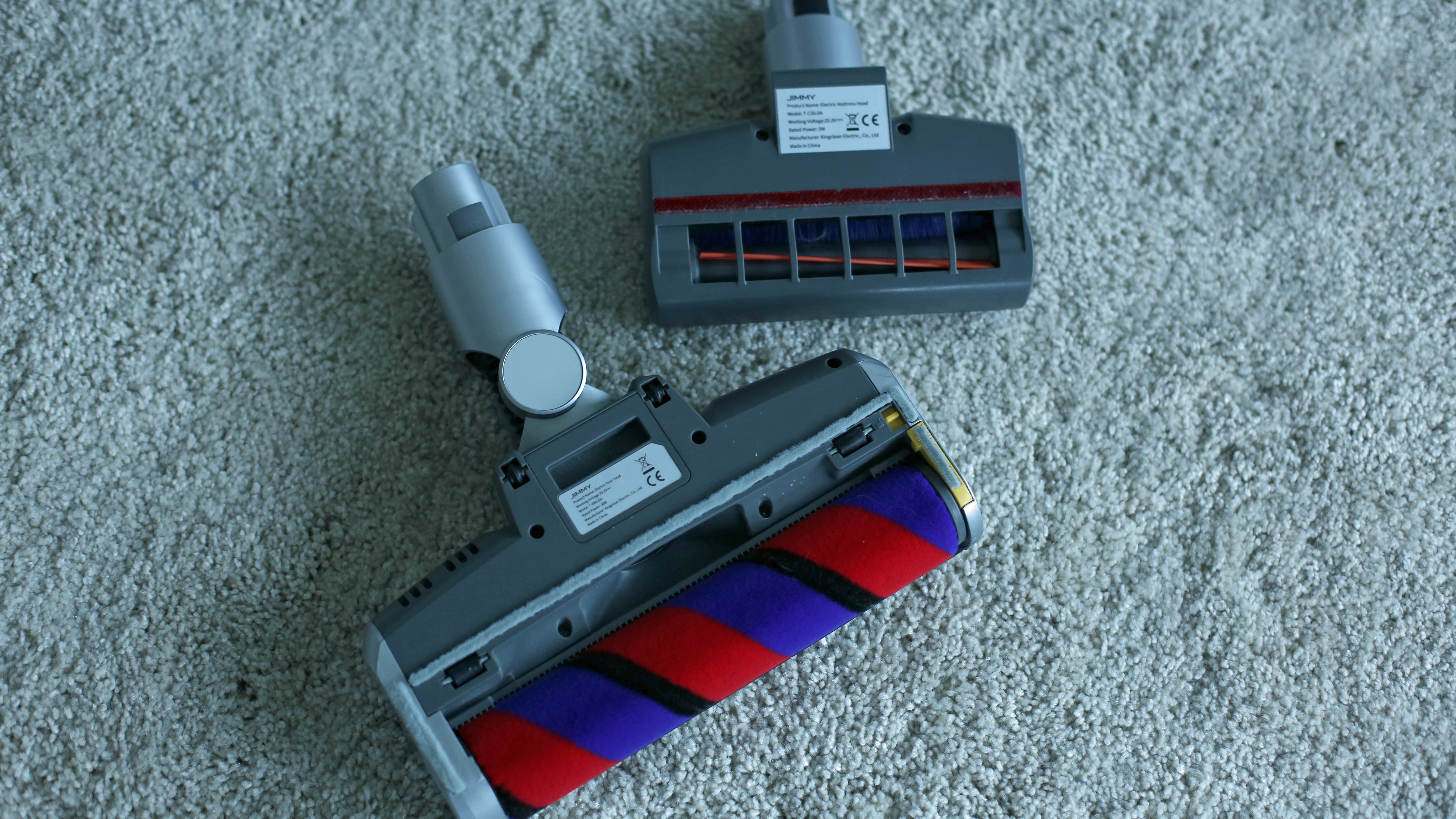 Der Roborock leistet hier mit Abstand die beste Arbeit. Er bietet sowohl die Saugleistung, als auch die passende Bürstenform, um Tierhaare mit einer oder spätestens zwei Saugbewegungen direkt aufzunehmen. Daher enttäuscht uns ein anderes Ergebnis: Auf etwas längerfloorigem Teppich (etwa 1 oder 1,5 Zentimeter) kam die mit 50 Watt angegebene Motorbürste mit ihren kurzen, harten Borsten in unserem Test an ihre Grenzen und stoppte immer wieder. Erst Ein- und Ausschalten aktivierte sie dann wieder. Die ähnlich, wenn auch mit weicheren Borsten ausgestattete, aber nur 15 Watt starke Motorbürste des billigen Deerma-Modells hatte hier genau wie der Jimmy keine Probleme. Die kleinere zweite Motorbüste des H6 mit längeren und weicheren Borsten hatte damit ebenfalls nicht zu kämpfen.