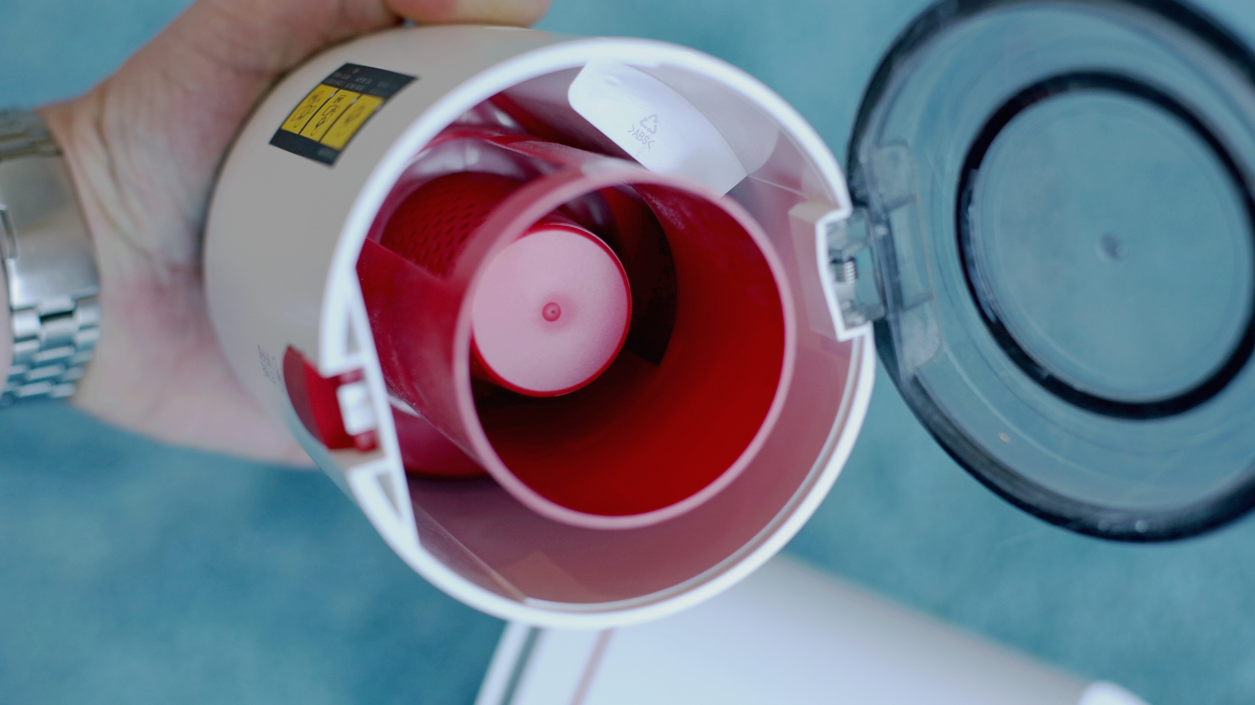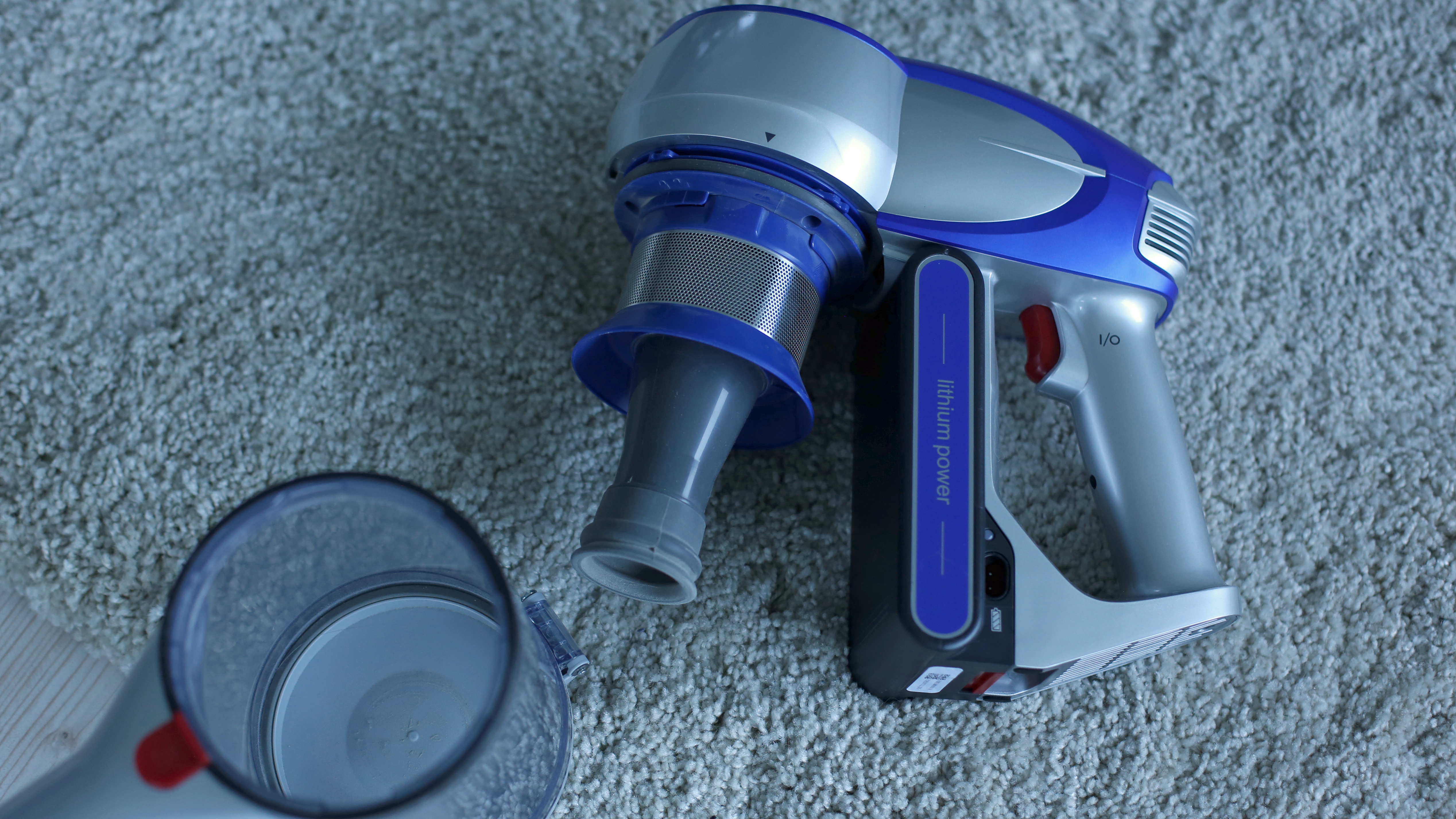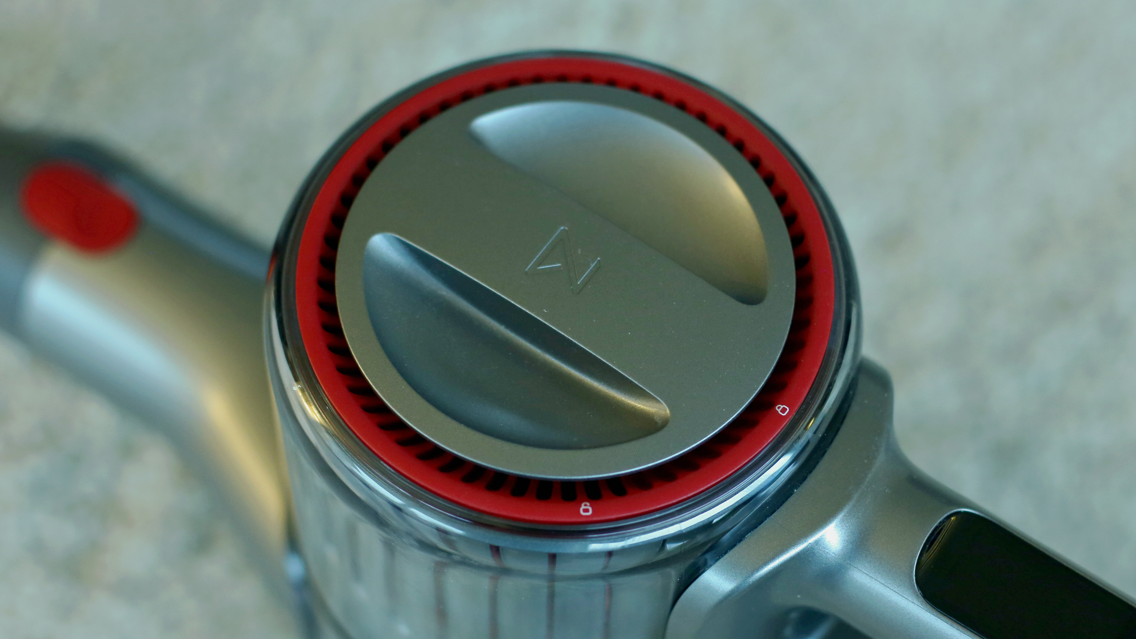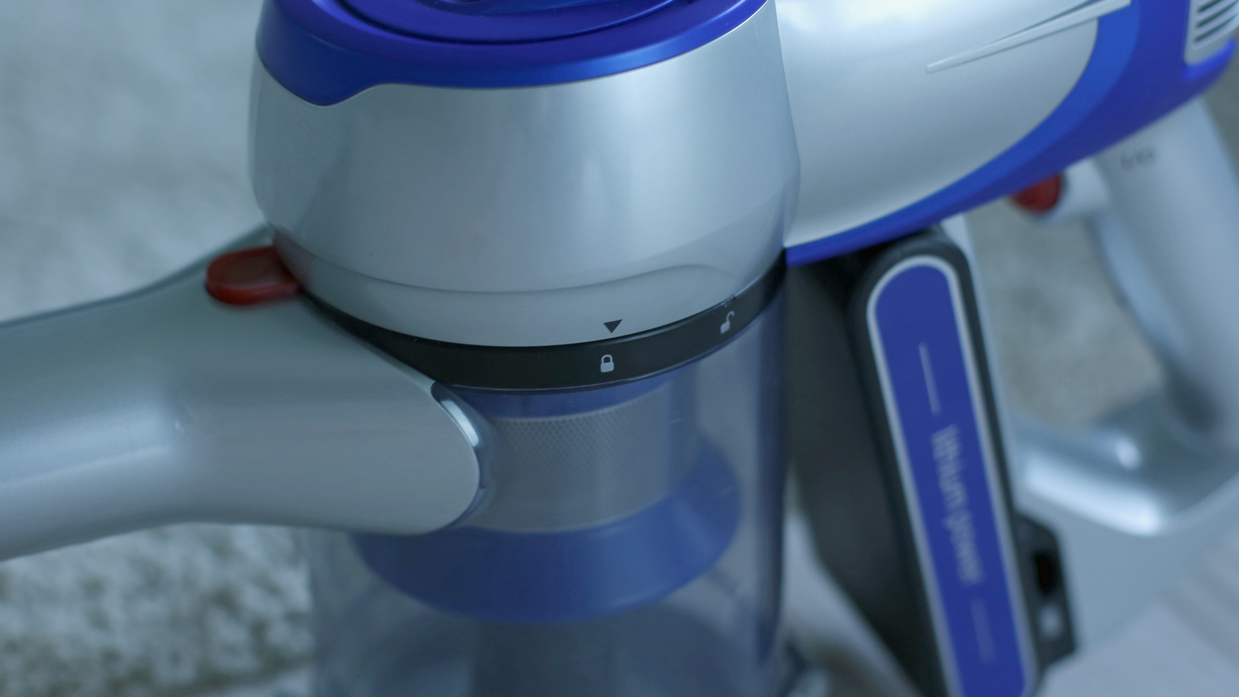 Beim Jimmy JC83 geht das alles mit deutlich weniger Kraftaufwand vonstatten, allerdings sind Schmutzbehälter, Akku (sofern er nicht extra abgenommen wird) und Motor eine Einheit. Mit einem leichten Zug lässt sich der Staubfilter nach oben entnehmen, ein Druck auf den Entriegelungsknopf und eine leichte Teildrehung nach rechts trennt den durchsichtigen Schmutzbehälter vom restlichen Korpus. Anschließend entfernt eine erneute leichte Drehung den Grobfilter mit Metallsieb, dessen Innenleben nur gesteckt ist. Die eigentliche Entleerung des Schmutzbehälters erfolgt unter Zuhilfenahme der Schwerkraft durch einfache Öffnung des Behälters nach unten.