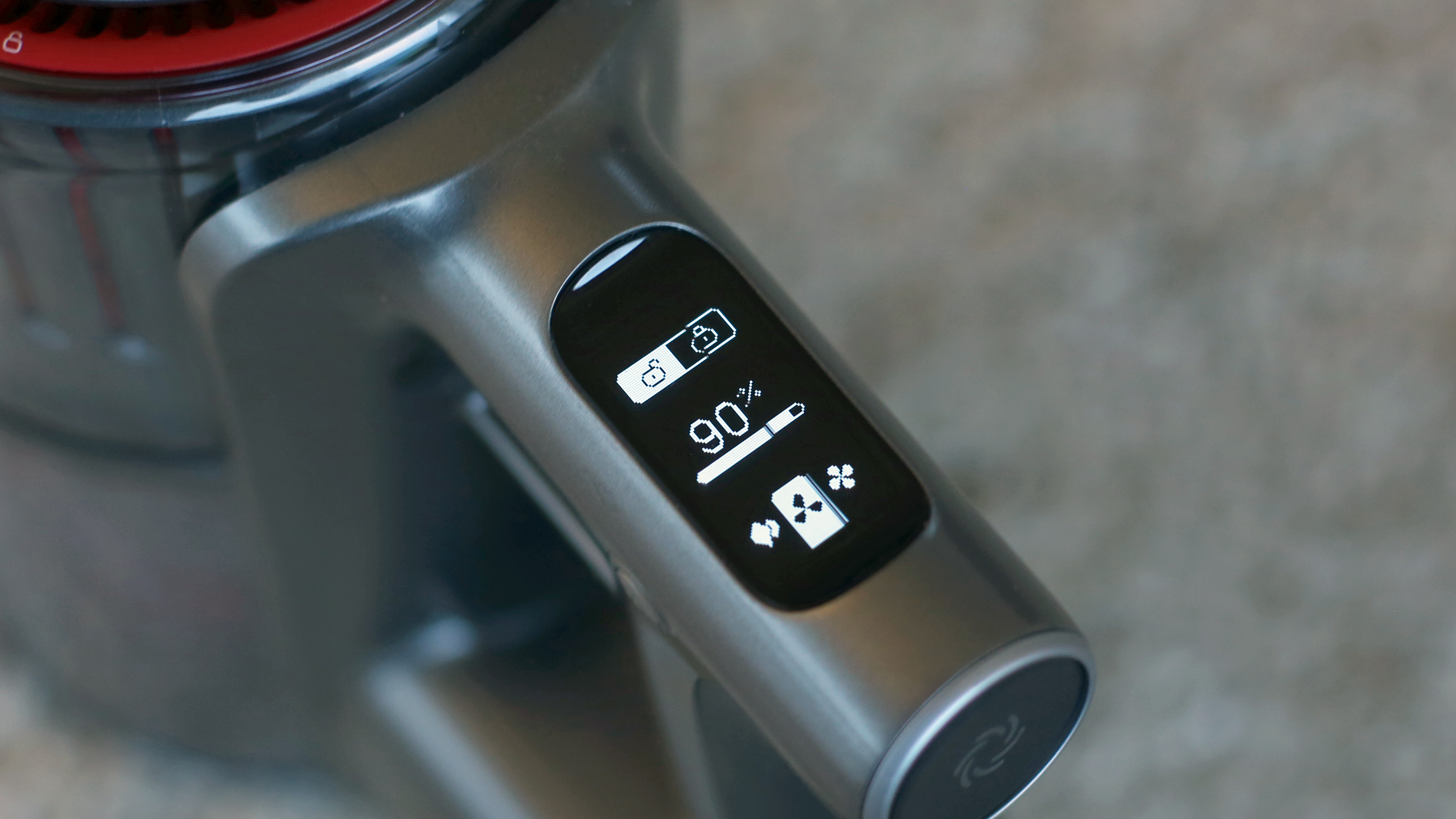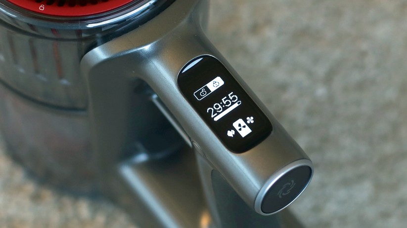 Auch bei der Darstellung der verschiedenen Saugzustände wählt Roborock einen anderen Weg als der Rest. Beim günstigen Deerma-Sauger erkennt der Nutzer die anhand der Stellung eines einfachen Schiebeschalters, beim Jimmy JC83 erkennt er sie nur am Motorgeräusch. Roborock baut hingegen in den H6 ein kleines OLED-Display ein. Darauf stellt der Hersteller gut sichtbar die eingestellte Saugstufe, den Ladezustand des Akkus in Prozent und den Zustand der Daueraktivierungstaste an. Auch Wartungshinweise tauchen hier auf. Die Prozentanzeige wechselt nach kurzer Zeit um und zeigt dann die verbleibenden Minuten Restlaufzeit im jeweiligen Saugmodus. Im Test zeigte sich diese Anzeige als ziemlich verlässlich.