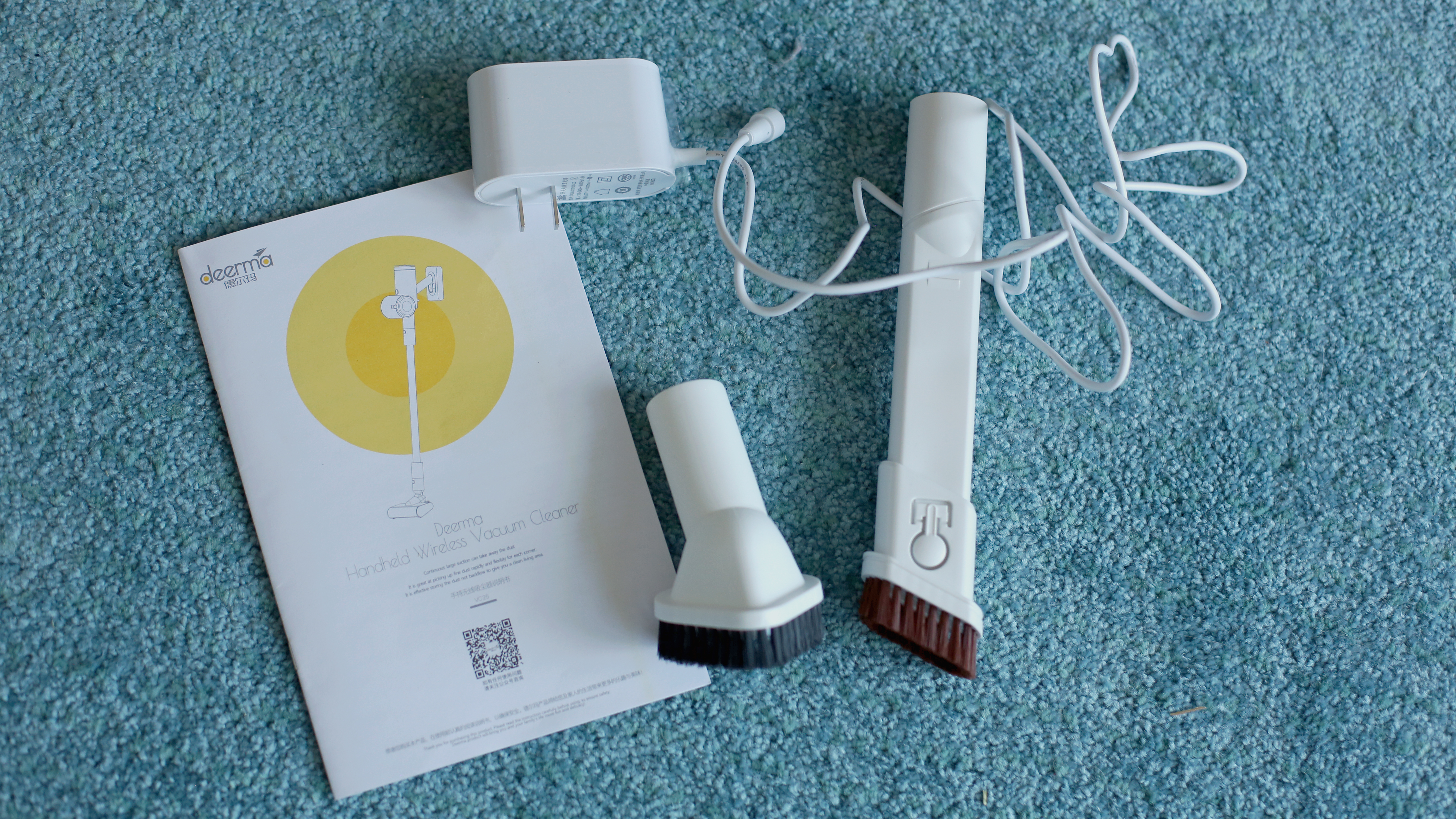 Beim Lieferumfang patzt Deerma. Das beginnt damit, dass dem Deerma VC25 ein ausschließlich auf Chinesisch geschriebenes Mini-Handbuch beiliegt, die komplette Beschriftung auf dem Gerät ebenfalls chinesisch ist, der Sauger abgesehen von dem Haupt-Motorbürstenkopf nur mit zwei einfache Bürstenaufsätze zum Kunden kommt und kein deutscher Netzstecker im Lieferumfang ist. Einen weiteren Motorbürstenkopf gibt es nicht, auch eine Wandhalterung, um Zubehör und Sauger bequem Laden und aufbewahren zu können, fehlt.