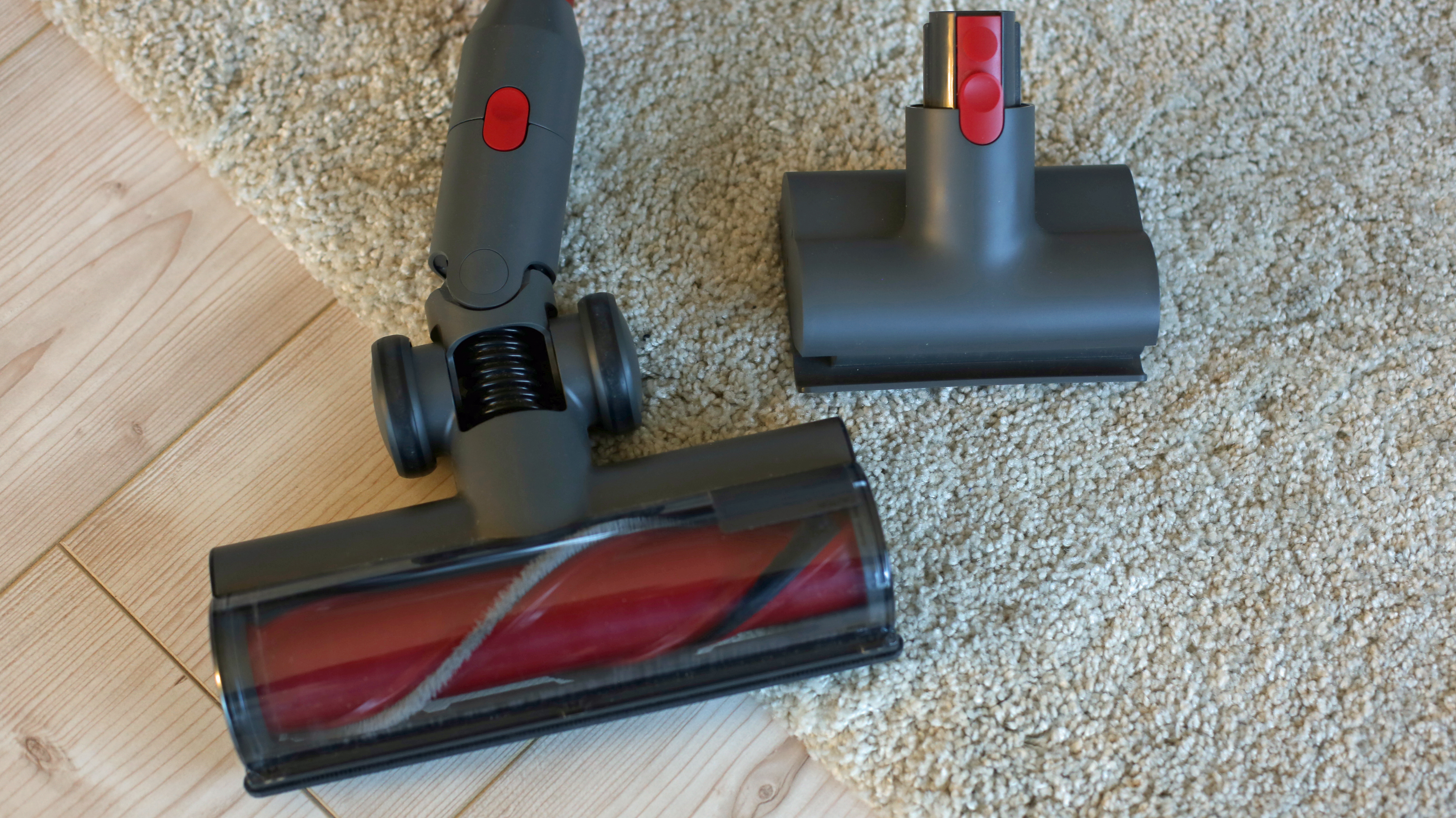 Starke Unterschiede gibt es bei Teppich und der Königsdisziplin: Tierhaare auf Teppich. Bauart-bedingt schafft es der Jimmy JV83 nur, oberflächlichen Schmutz wie Flusen vom Teppich zu entfernen. Leichter, feiner Sand dürfte zum Teil zumindest in der höchsten Saugstufe auch aus dem Inneren kurzflooriger Auslegeware entfernt werden, zu viele Hoffnungen sollte man sich dahingehend aber generell bei Akkusaugern nicht machen. Deerma VC25 und Roborock H6 schaffen durch ihre Bürstenform zumindest theoretisch eine deutlich bessere Tiefenreinigung. Bei Tierhaaren, die auf kurzfloorigem Teppich gern anhaften und daher von der Filzbürste des Jimmy JV83 kaum aufgenommen werden können, leistet der H6 mit Abstand die beste Arbeit. Er entfernt sie mit den unterschiedlich harten Borsten meist schon beim ersten Saugdurchgang und zieht sie dank der sehr zuverlässig agierenden automatischen Saugkrafterhöhung auf Teppich in den Schmutzbehälter. Der Deerma VC25 bietet deutlich weichere Borsten und zudem Gummilamellen – damit bekommt er längere Tierhaare nicht so gut zu fassen. Mit einer schmalen Lippe aus Stoff wie bei manchen Fusselbürsten, die sich unten auf dem Bürstengehäuseboden befindet, werden die Tierhaare dann zwar teilweise auch von der Teppichoberfläche gelöst, beim Zurückziehen und dem folgenden erneuten Richtungswechsel aber in Form kleiner Fellwülste auf dem Teppich liegengelassen. Der Nutzer muss dann den Sauger so anheben und positionieren, dass die Bürste diese Wülste direkt aufnehmen kann – umständlich und zeitraubend. Die zweite Motorbürste des Jimmy mit Borsten lieferte in diesem Vergleich bei Tierhaaren auf Polster oder Teppich das zweitbeste Ergebnis – schade, dass sie deutlich schmaler als die Hauptbürste des JV83 ist.