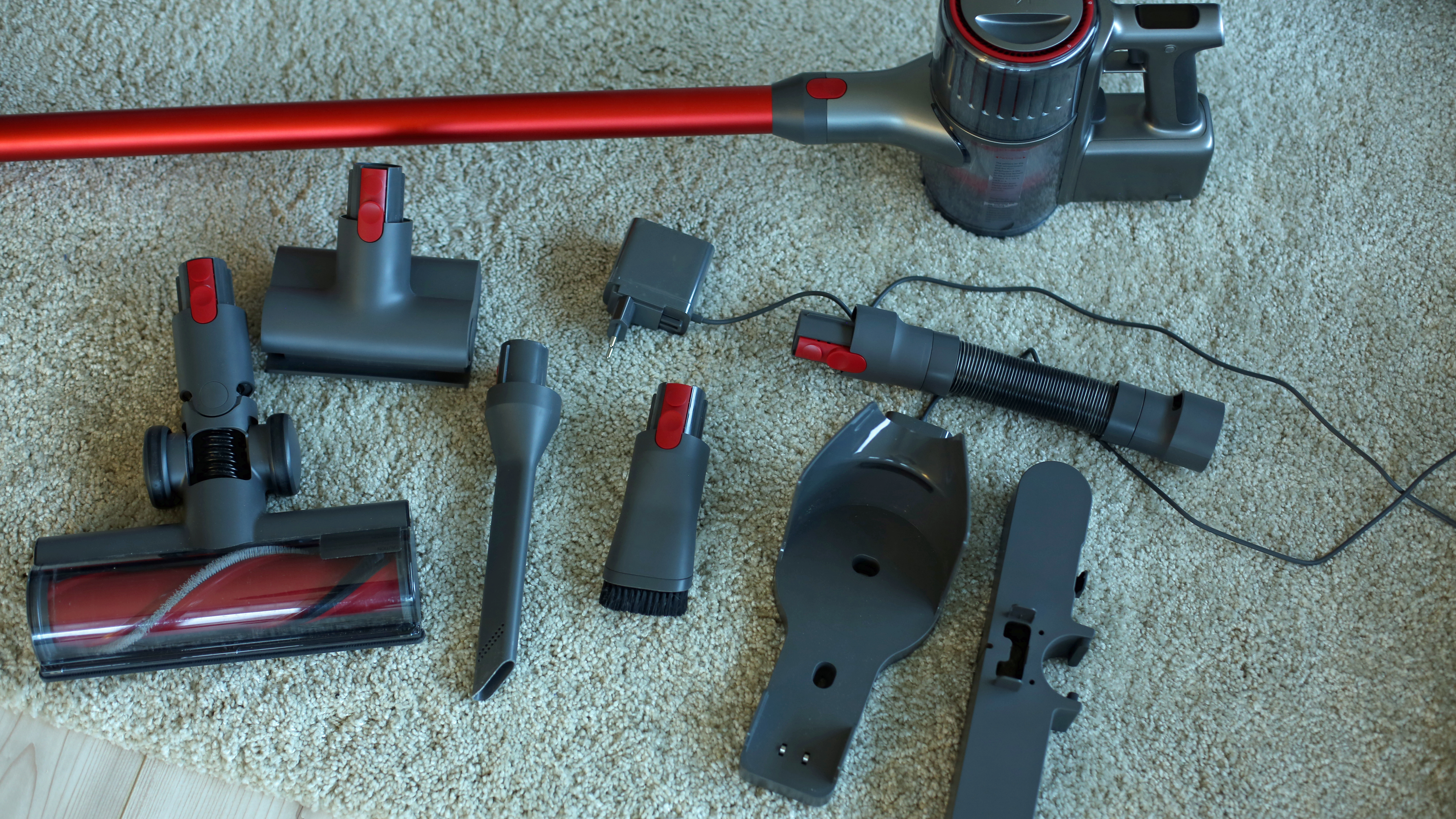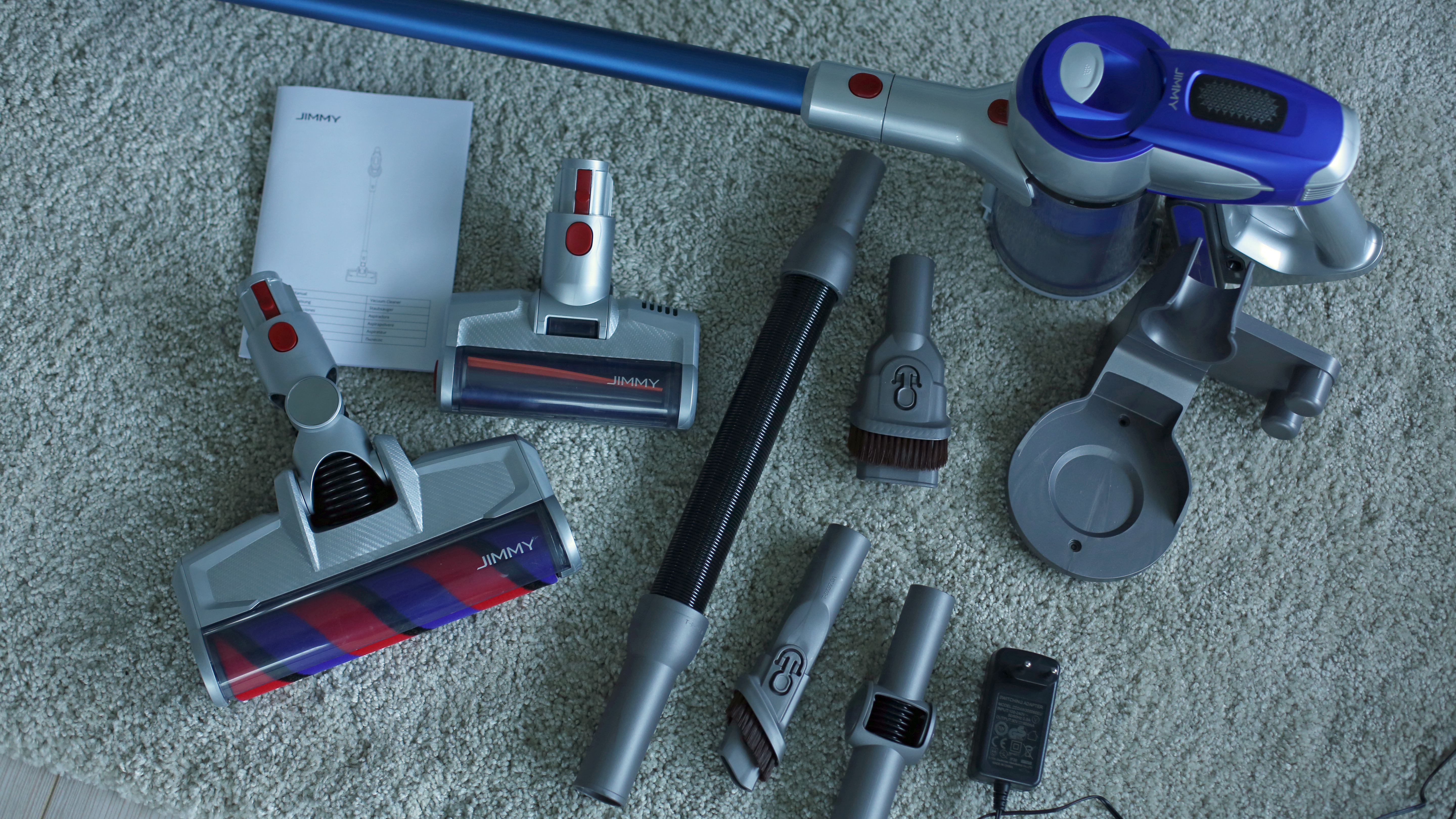Der Jimmy JV83 macht das schon deutlich besser. Er kommt mit mehrsprachiger Anleitung, darunter auch Deutsch. Das liest sich zwar zum Teil sehr hölzern und erinnert an eine Google-Translate-Übersetzung, ist aber meist trotz teils grober Schnitzer (warum man den Sauger mit einer Grundgebühr statt an der beiliegenden Wandhalterung aufbewahren soll, bleibt uns verborgen…) verständlich. Zudem bietet das Modell mit drei zusätzlichen Bürsten, einem zusätzlichen Motorbürstenkopf, Knickgelenk, flexiblem Verlängerungsschlauch und einem Ladegerät für deutsche Steckdosen den deutlich vertrauenerweckenderen und umfangreicheren Lieferumfang. Bei der Wandhalterung handelt es sich nur um eine reine Halterung, zum Laden muss der Sauger jedes Mal manuell angestöpselt werden.