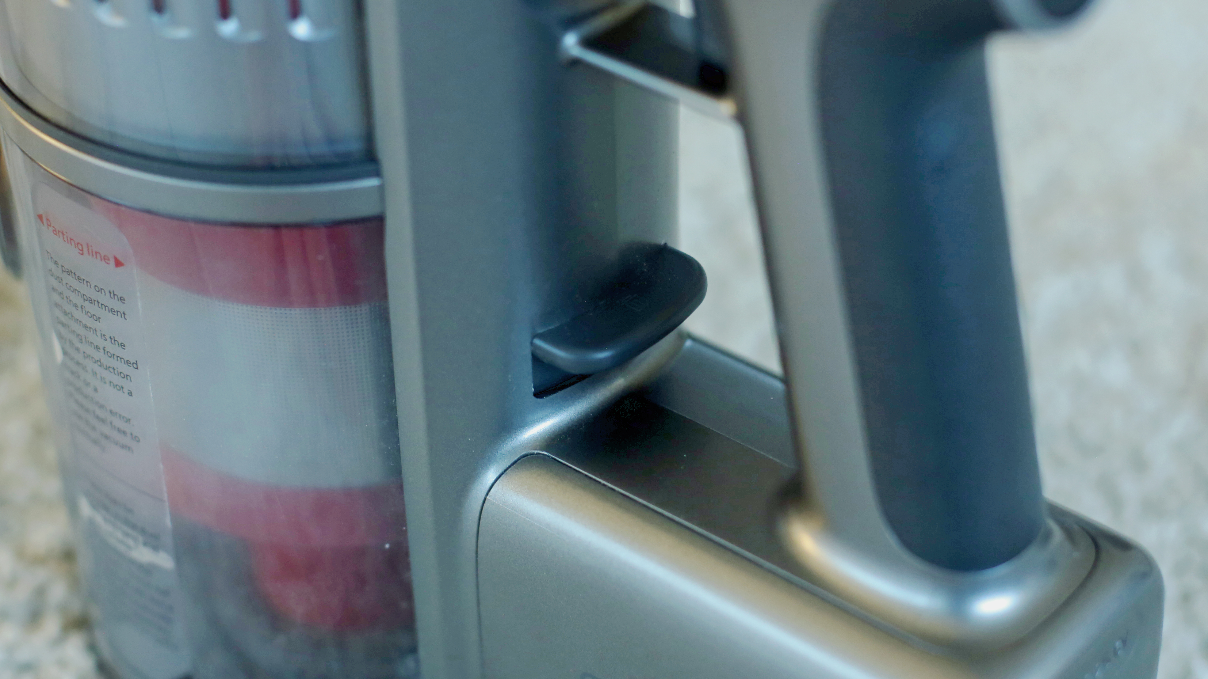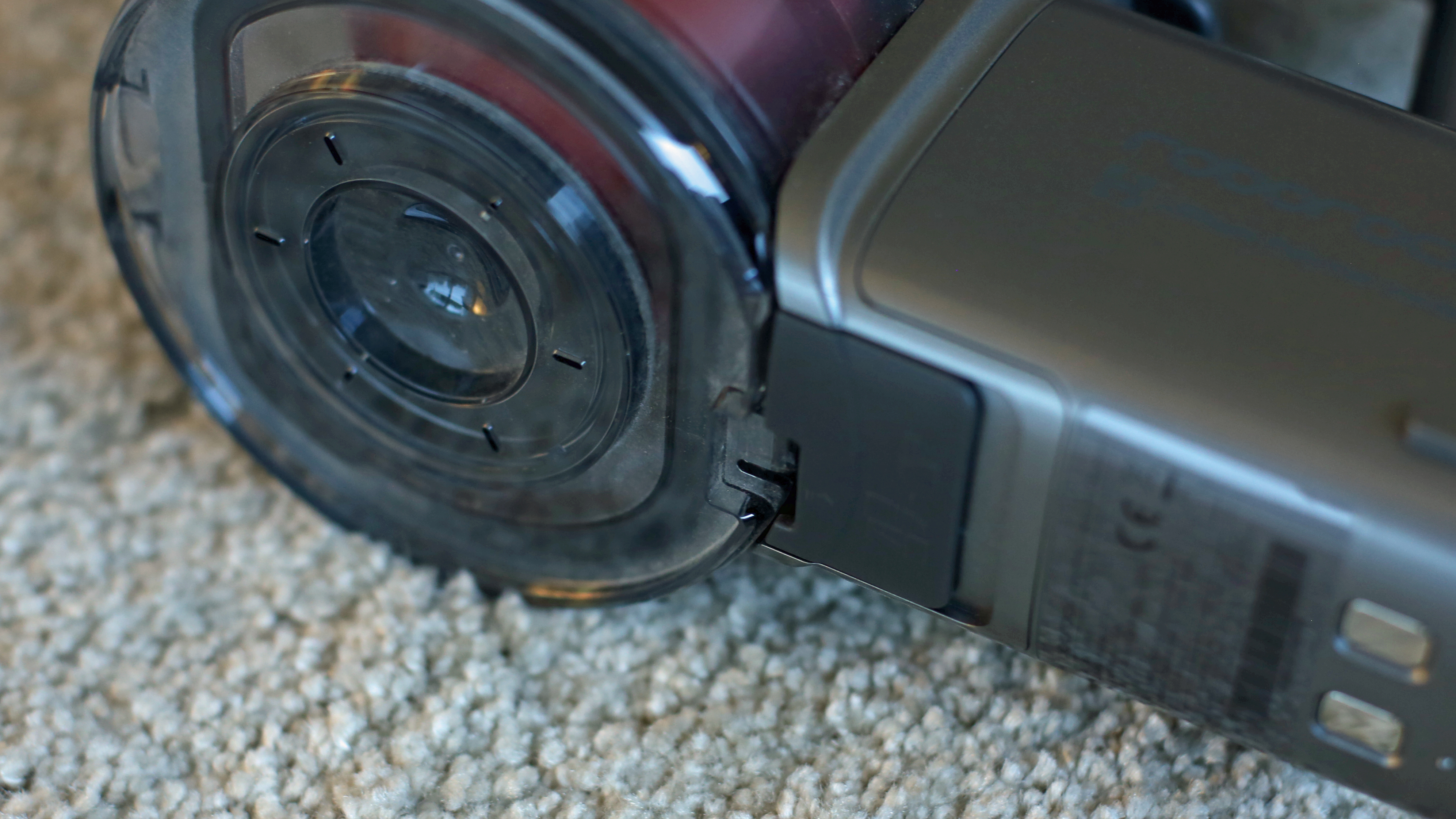 Richtig leicht geht das beim günstigsten Modell. Denn wie bereits angedeutet befindet sich der Schmutzfangbehälter oben auf dem Sauger und er lässt sich mit nur einem Klick auf eine Entriegelungstaste komplett abnehmen. Ein Vorteil ist dabei die geringste Größe des Behälters der Modelle im Test. Der Hersteller gibt ihn mit 700 Milliliter an, bei den anderen Saugern dürfte das in Richtung 900 oder 1000 Milliliter gehen. Im Alltag ist der beim VC25 aber natürlich auch deutlich schneller voll als bei der Konkurrenz. Sehen kann man den Füllstand leider schlecht, denn zwar ist der seitliche Deckel durchsichtig, das Gehäuse des Behälters ansonsten aber nicht. Im Normalfall wird der Schmutz durch den bereits erwähnten per Federkraft aufschwingenden Deckel entleert, wie bei allen Modellen fallen Wollmäuse und Tierhaare aber nicht so einfach heraus. Hier muss der Nutzer mit den Fingern nachhelfen oder den Behälter ganz zerlegen. Dyson punktet bei seinen Modellen mit einer cleveren Schubvorrichtung, durch die die Finger sauber bleiben.