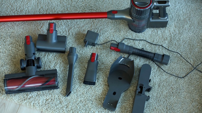 Das teuerste Modell im Vergleich, der Roborock H6, ist hier überraschend sogar etwas zurückhaltender. Er kommt zwar ebenfalls mit einem zweiten Motorbürstenkopf, allerdings zusätzlich nur mit flexiblem Schlauch, Polsterbürste und einer Fugendüse – die anderen beiden Anbieter – auch beim 75-Euro-Modell – geben letzteres zumindest als 2-in-1-Lösung bei, beim teuersten Modell im Vergleich ist das einzeln ausgeführt. Die mehrsprachige Bedienungsanleitung ist deutlich besser übersetzt, ein Ladegerät für deutsche Steckdosen sowie eine Wandbefestigungs- und Aufbewahrungsvorrichtung sind ebenfalls vorhanden. Zum Laden muss der H6 einfach nur in die Halterung gehängt werden, das Ladekabel wird zuvor einmalig mit der Halterung verbunden.