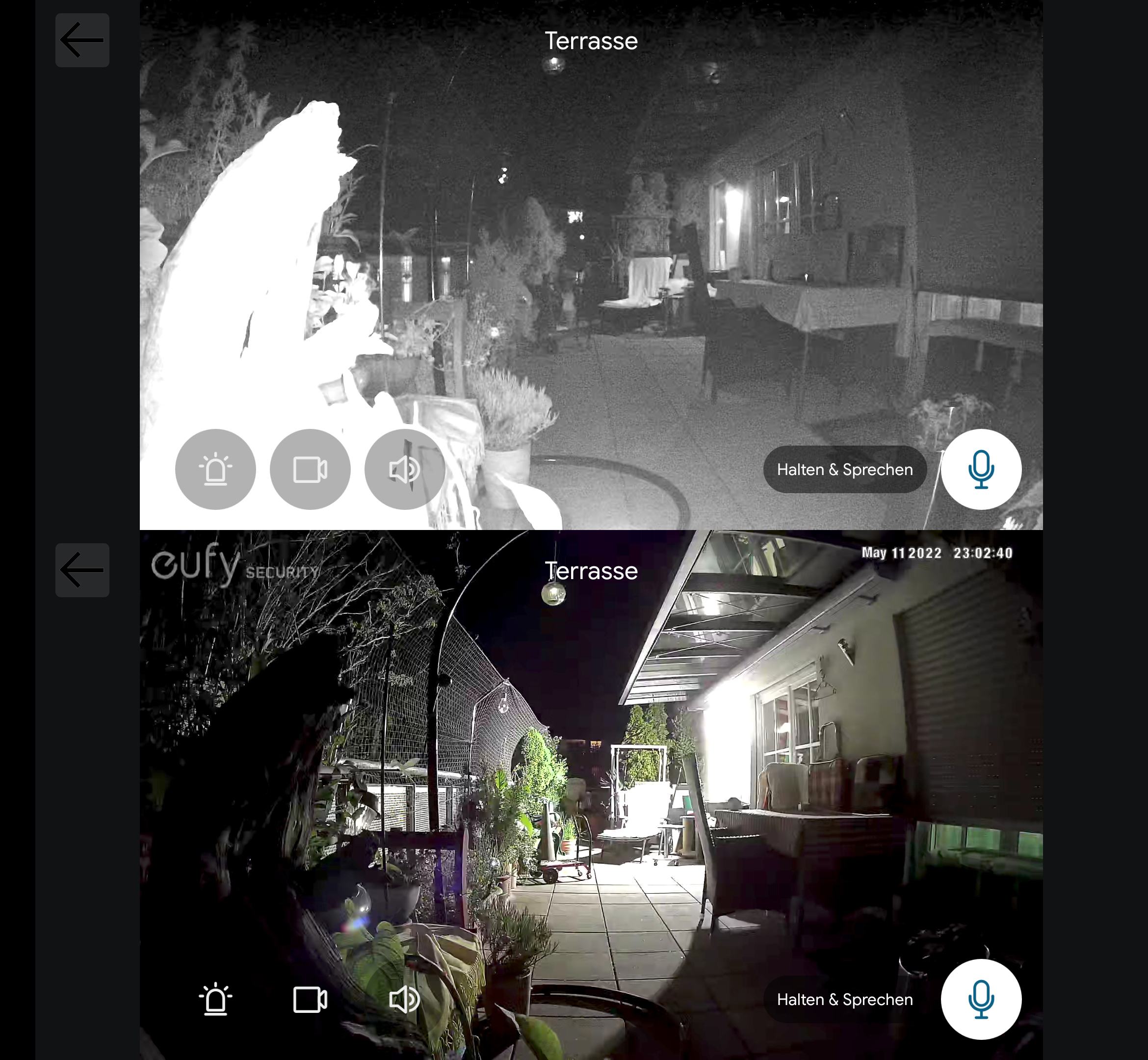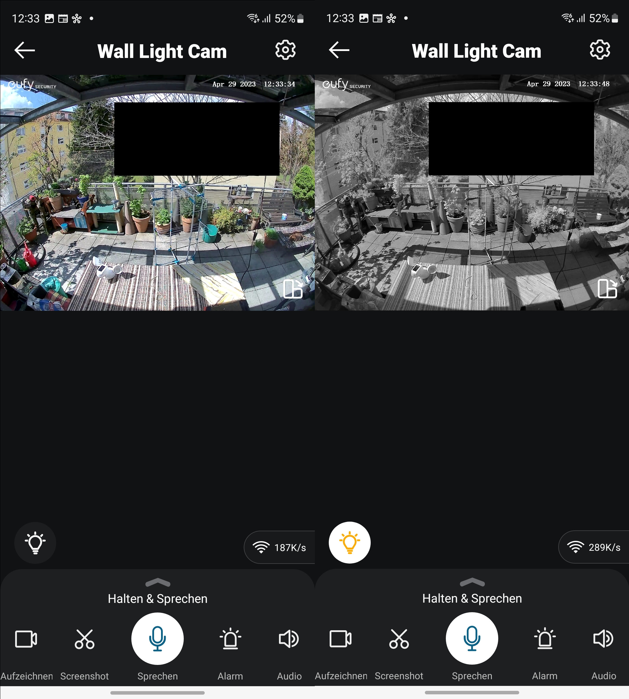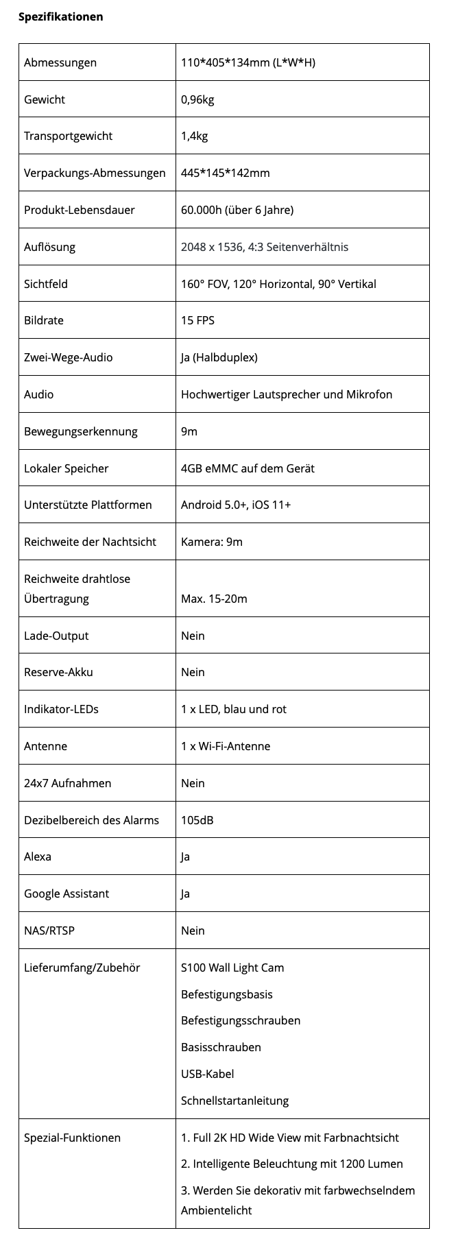Überwachungskameras, getarnt als Außenleuchten, sind die dritte Kategorie von Kameras mit integrierter Beleuchtung. Einige davon sind bereits seit Jahren auf dem Markt, etwa Abus PPIC36520 (Testbericht), Blaupunkt Wifi Lampcam (Testbericht), Bosch Eyes (Testbericht) und Netatmo Presence (Testbericht). Die Leuchtkraft dieser Varianten liegt zwischen 325 Lumen (Bosch Eyes) und 1500 Lumen (Netatmo Presence). Relativ neu ist die Ezviz LC3 (Testbericht). Sie bietet eine Auflösung von 2K und ein großes Sichtfeld mit 140° horizontal, 157° diagonal und 75° vertikal. Taufrisch ist die Eufy S100 Wired Wall Light Cam (Testbericht), die 1200 Lumen helle LEDs und eine Auflösung von 2048 × 1536 Pixel bietet. Als erste Außenleuchte mit Überwachungskamera strahlt aus den LEDs sogar farbiges Licht. Mit 170 Euro muss man dafür aber auch etwas tiefer in die Tasche greifen. Im Doppelpack ist die Eufy S100 Wired Wall allerdings gerade im Angebot: Statt 340 Euro kostet das Set nur 272 Euro – also 136 Euro pro Stück.