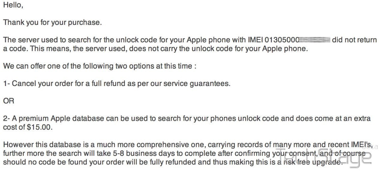 Na klar, wir wählen das günstigste Angebot und bezahlen per PayPal. Neben dem ursprünglichen Provider will der Entsperr-Dienstleister nur die Seriennummer des Smartphones wissen. Ein paar Tage kann das jetzt dauern, sagt der GSMLiberty. Okay, wird sind geduldig – und bekommen ein paar Tage später eine schlechte Nachricht: Unser iPhone wäre nicht entsperrbar, es ist in der Datenbank nicht vorhanden. Für zusätzliche 15 US-Dollar würde man aber auch noch eine Premium-Datenbank checken. Ob das ein bedauerlicher Einzelfall ist oder eine Masche, um den auf den ersten Blick günstigsten Preis hinzubekommen, wissen wir nicht. Wir zahlen.